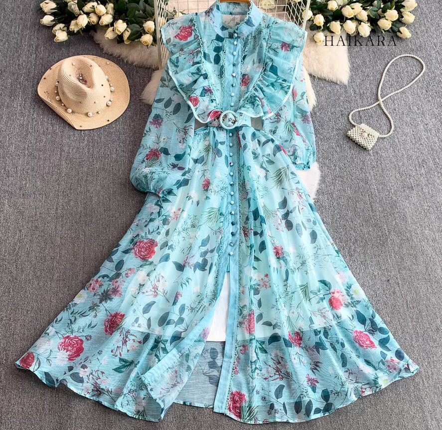 ★【 鮮やかな花柄とフリル装飾が目を引く、ロング丈のシャツワンピースです。