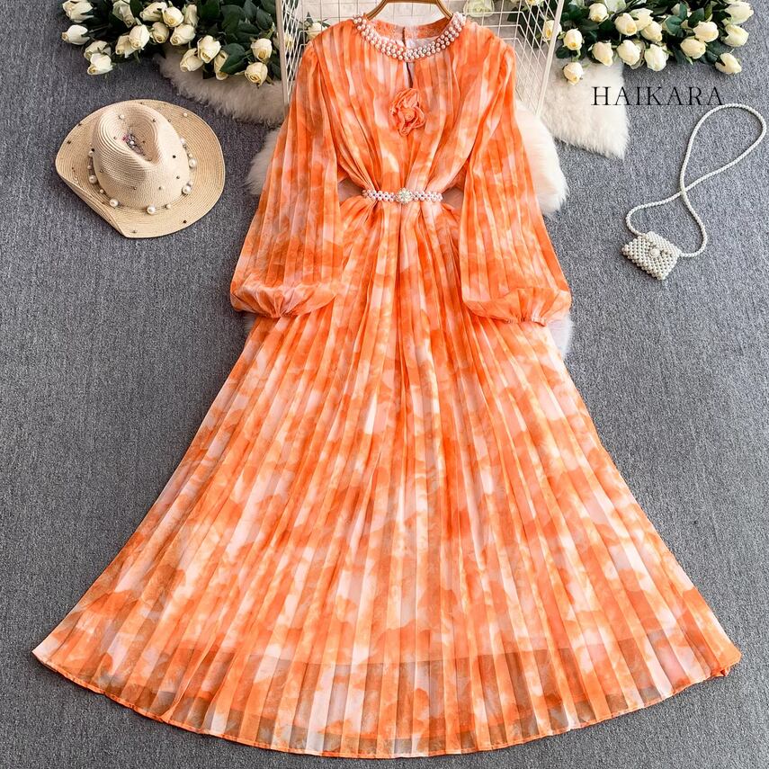 ★【 鮮やかな柄と全体に施された細やかなプリーツが特徴的な、ロング丈のワンピースです。