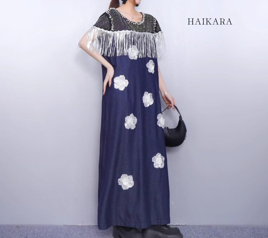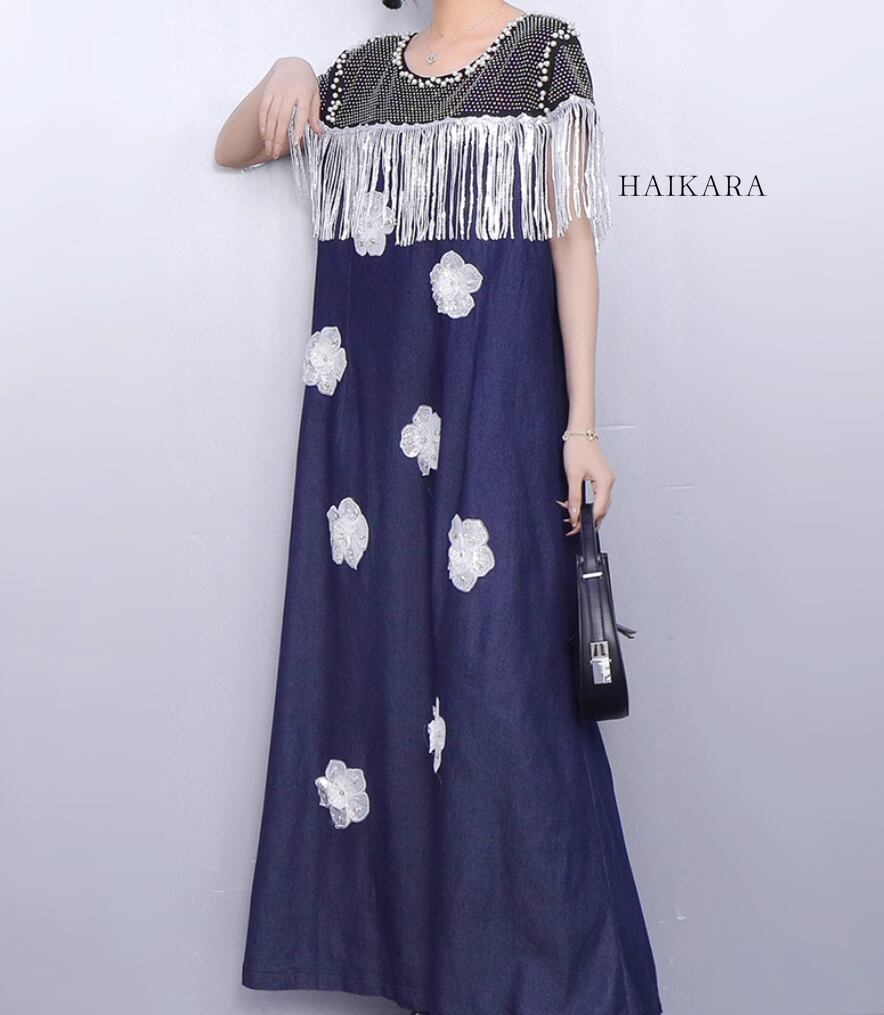 フリンジや花の装飾、ゆったりとしたスカートが、クラシカルでロマンティックな雰囲気を演出します。