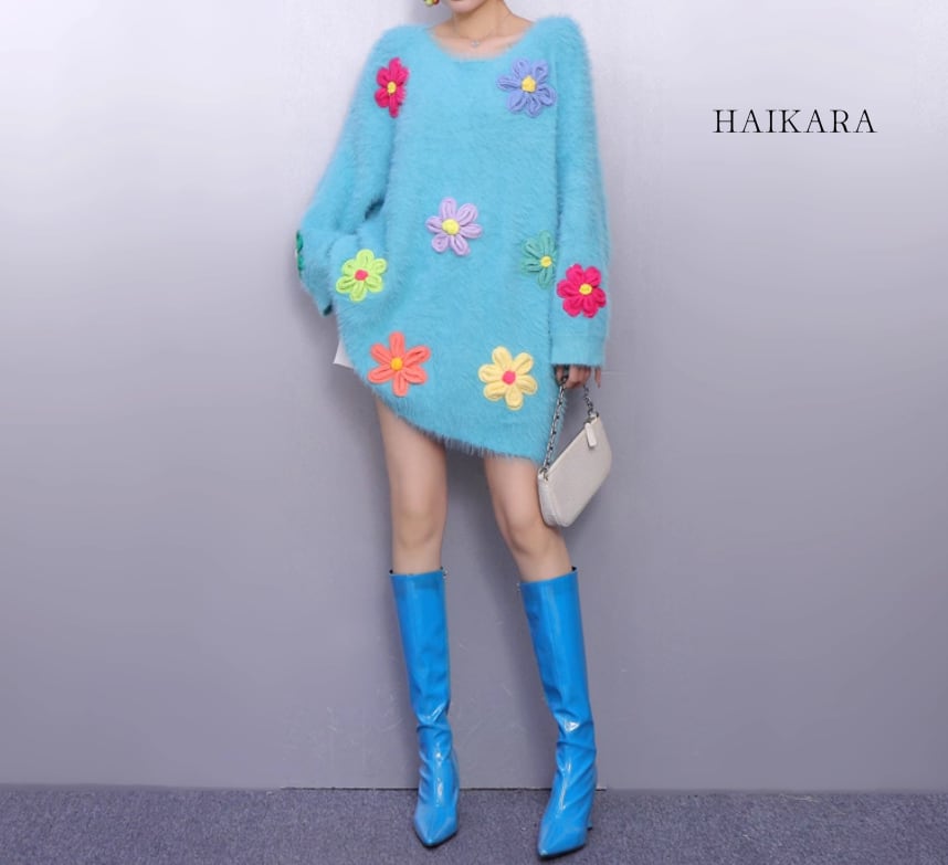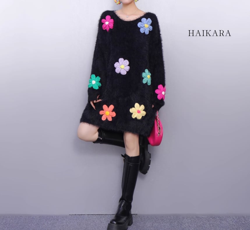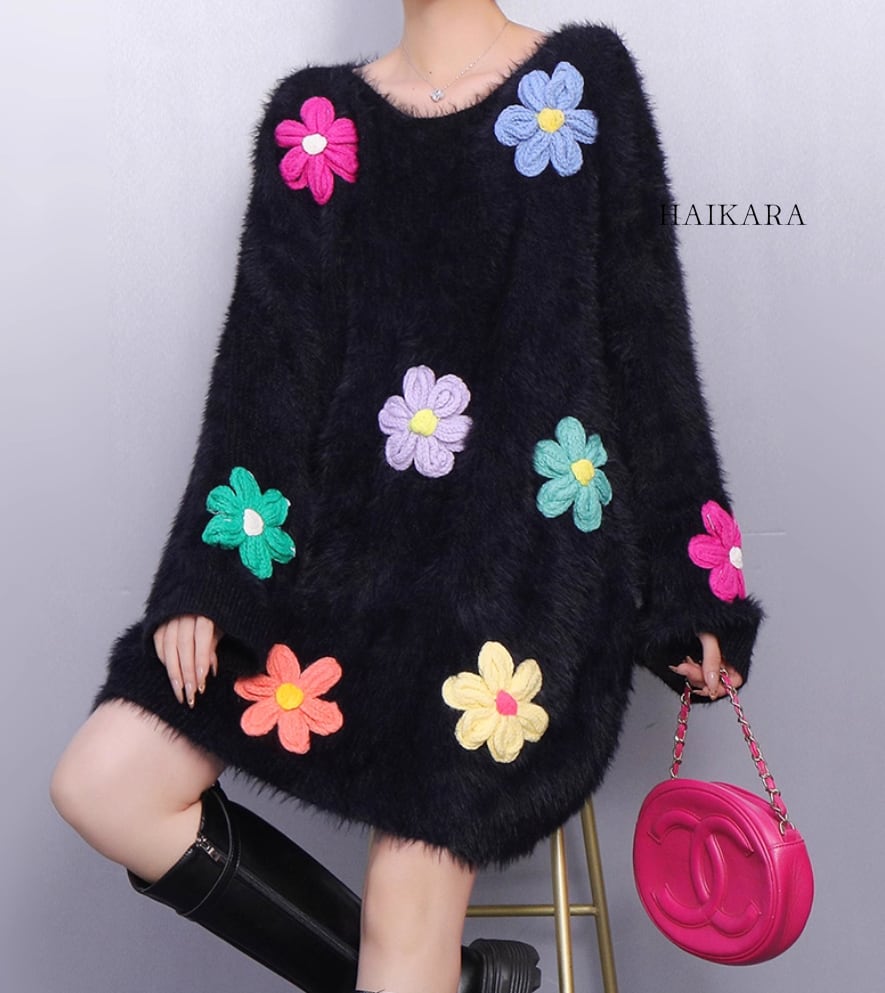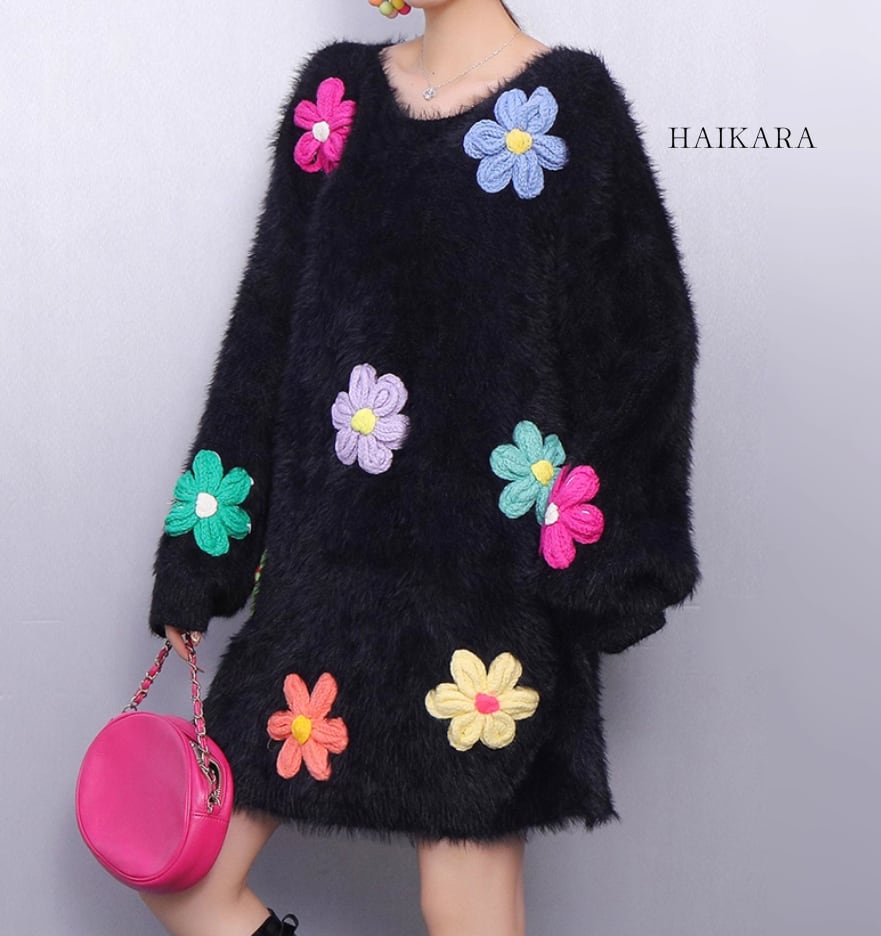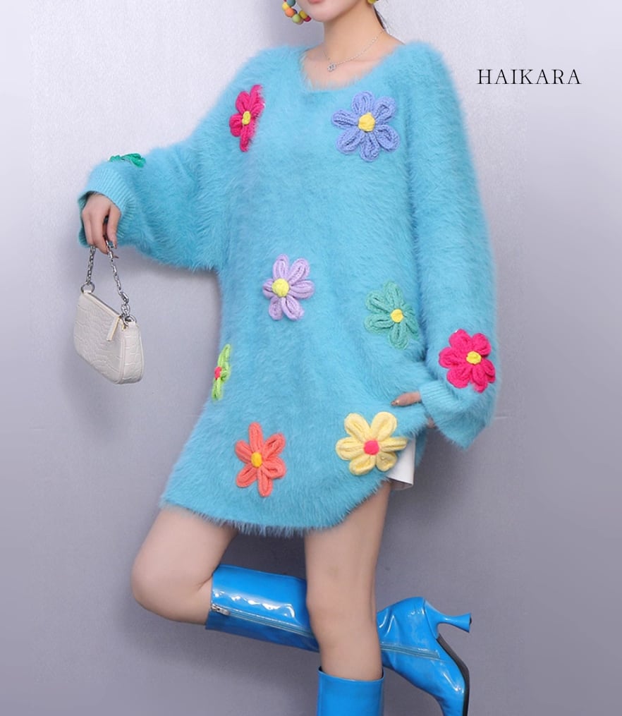 (NEW) Fluffy Knit Top/Dress with Colorful Crochet Flowers