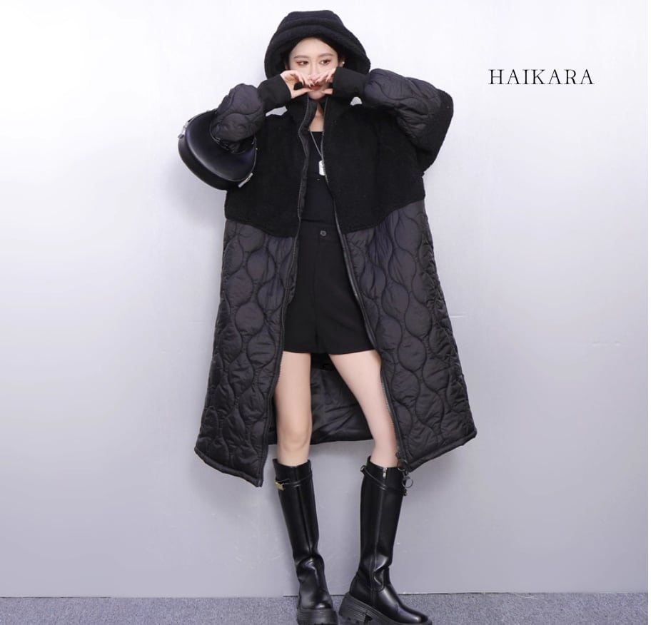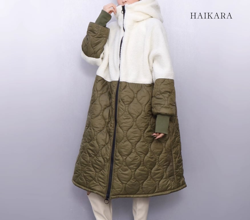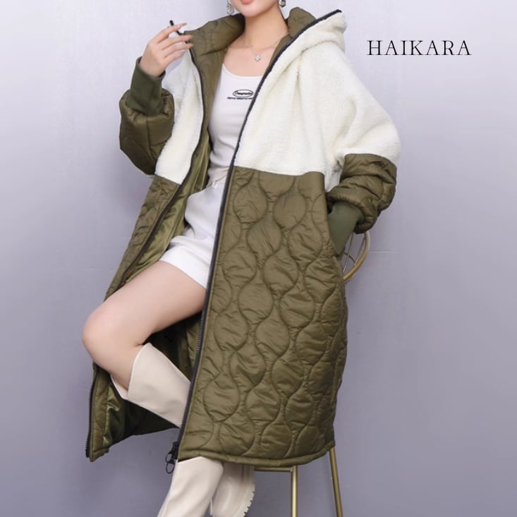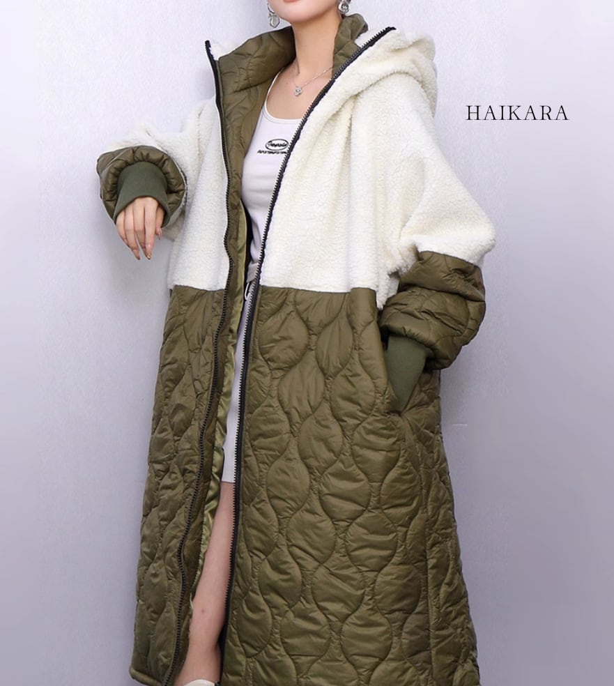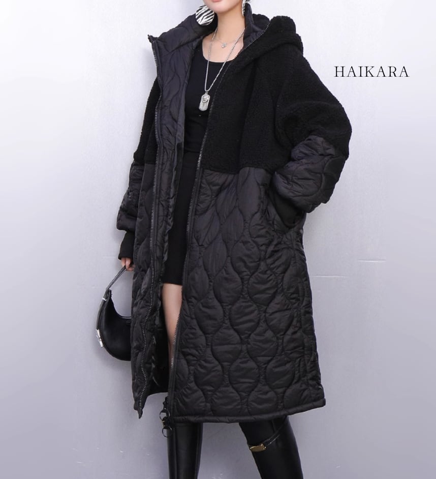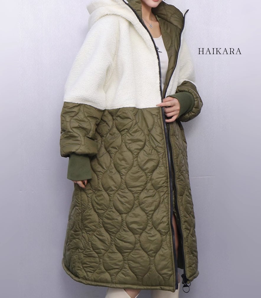 ★【 上半分にボア生地、下半分と袖にキルティング生地を切り替えたロング丈のフーディージャケットです。