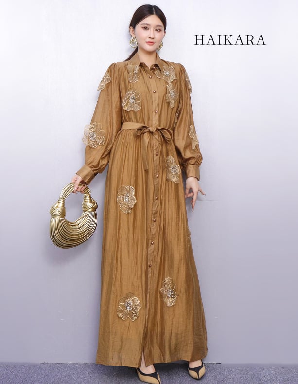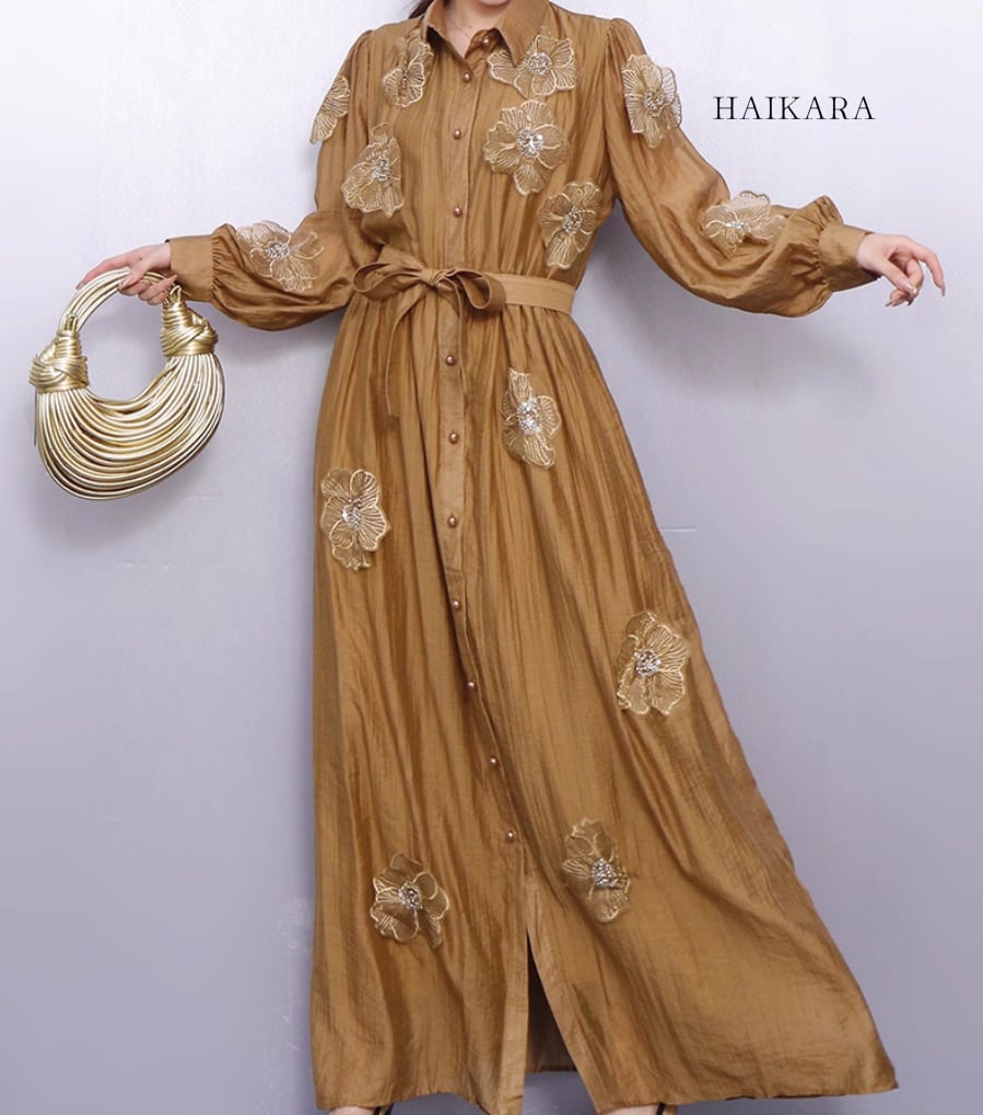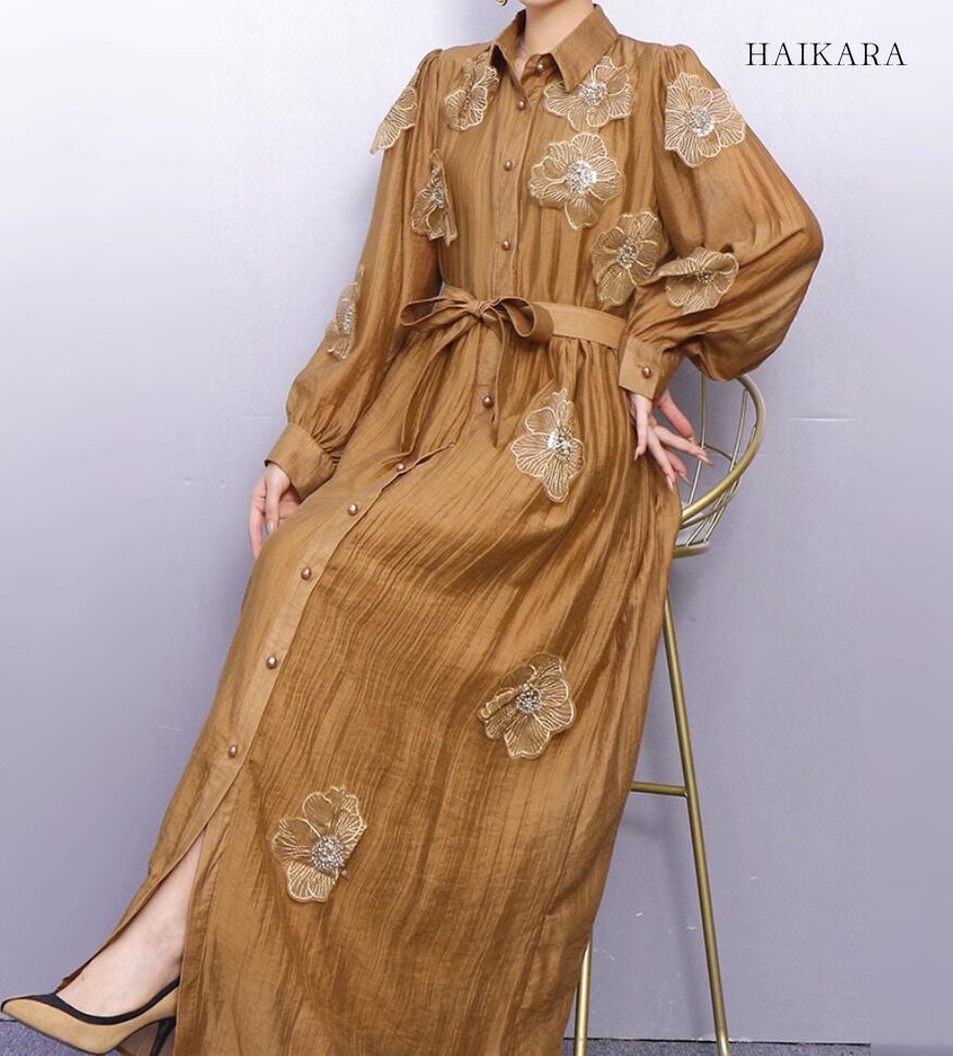 ★【 レースや刺繍のような繊細なお花のモチーフが全体に施された、ロング丈のシャツワンピースです。