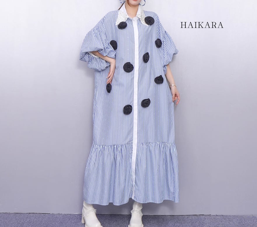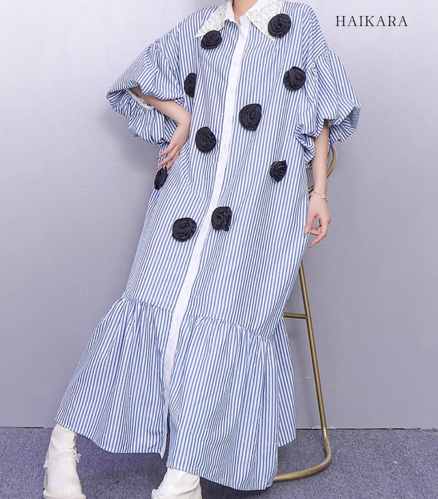 ★【 ストライプ柄の生地に、立体的なバラのモチーフをあしらったデザイン性の高いロングシャツワンピースです。