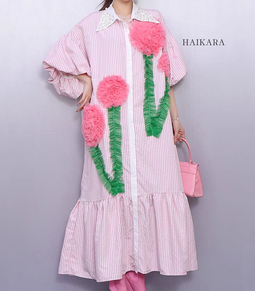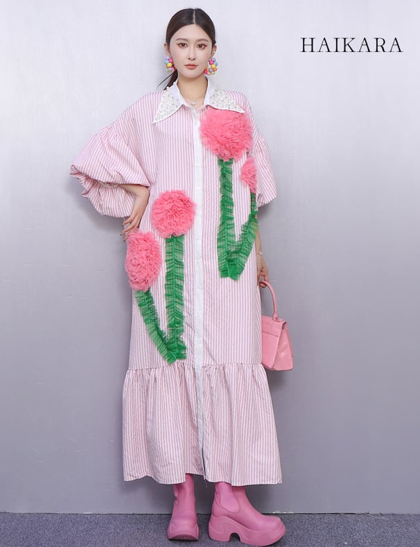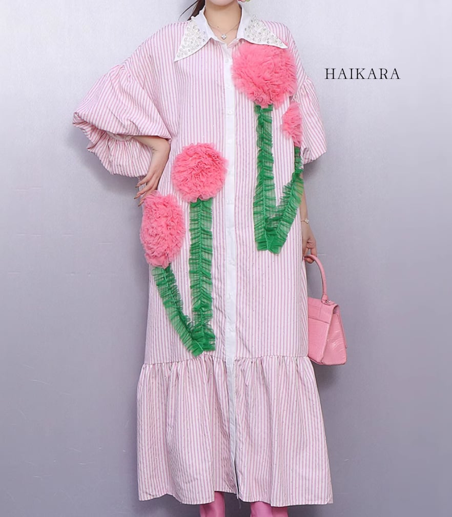 ★【 ストライプ柄のロングシャツワンピースに、チュール生地の立体的な大きな花モチーフを大胆に配置したデザインです。