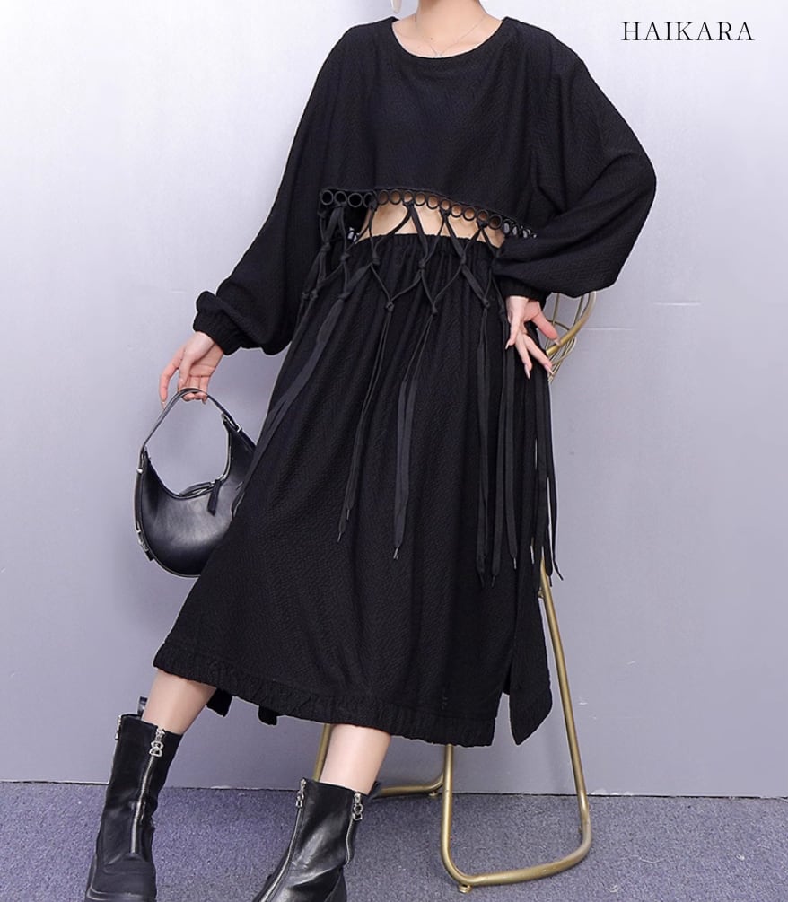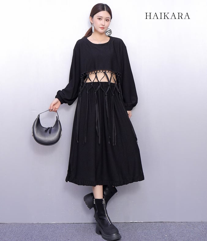 大胆なカットアウトとコルセット風のディテールに、垂れ下がる長めのリボンがモードな雰囲気を演出します。