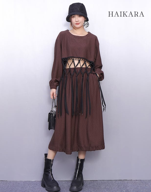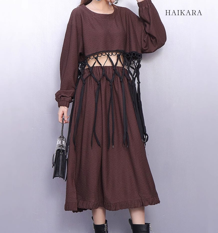 ★【 クロップド丈のトップスとロングスカートのセットアップで、ウエスト部分の編み上げデザインが個性的です。