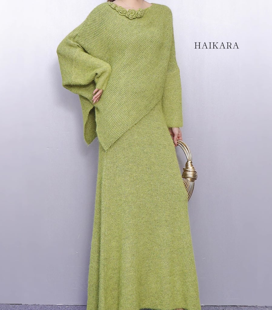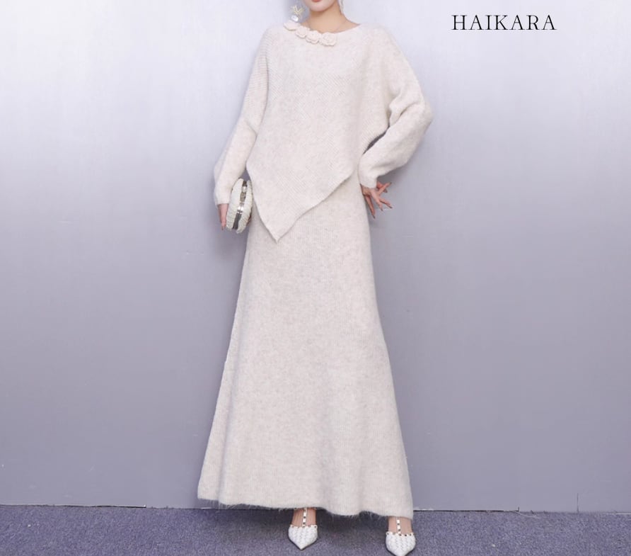 ★【 暖かく肌触りの良いニット生地を使用した、アシンメトリーなトップスとロングスカートのセットアップです。