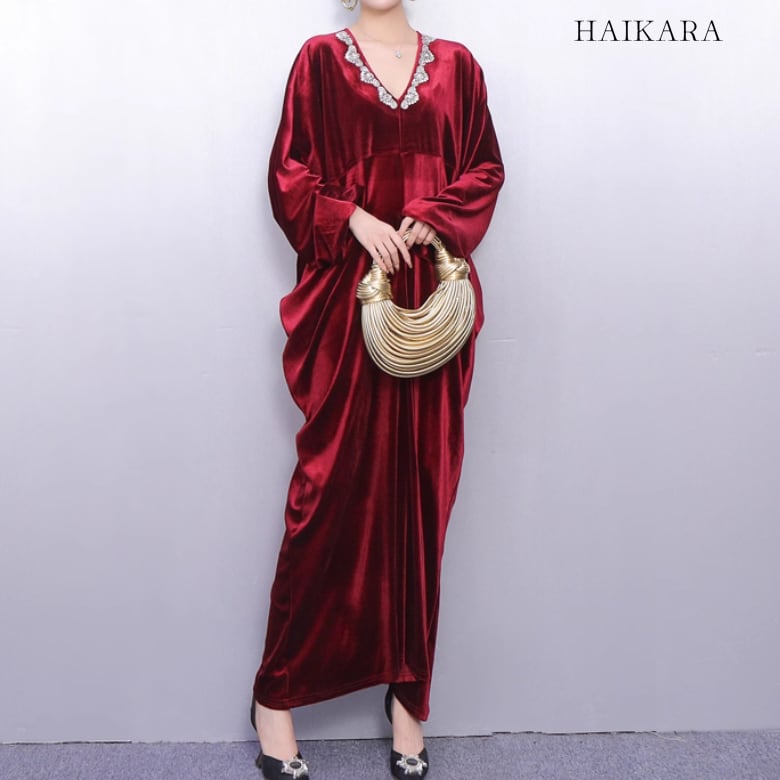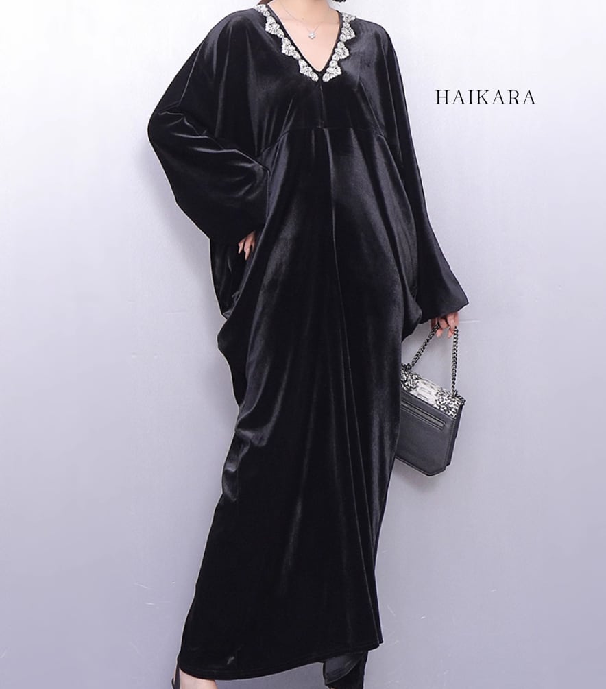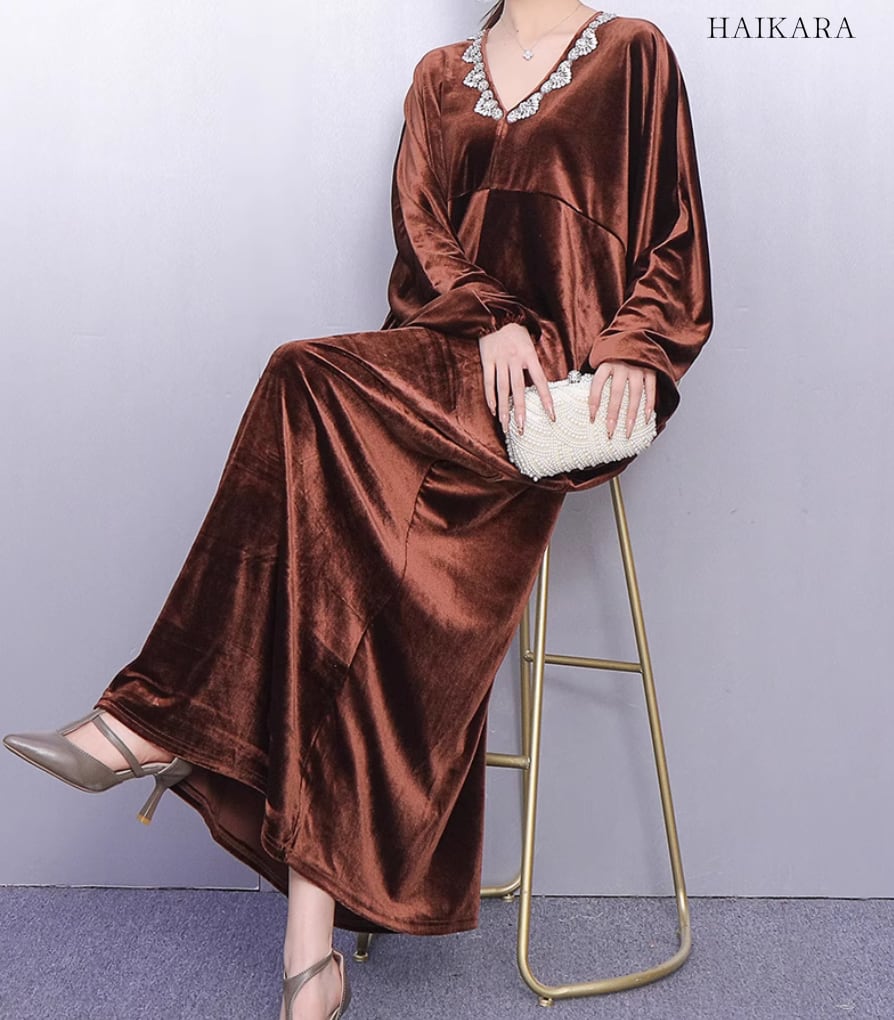 ★【 光沢感のあるベロア生地を使用した、ゆったりとしたオーバーサイズのロングワンピースです。