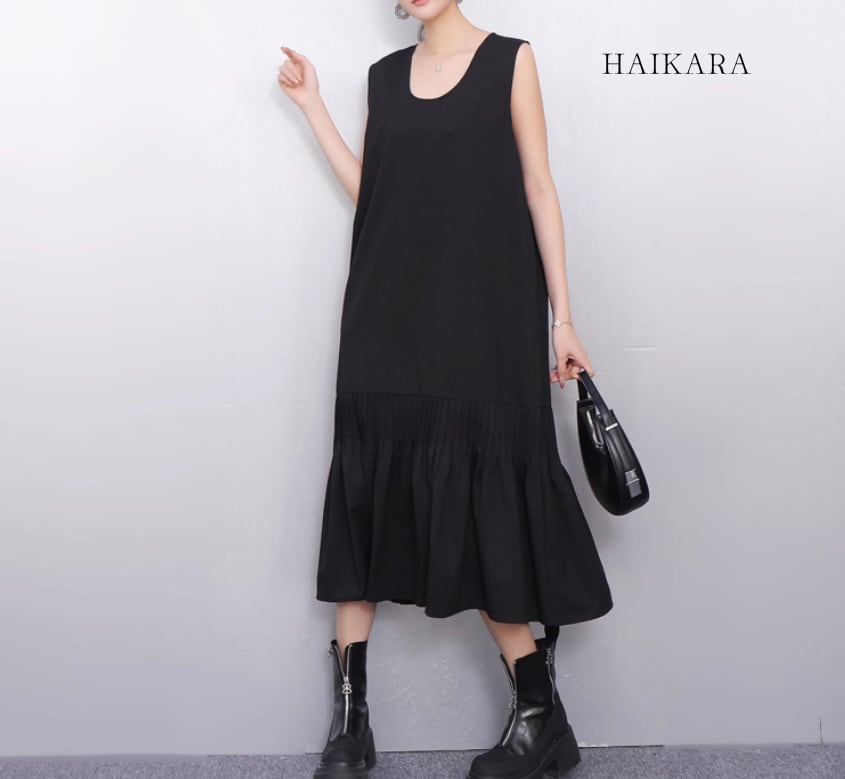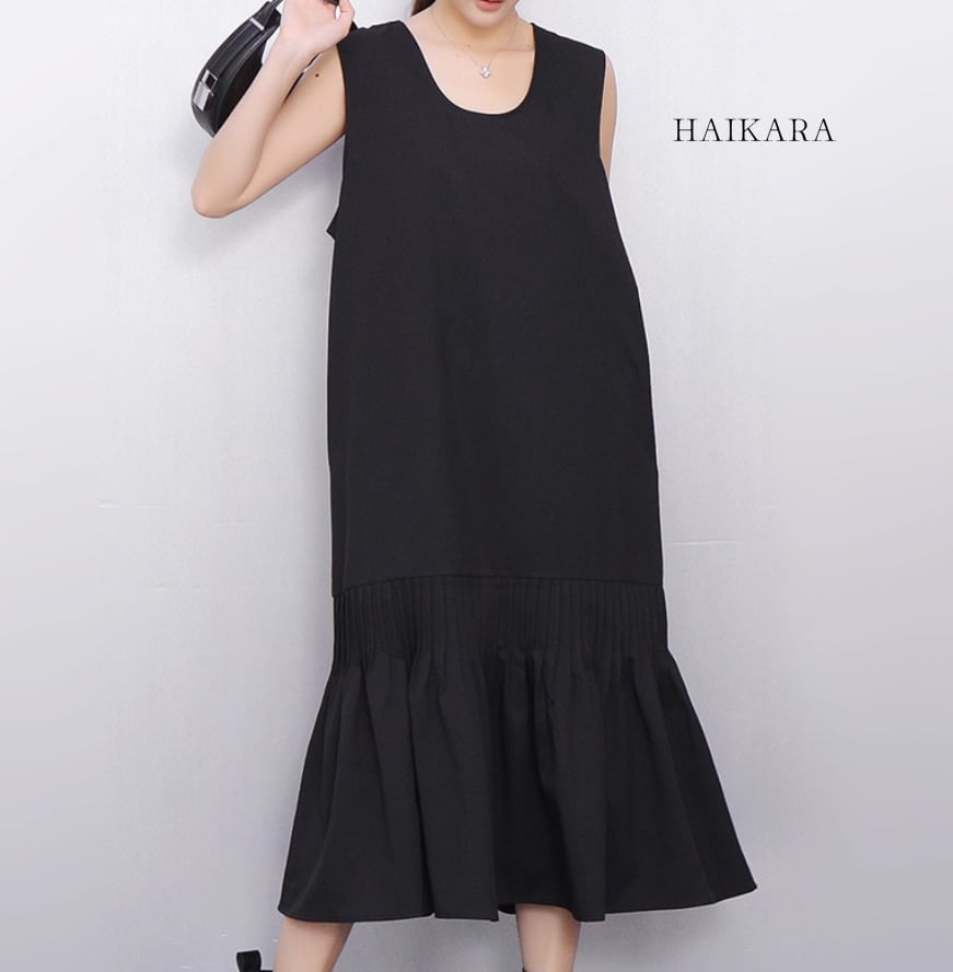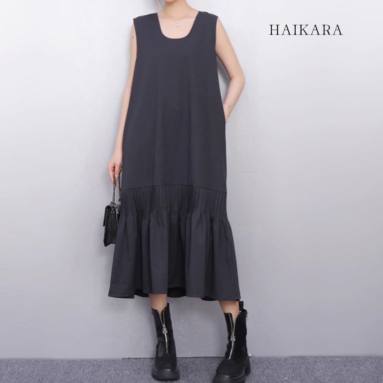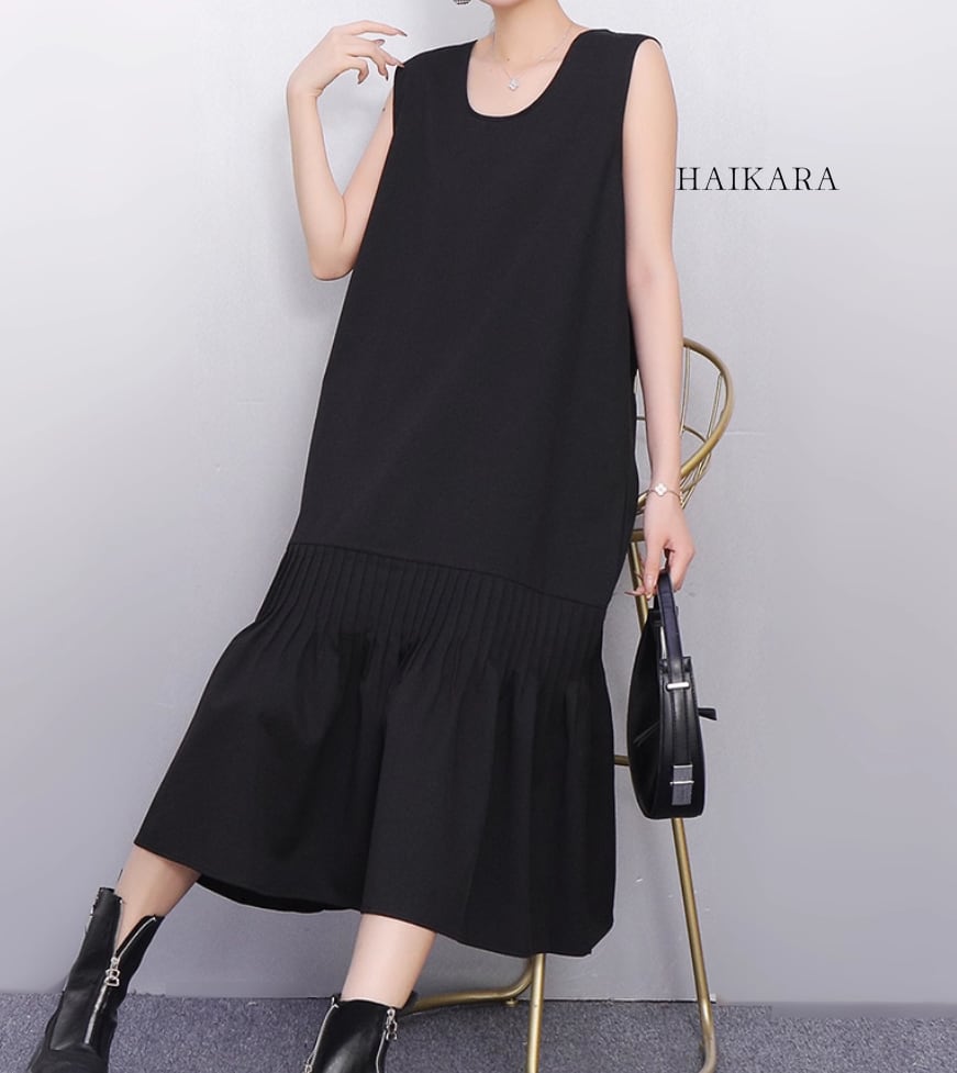 ★【 シンプルでゆったりとしたシルエットに、裾のプリーツ切り替えがアクセントになったノースリーブワンピースです。