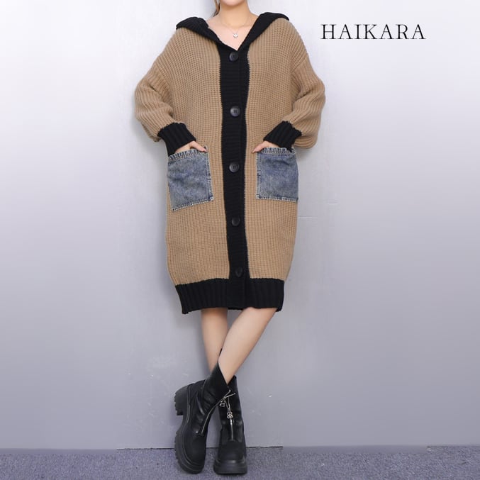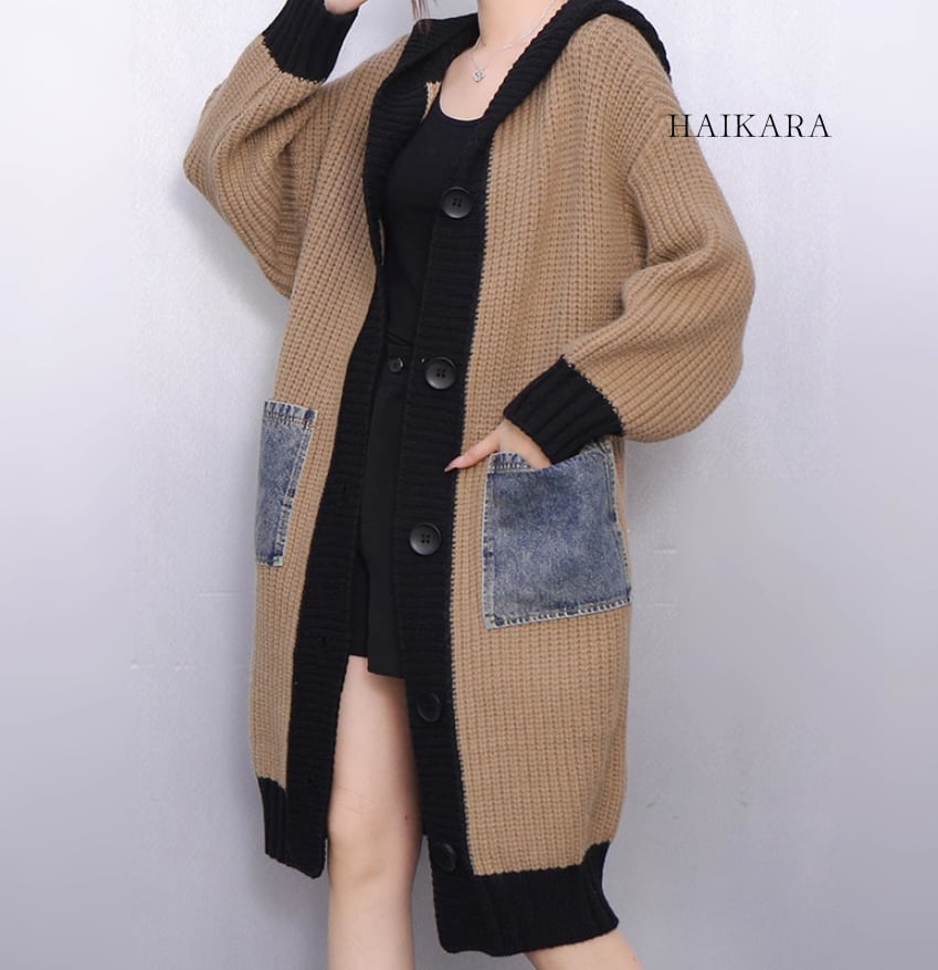 (NEW) Hooded Long Cardigan with Denim Pocket Accent
