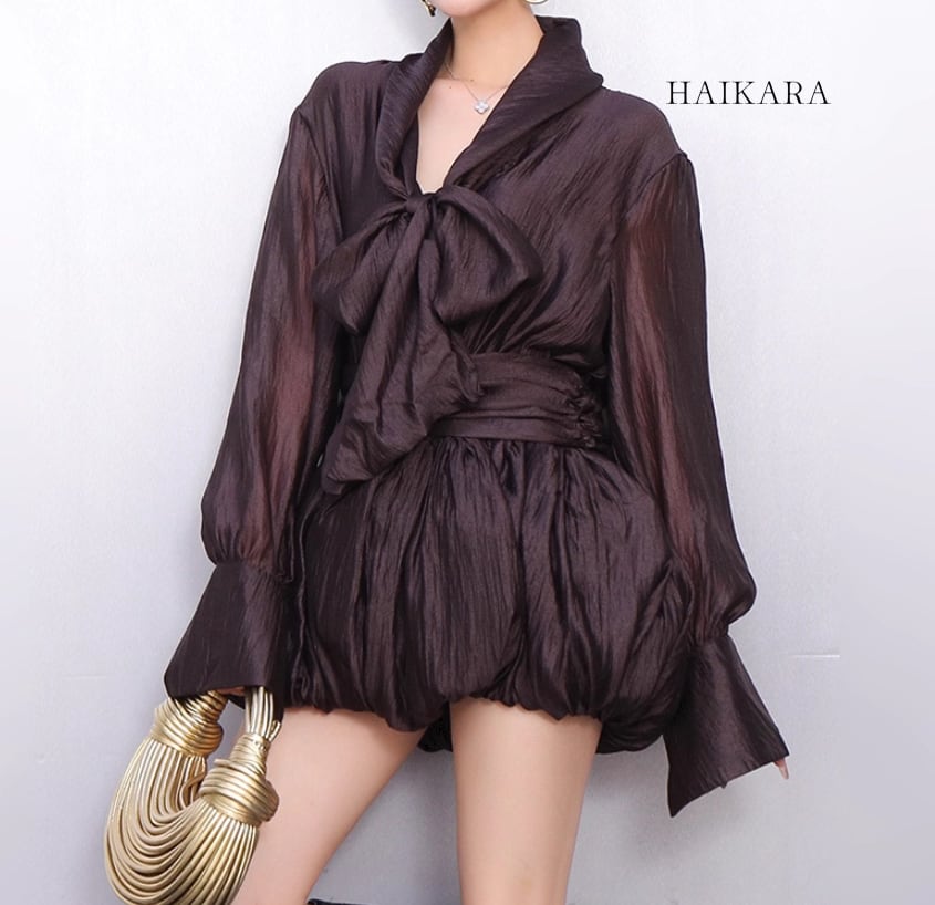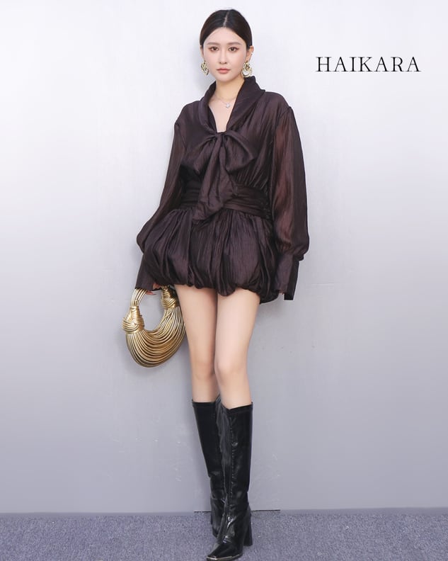 ★【 光沢感のあるシアーな生地に、バルーンシルエットの裾デザインを施した個性的なミニワンピースです。