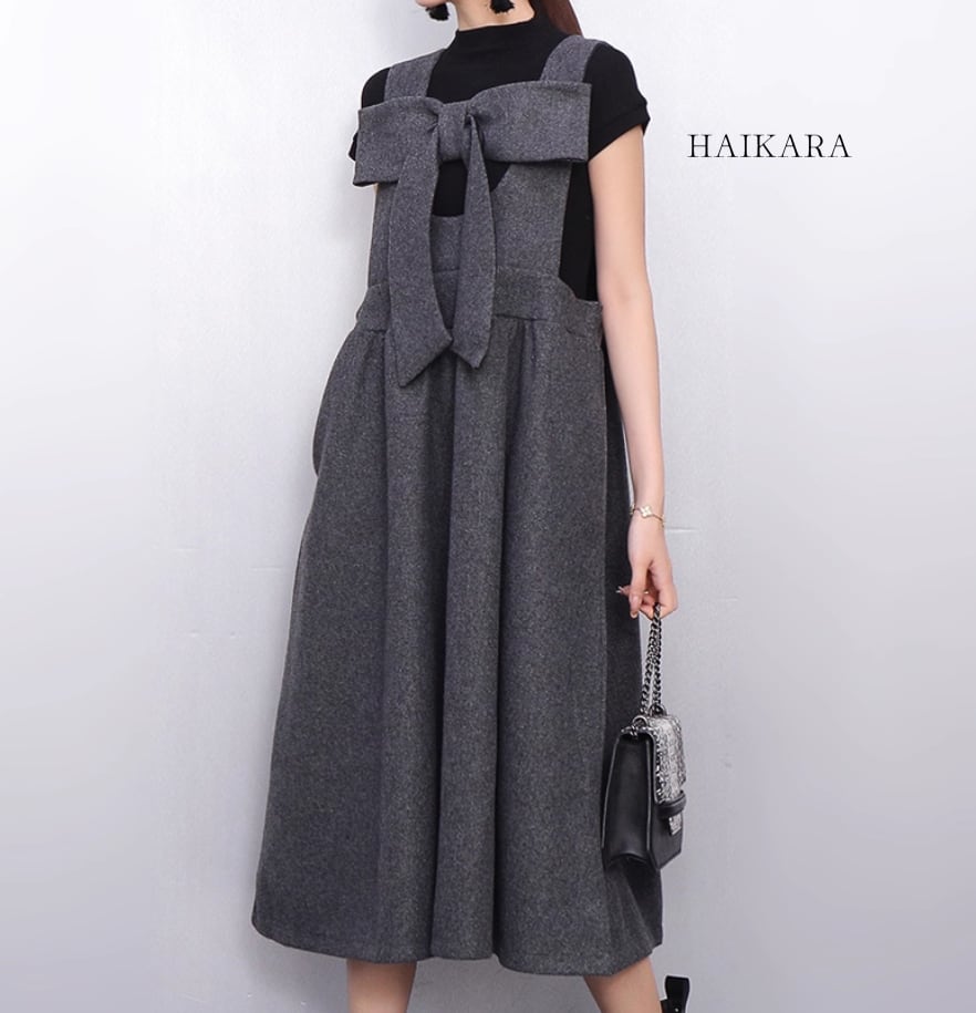 胸元で大きく結ばれたリボンがポイントで、可愛らしくもモードな雰囲気を演出します。