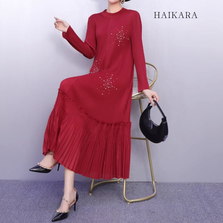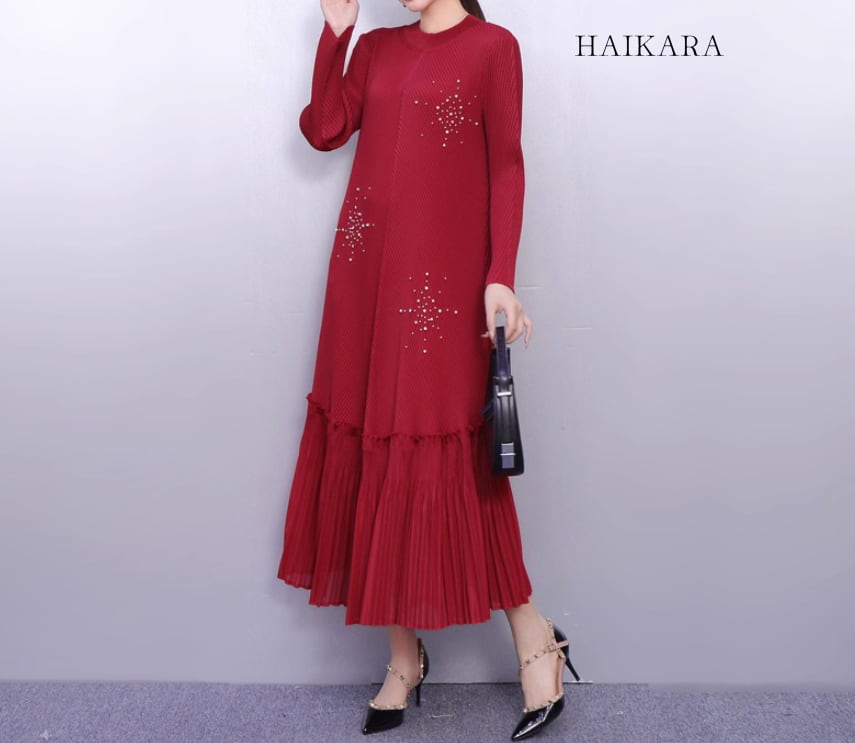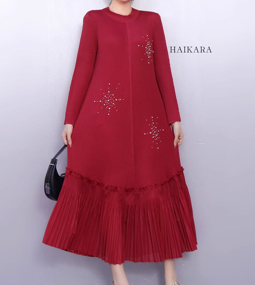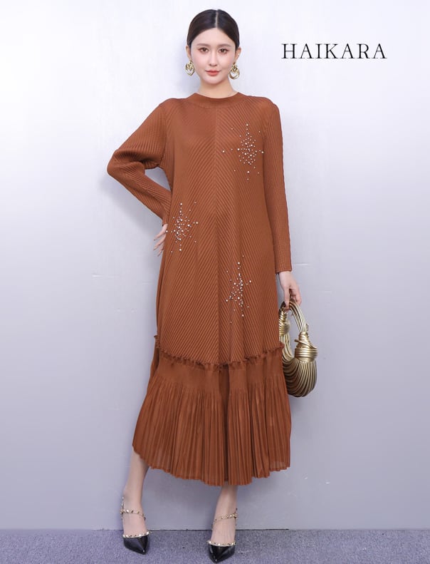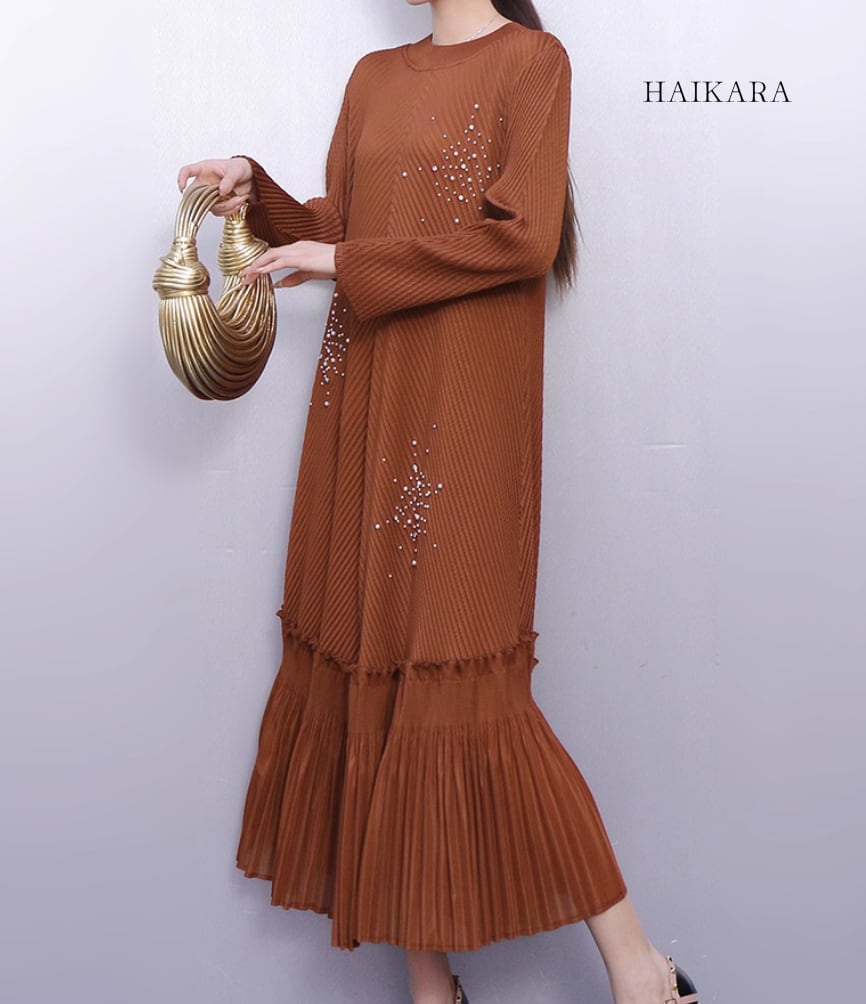 ★【 全体に細かなプリーツ加工を施した生地に、ビジューが施された華やかなワンピースです。