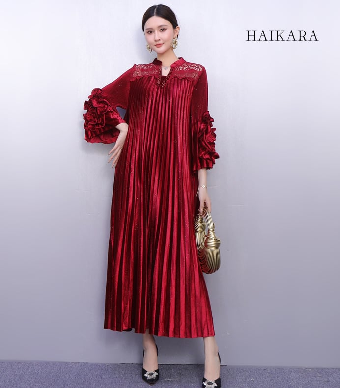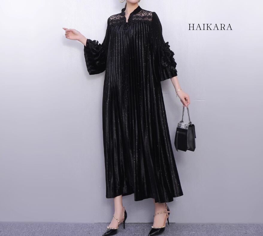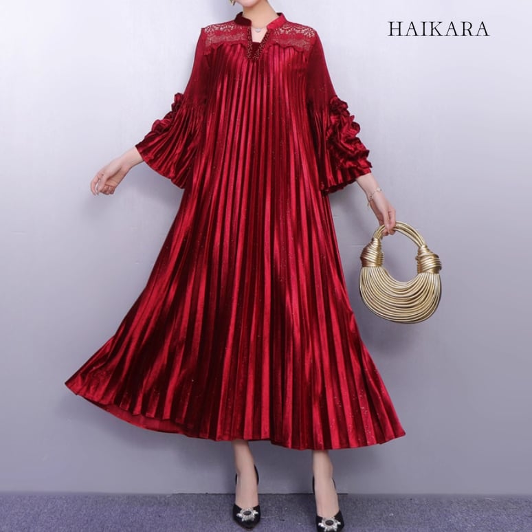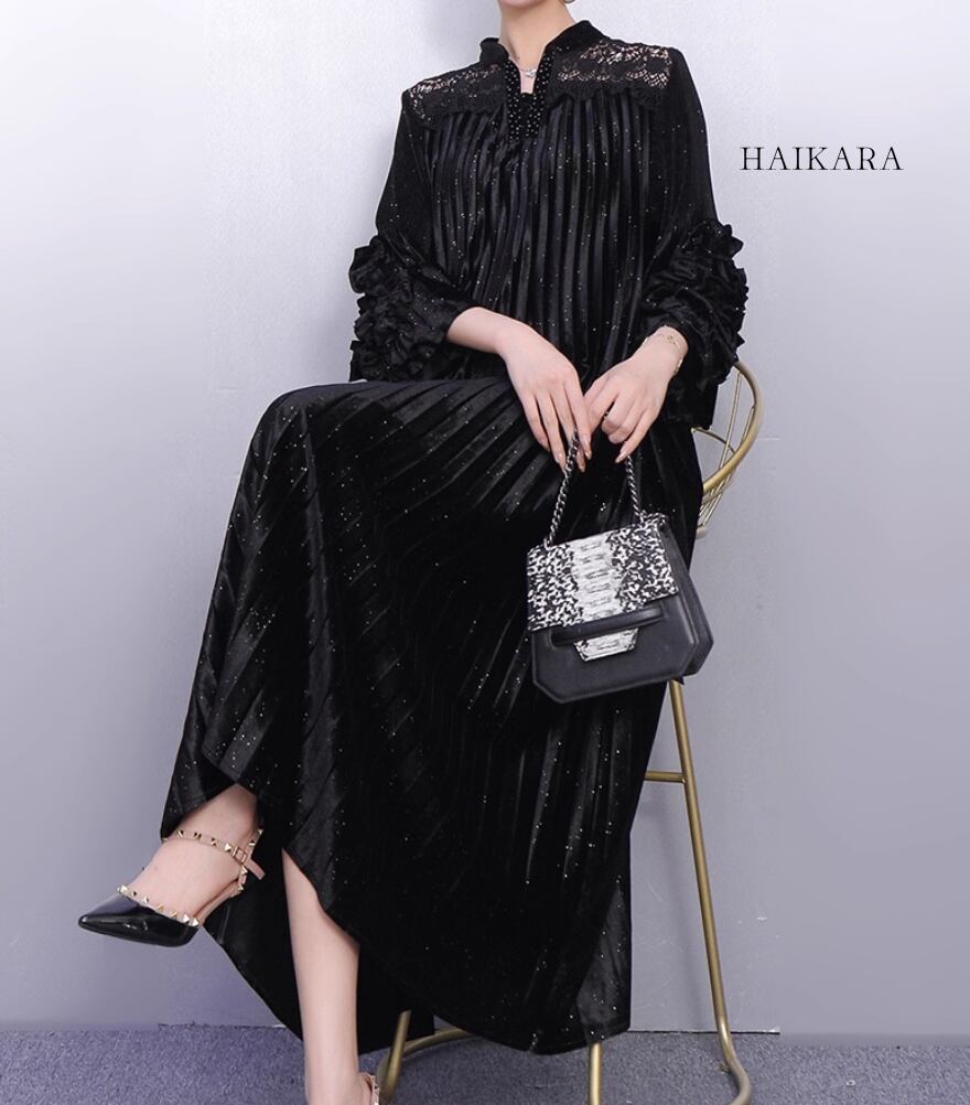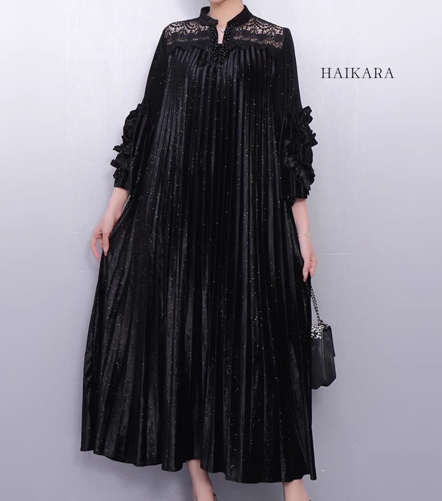 ★【 光沢感のあるベロア生地に細かなプリーツ加工と装飾を施した、エレガントなロングワンピースです。