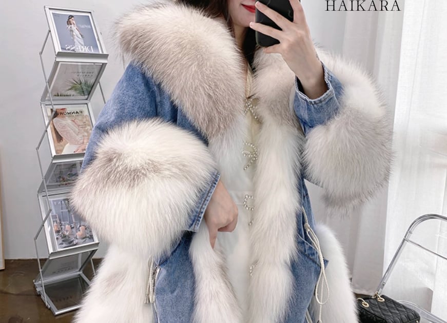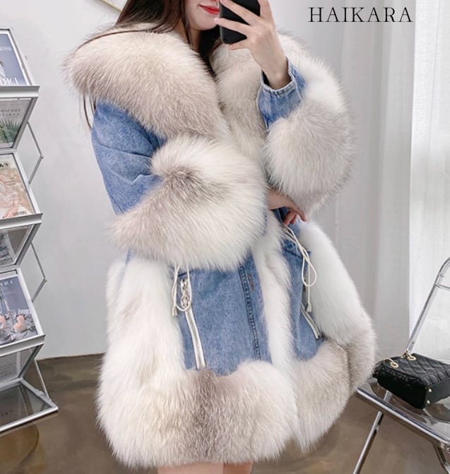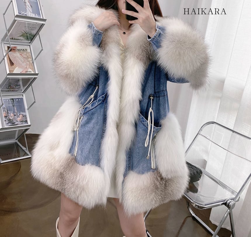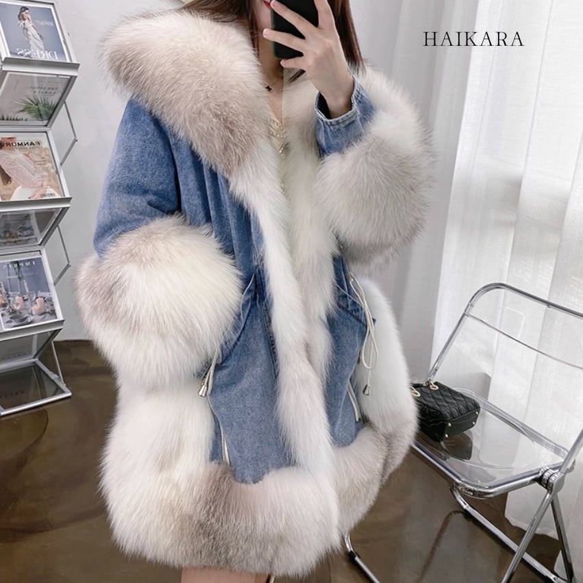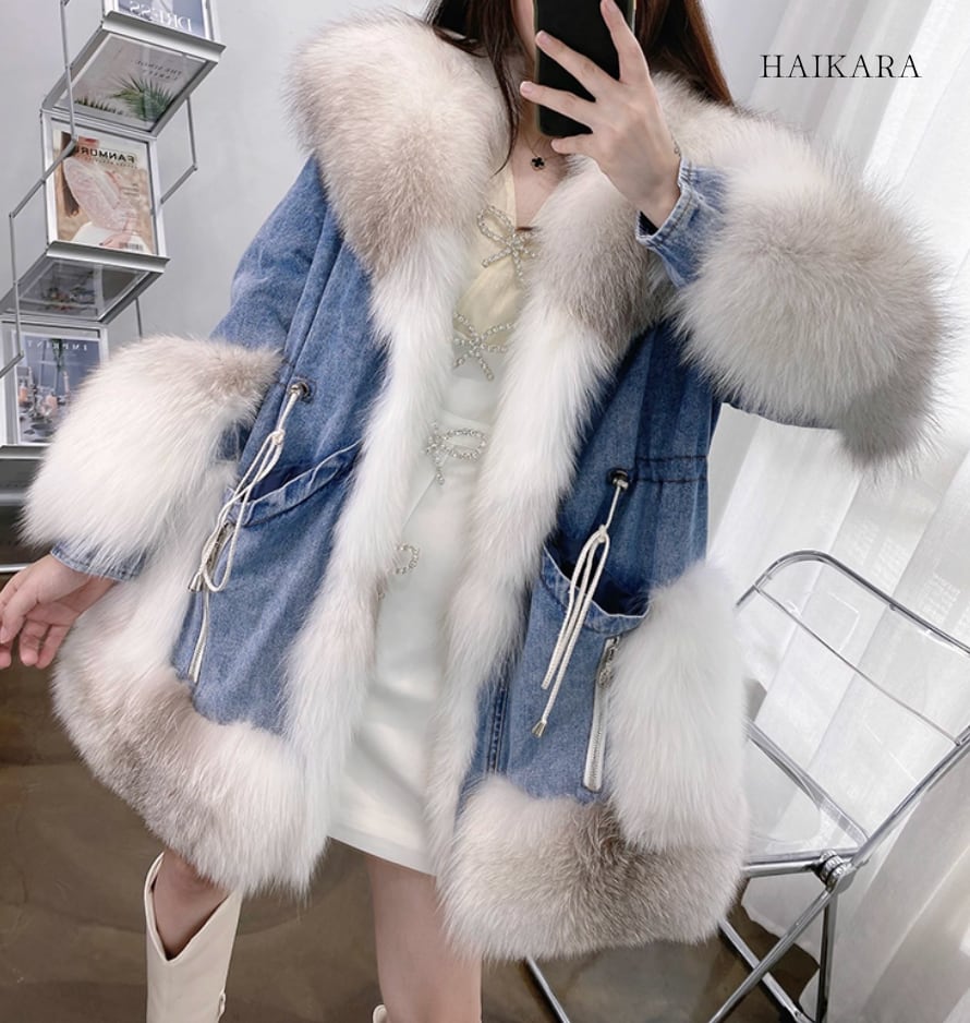 ★【 ウォッシュドデニム生地に、フードや袖、裾にボリューム満点のフェイクファーをあしらったロング丈ジャケットです。