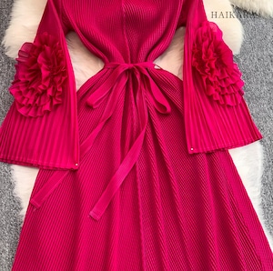 (NEW) Pleated Long Dress with Frill Corsage Details