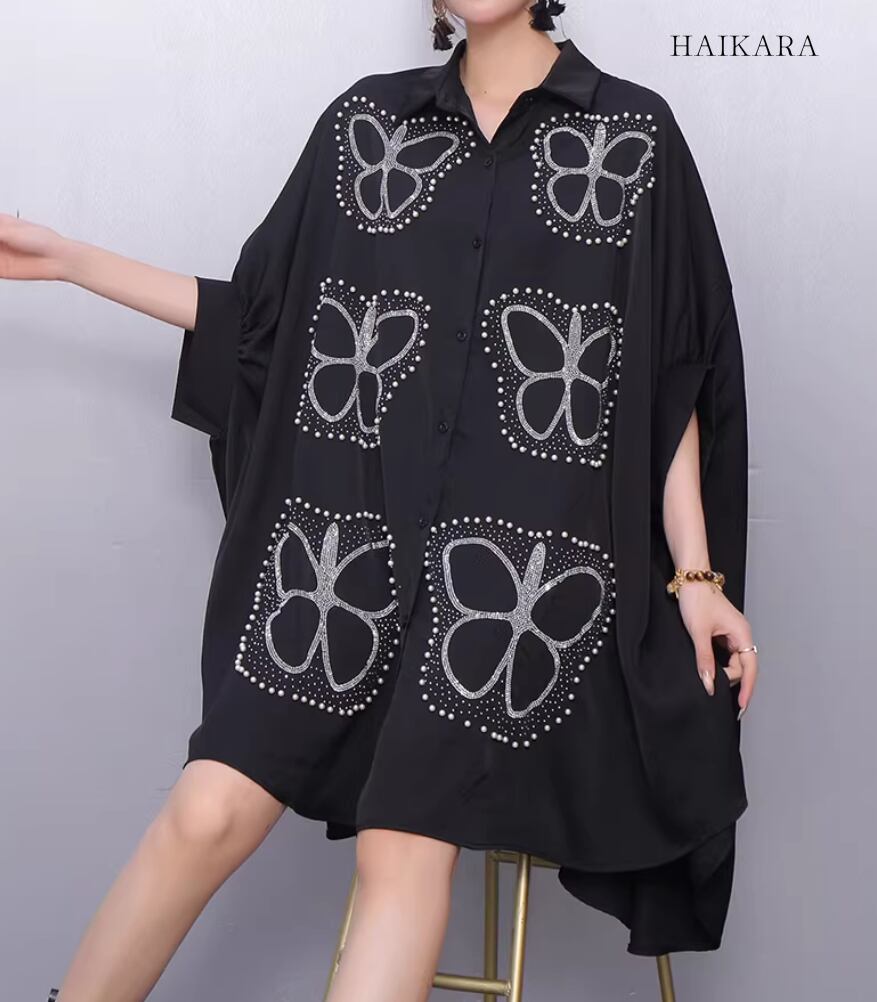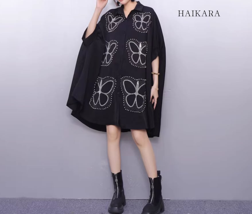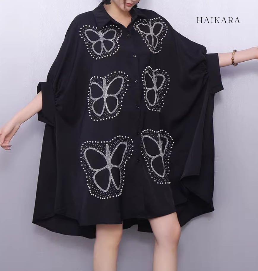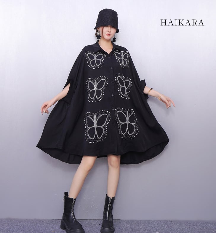 ★【 大胆な蝶のグラフィックプリントが施された、超ビッグシルエットのシャツワンピースです。
