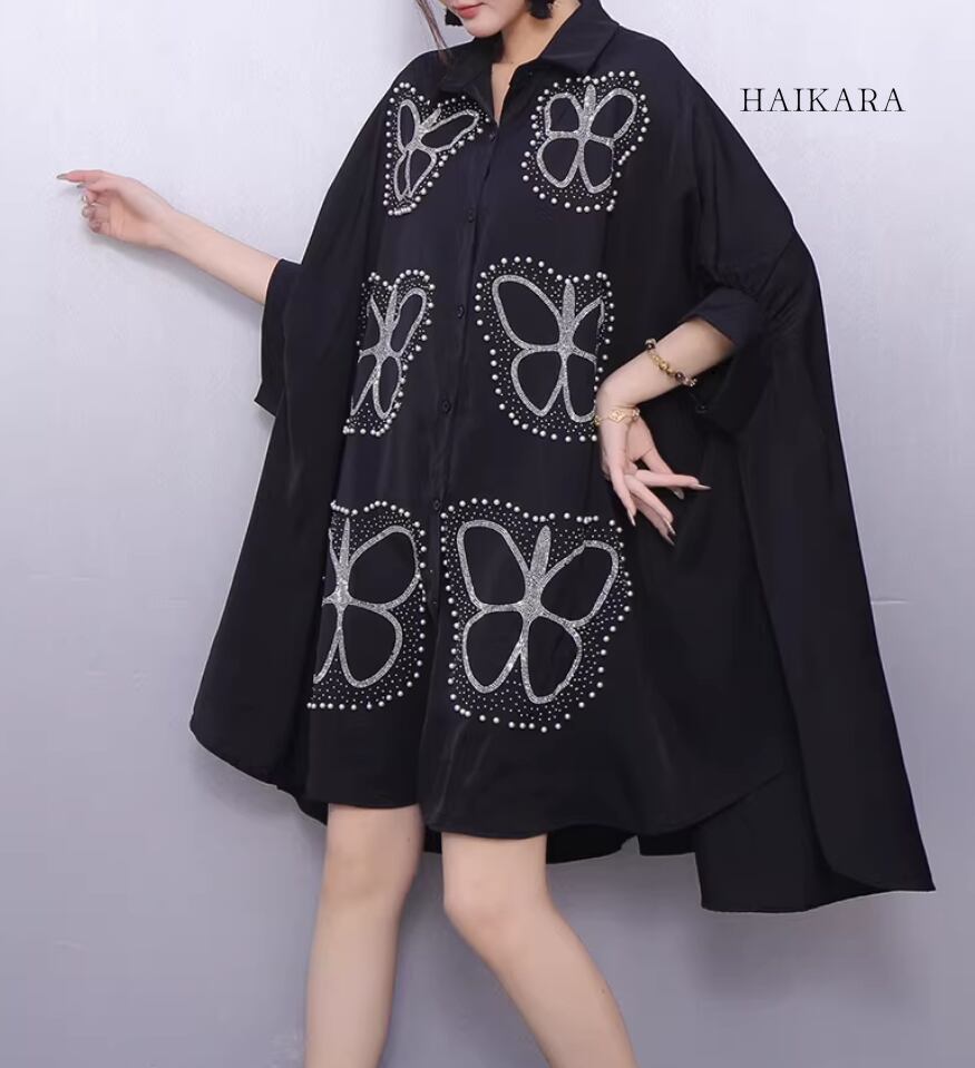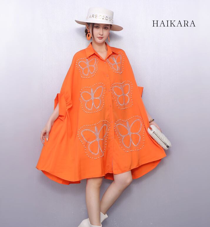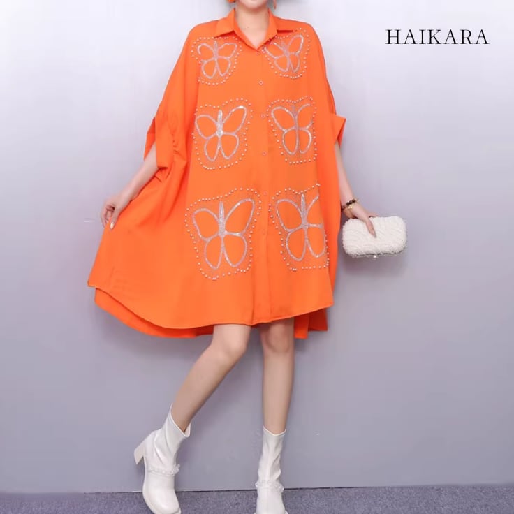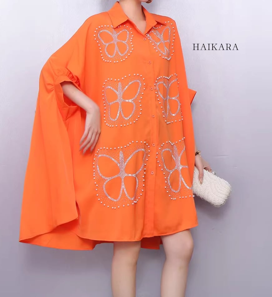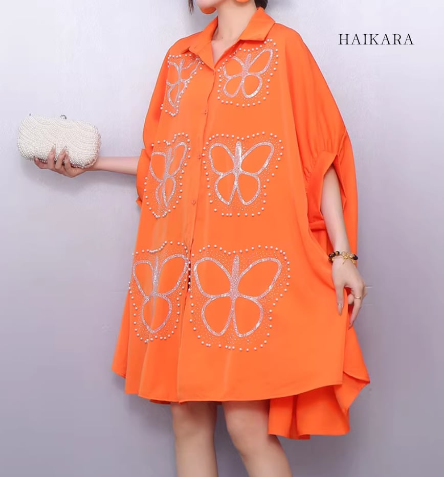 ★【 大胆な蝶のグラフィックプリントが施された、超ビッグシルエットのシャツワンピースです。