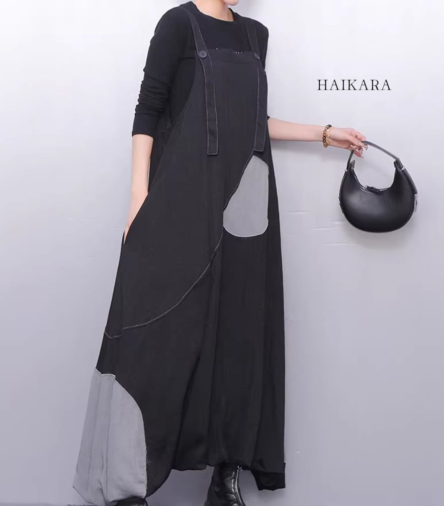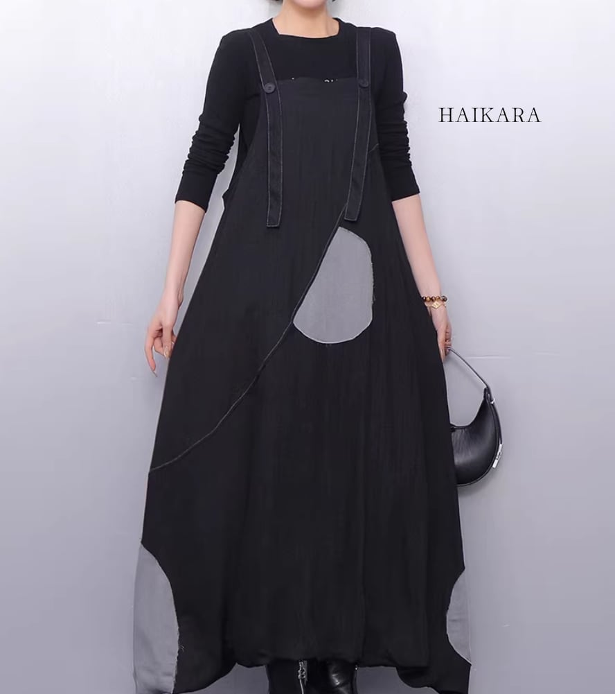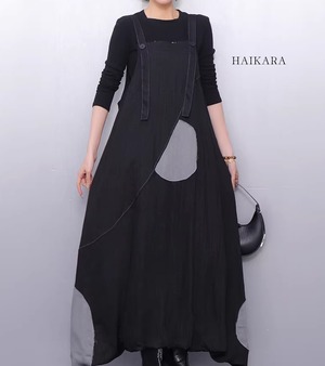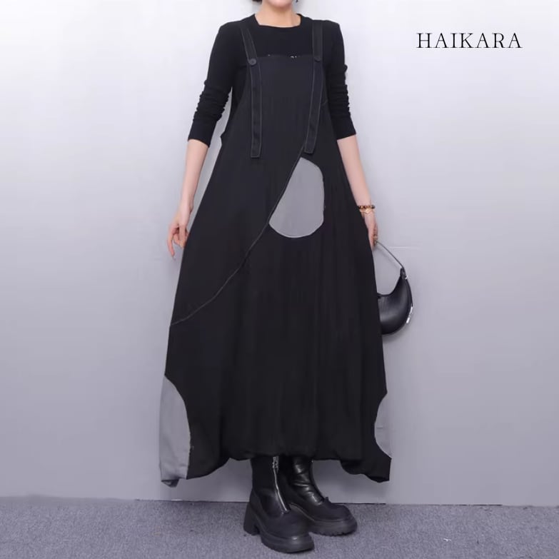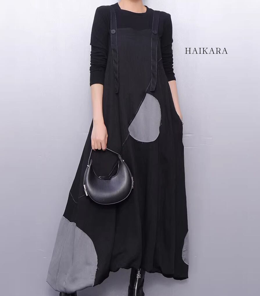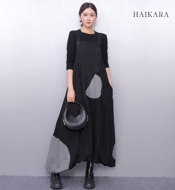 ★【 丸い形状の異素材パッチをランダムにあしらった、アーティスティックなデザインのジャンパースカートです。