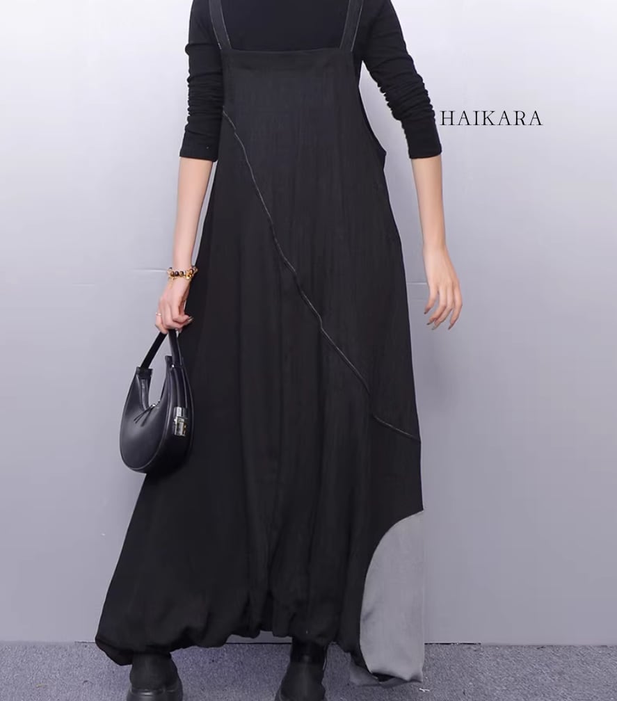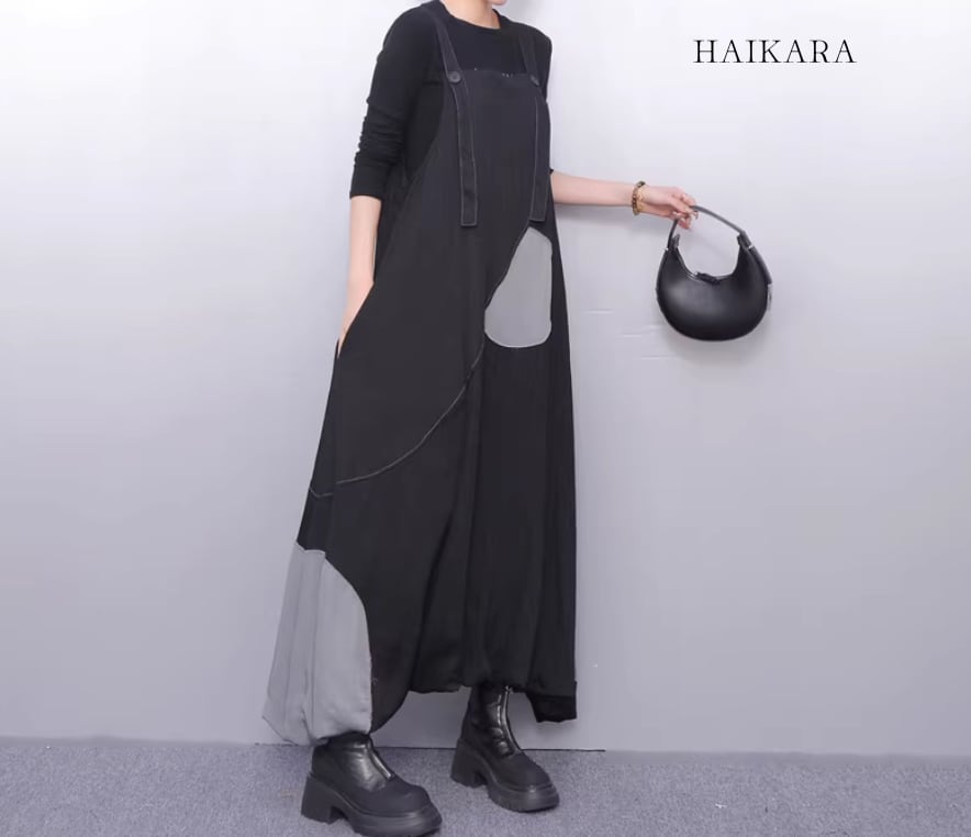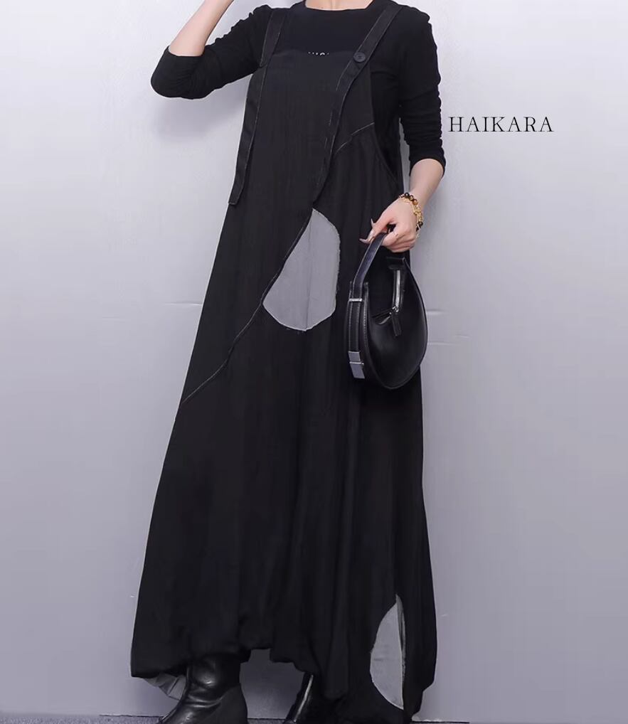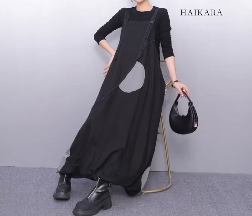 ★【 丸い形状の異素材パッチをランダムにあしらった、アーティスティックなデザインのジャンパースカートです。