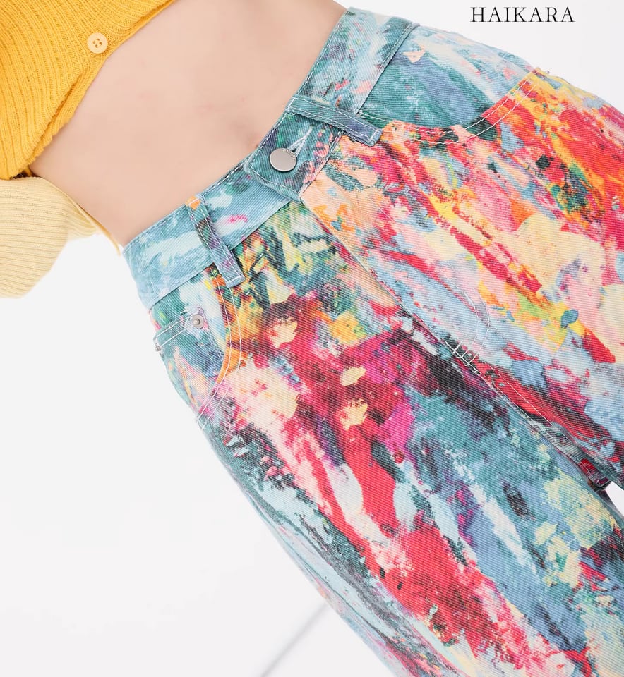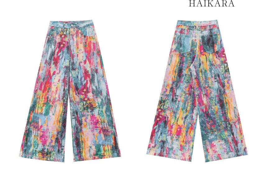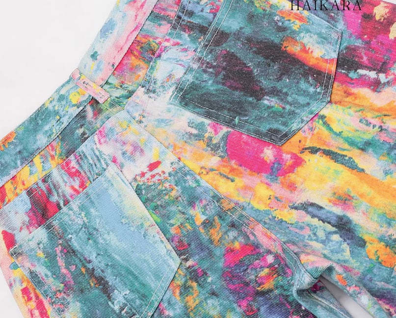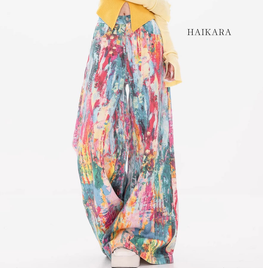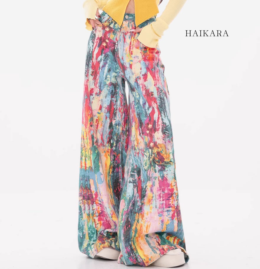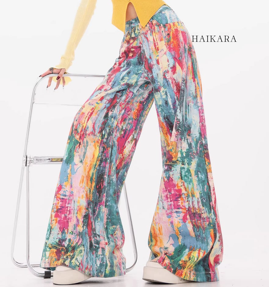 ★【 キャンバスに描かれた抽象画のような、鮮やかなペイントプリントが目を引くアーティスティックなワイドパンツです。