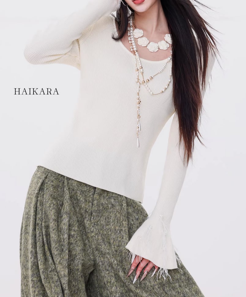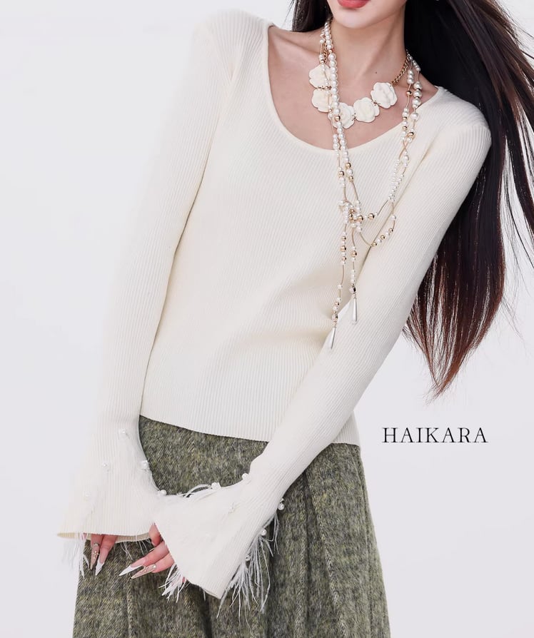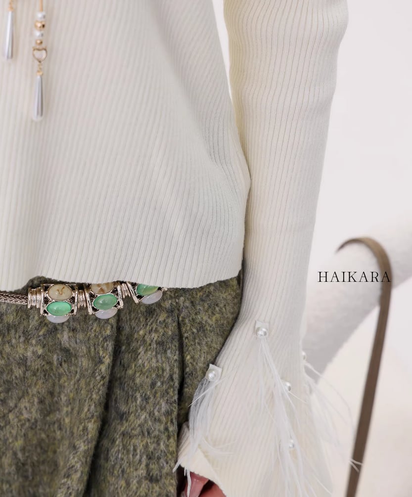 ★【 袖口に柔らかなフェザーと艶やかなパールをあしらった、エレガントな表情のリブニットトップスです。
