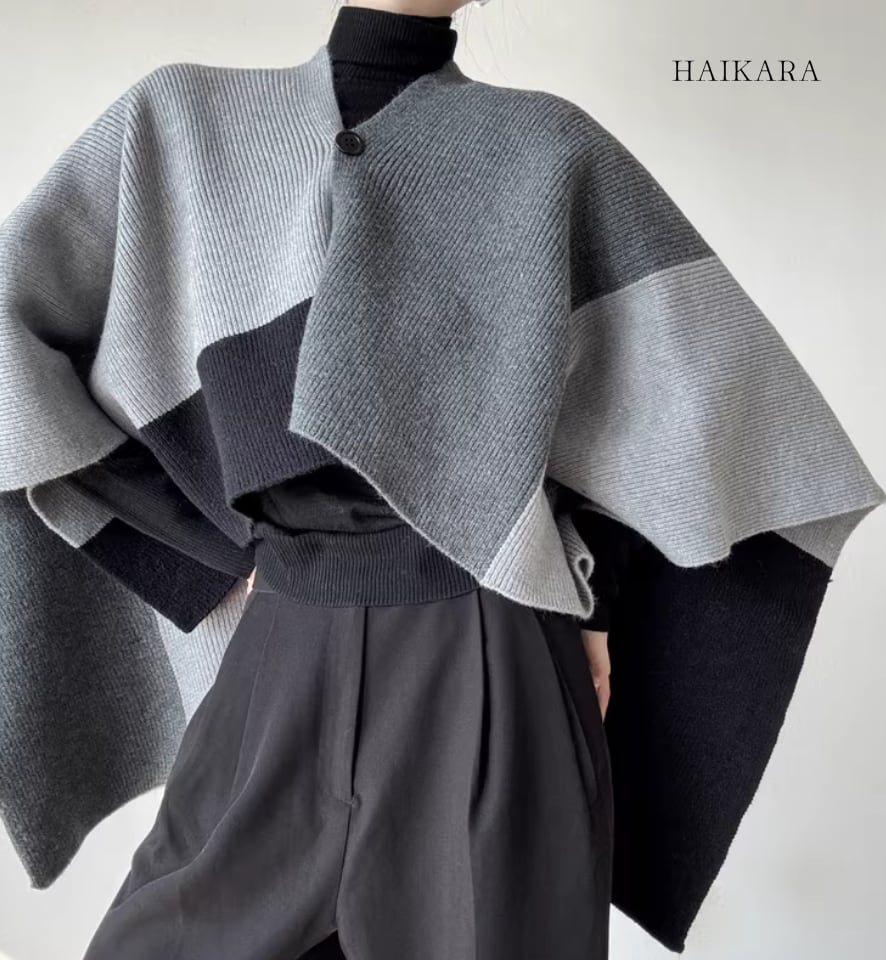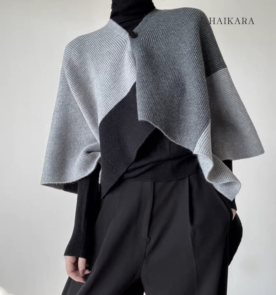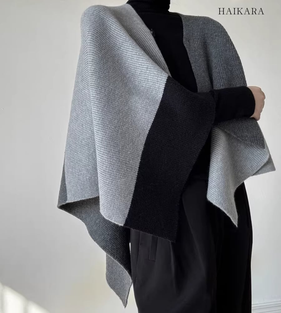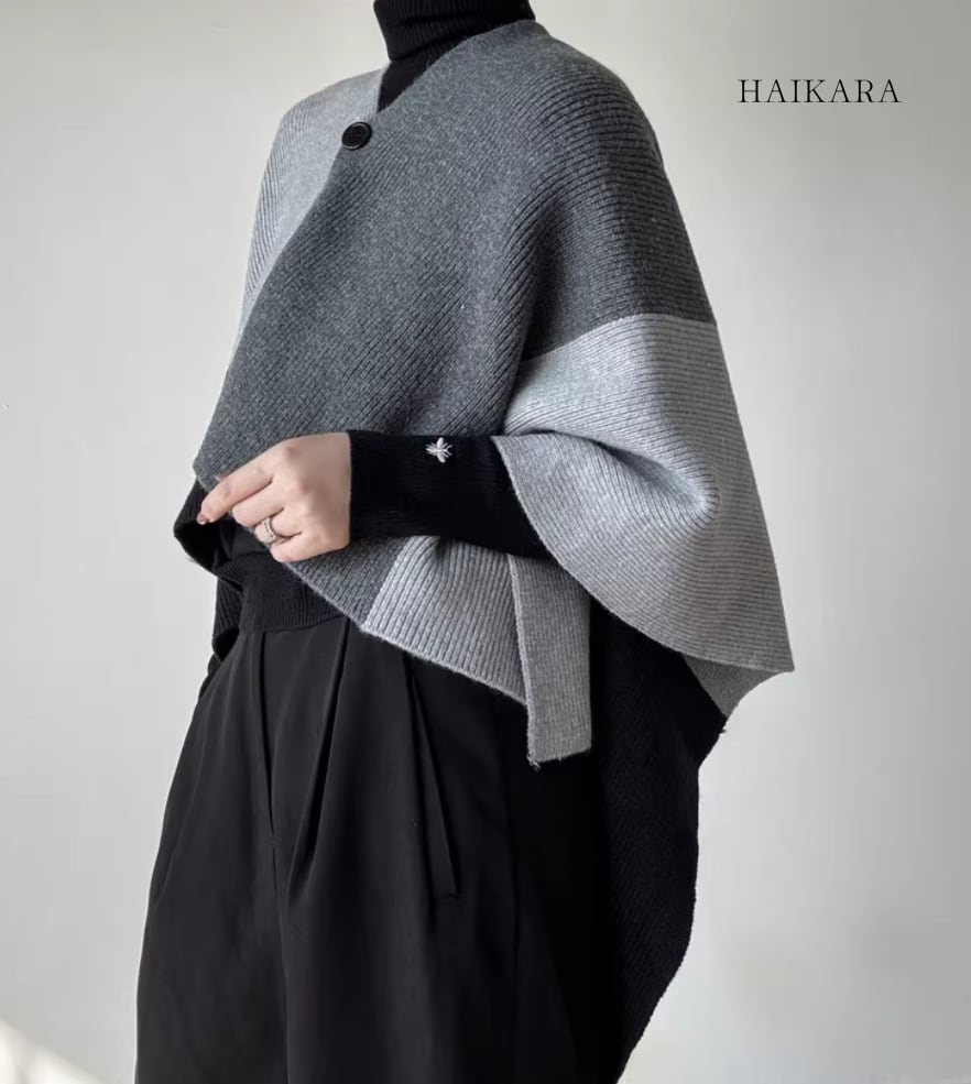 ★【 モノトーンのカラーブロックが都会的でモードな印象を与える、洗練されたデザインのニットケープです。