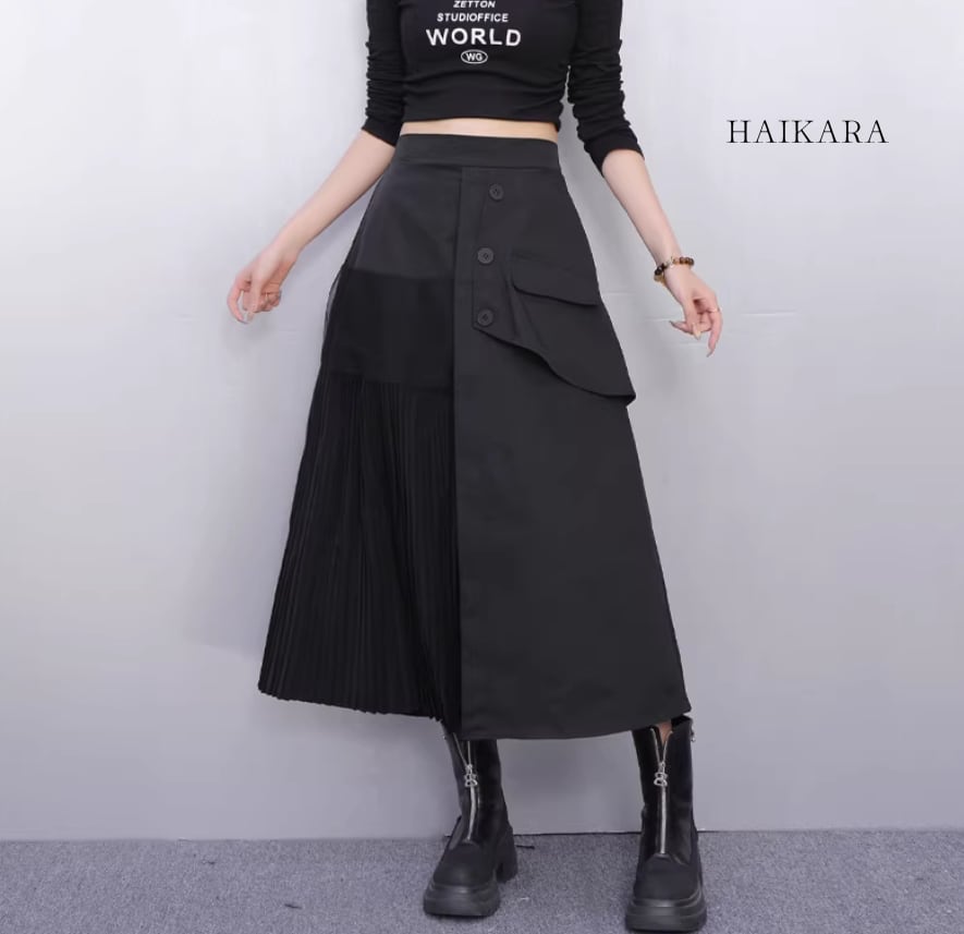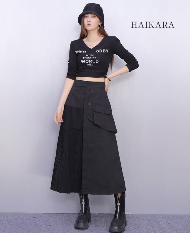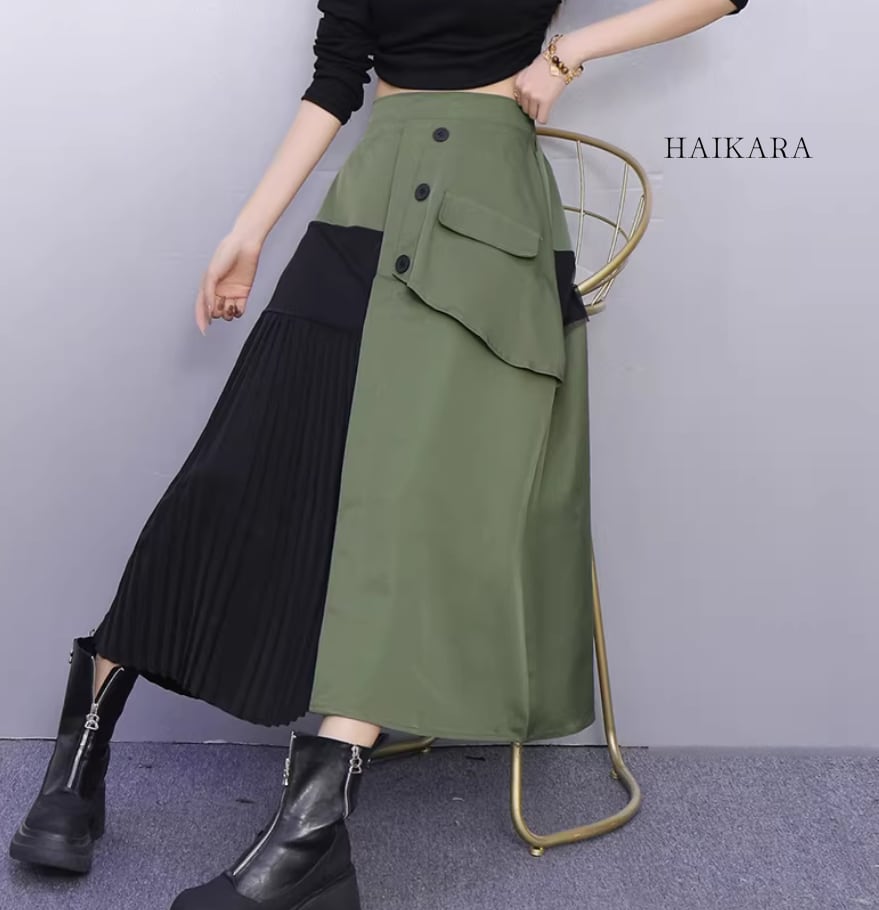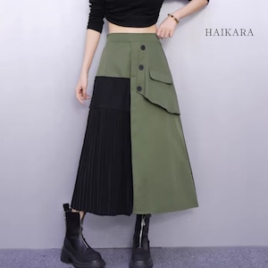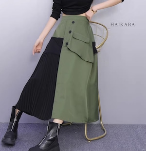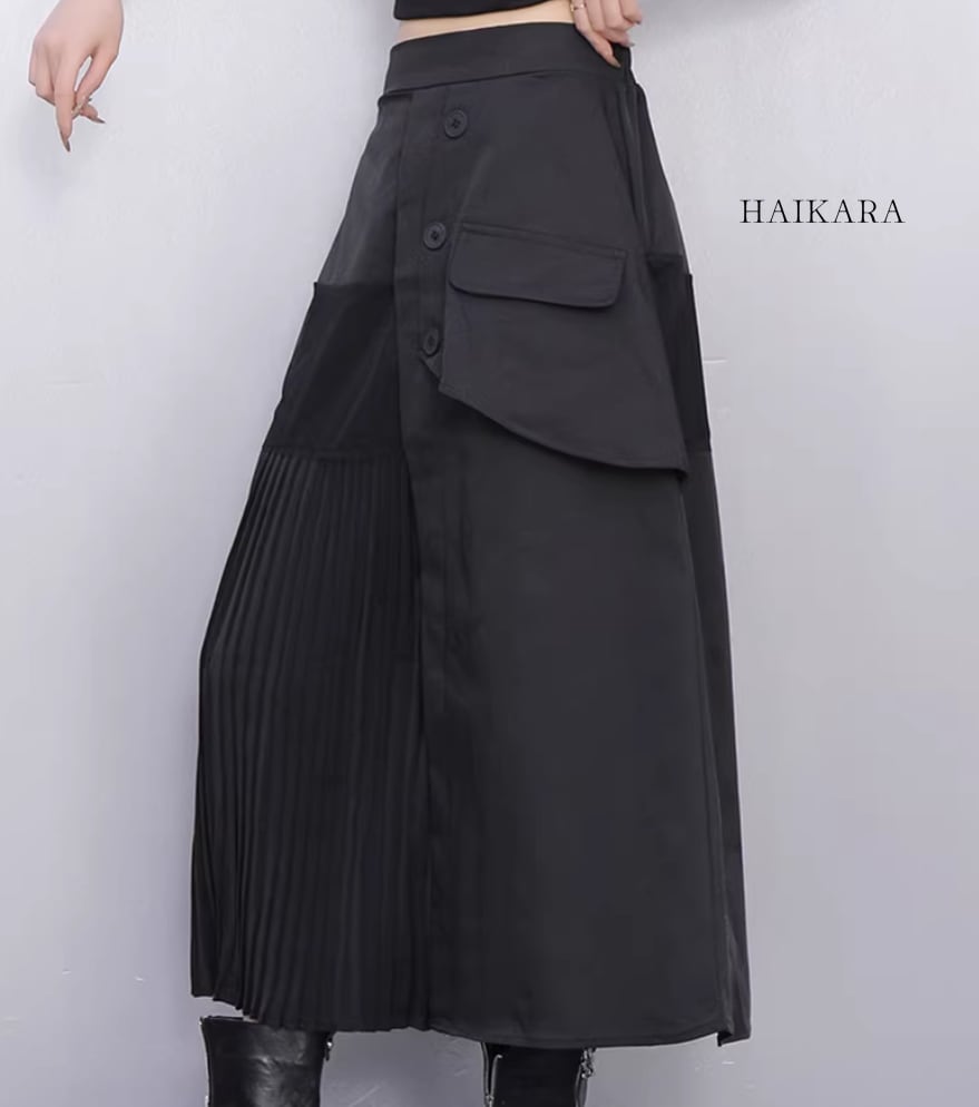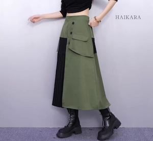 ★【 ワークテイストな生地と繊細なプリーツを大胆に掛け合わせた、アシンメトリーデザインのロングスカートです。