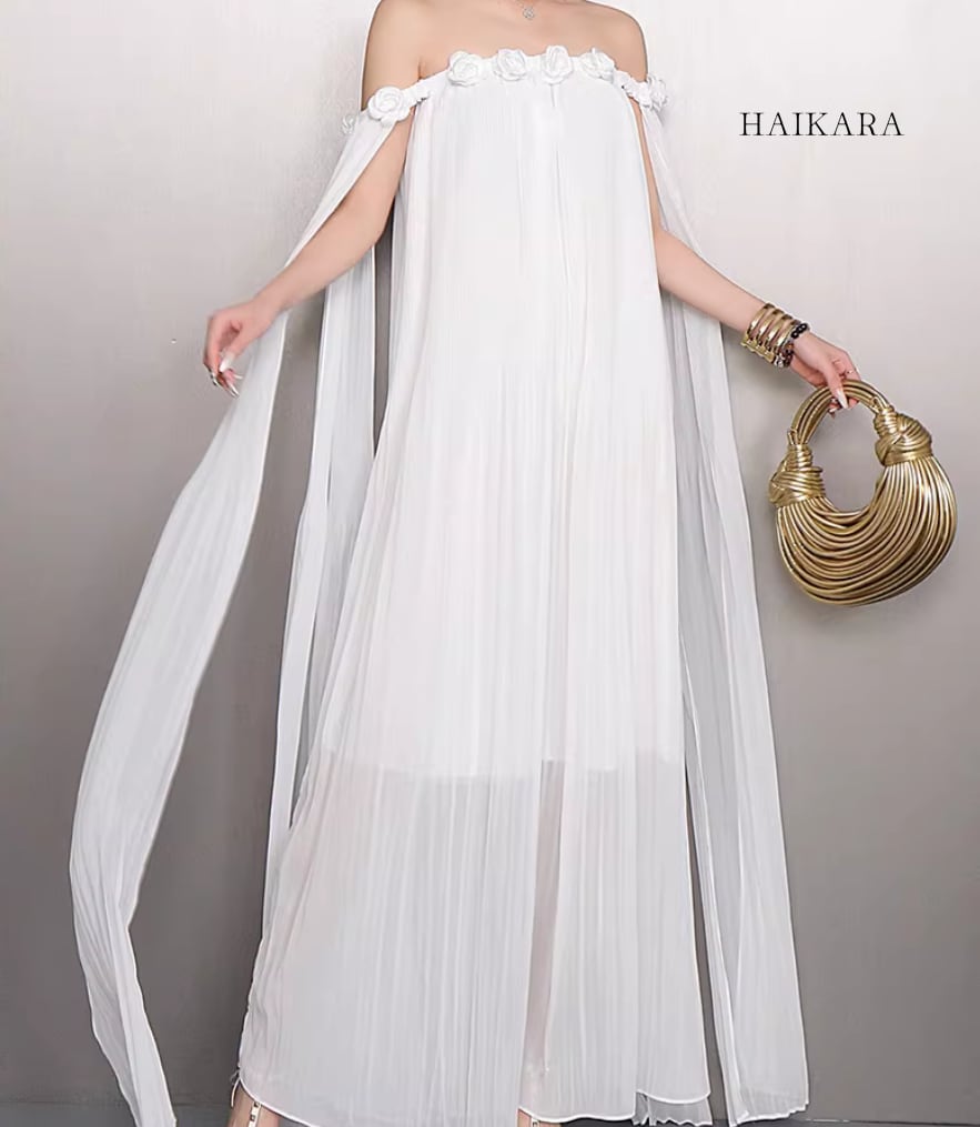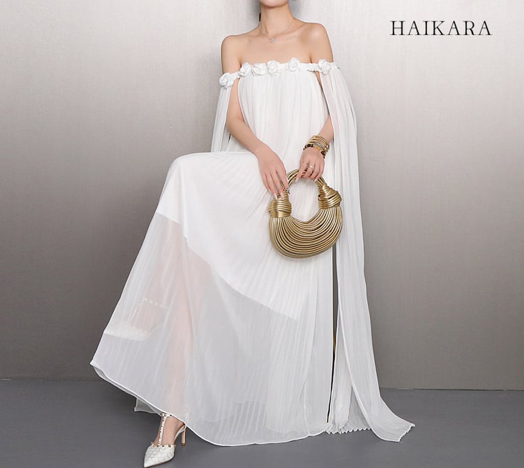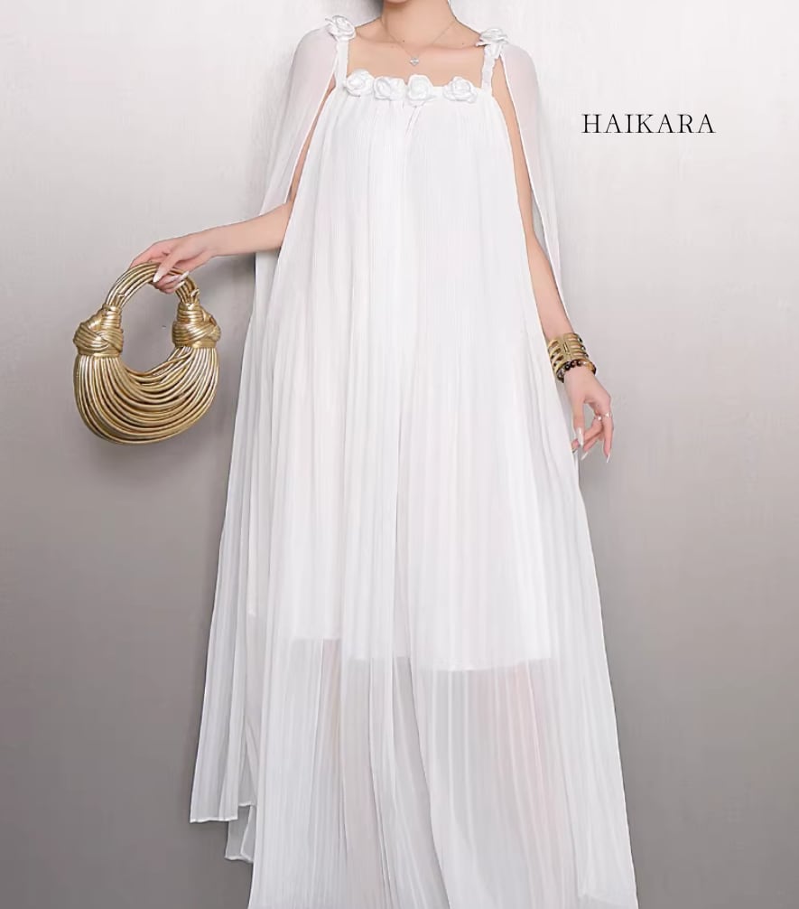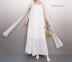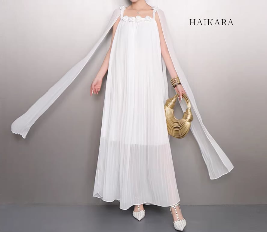 繊細なシフォンプリーツの透け感と、軽やかに揺れるロングリボンが、歩くたびにドラマティックな表情を演出します。
