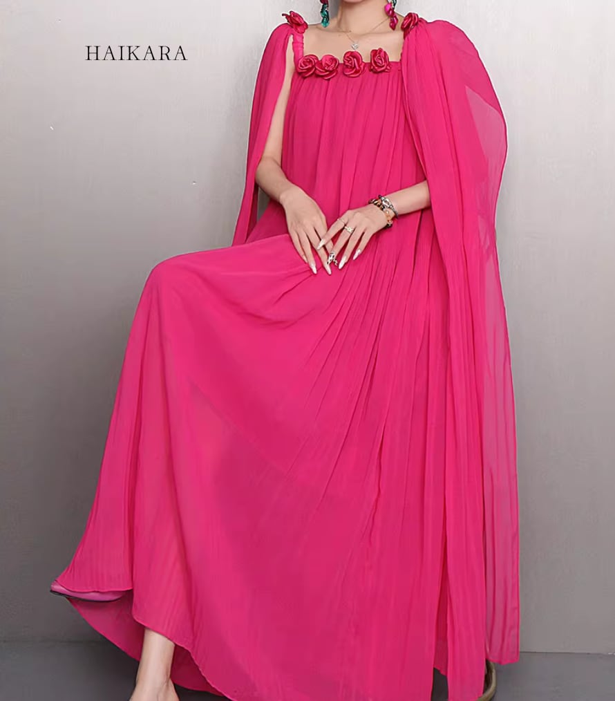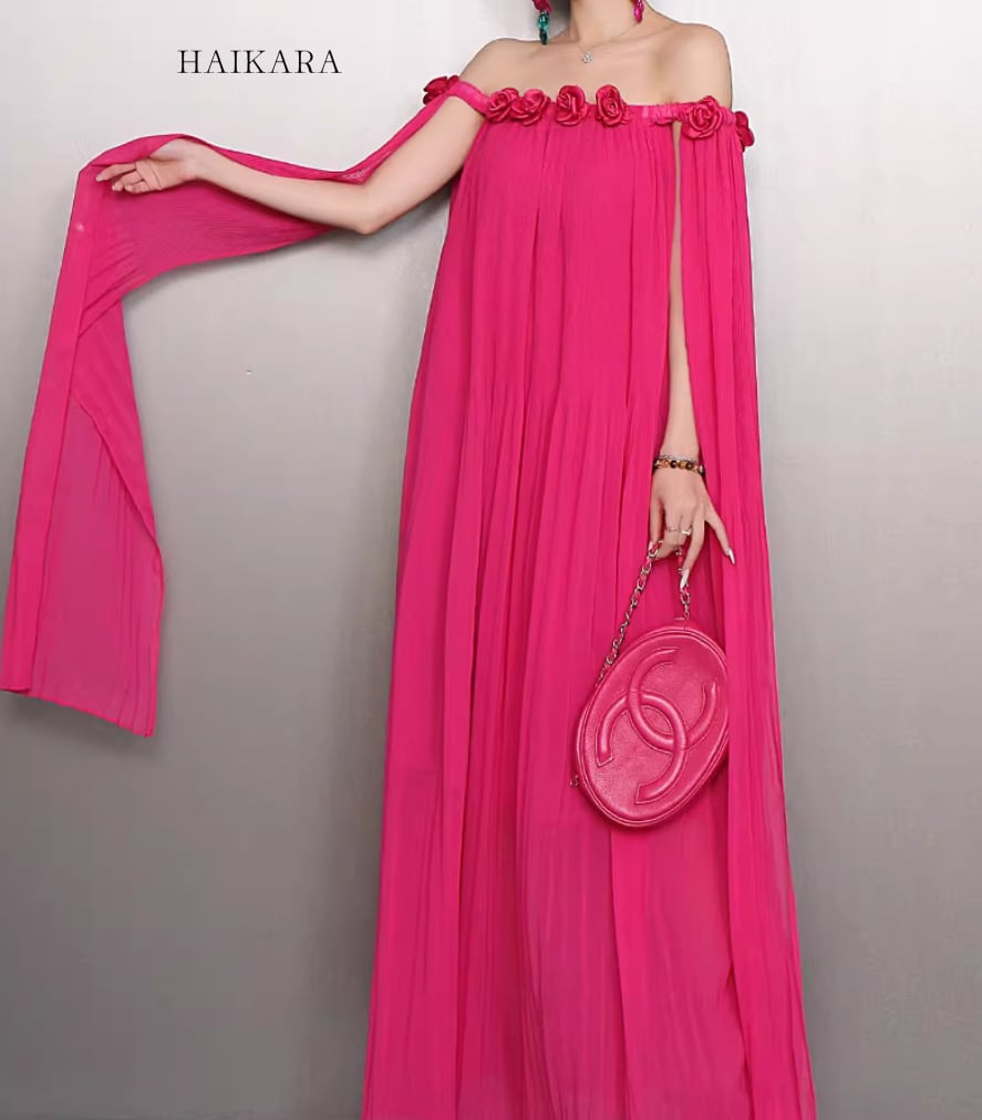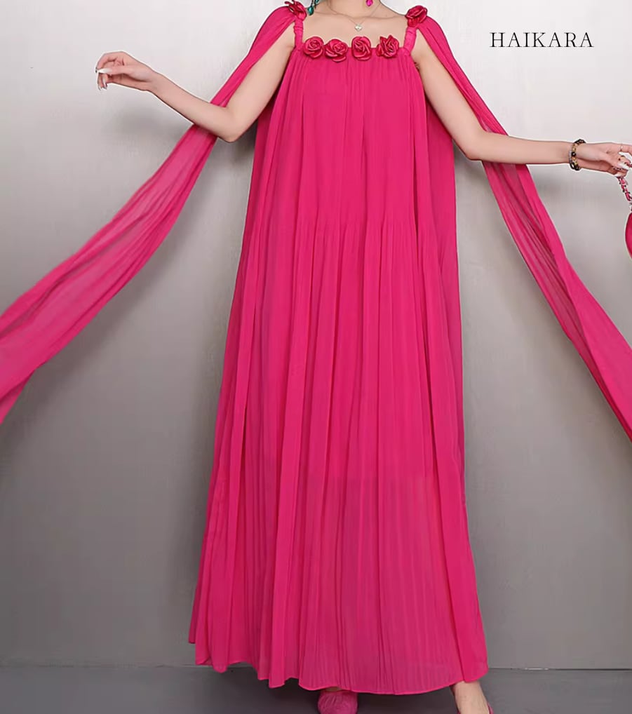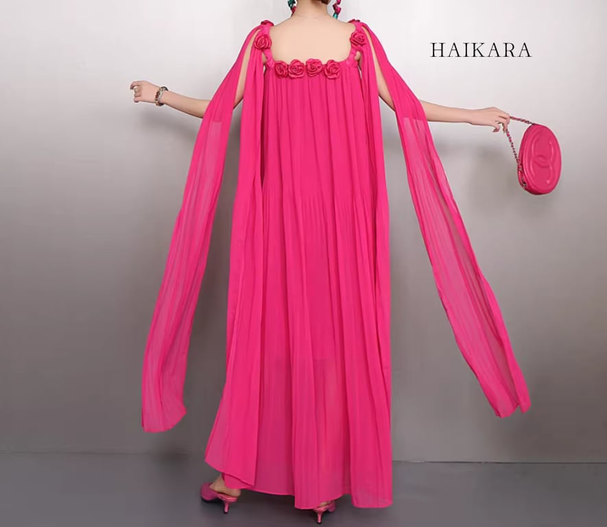 繊細なシフォンプリーツの透け感と、軽やかに揺れるロングリボンが、歩くたびにドラマティックな表情を演出します。