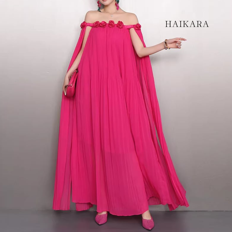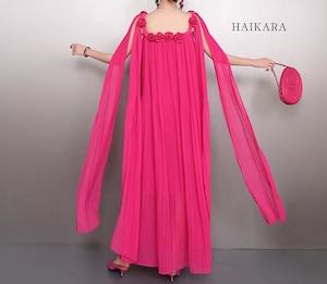 ★【 胸元とショルダーに咲き誇る立体的なフラワーコサージュが、圧倒的な気品を放つロングワンピースです。