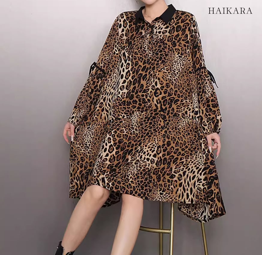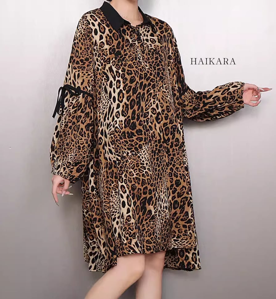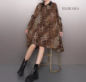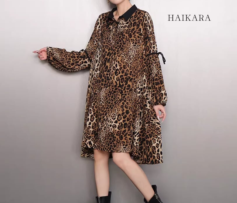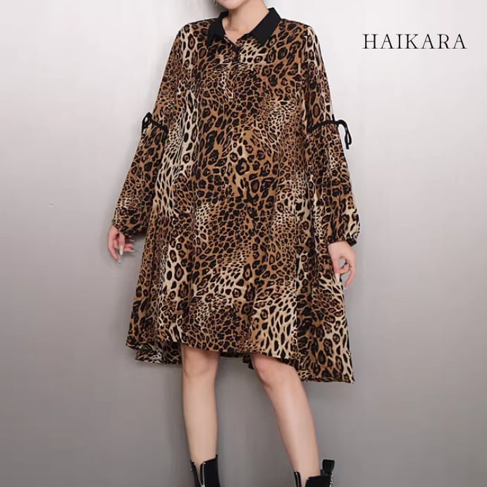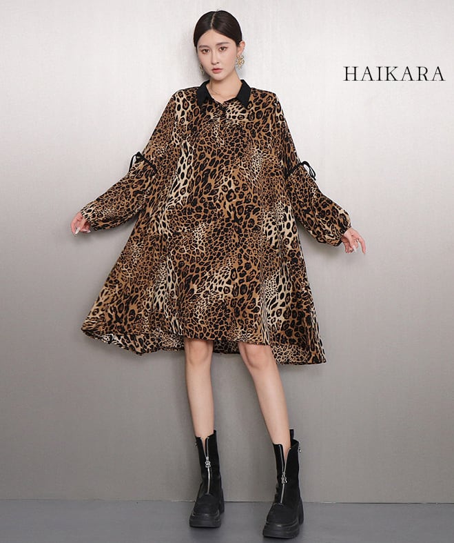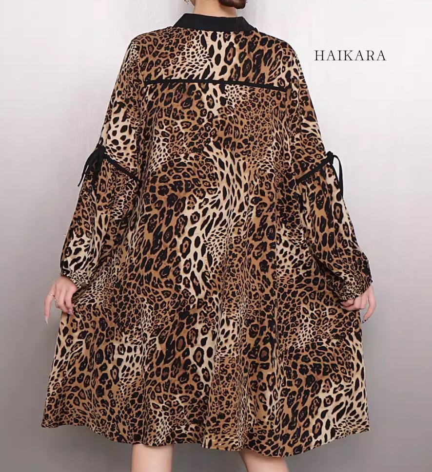 レオパード・ボリュームスリーブ・Aラインワンピース