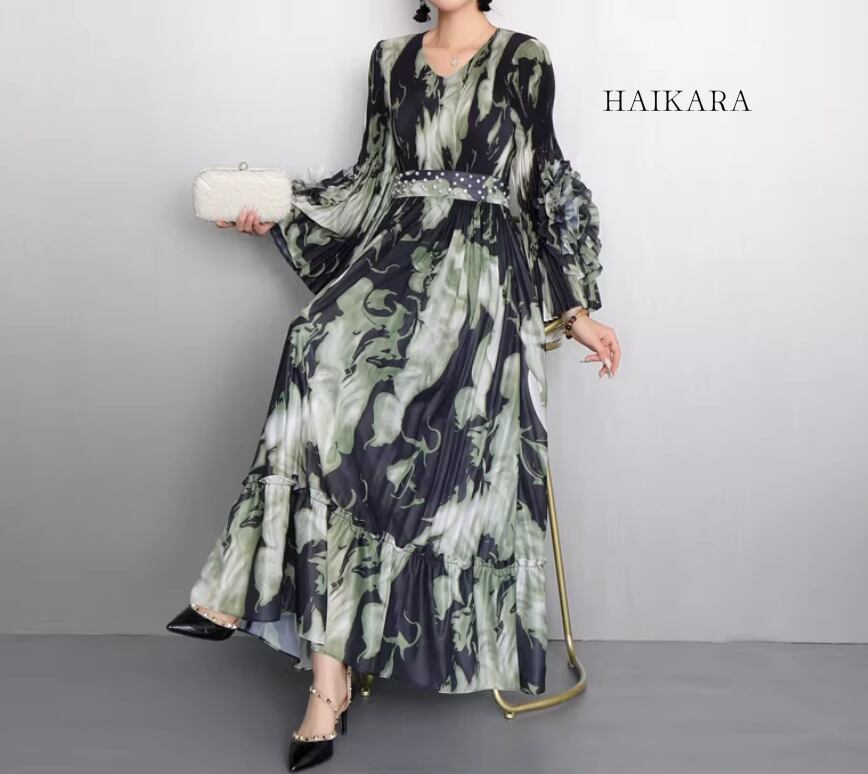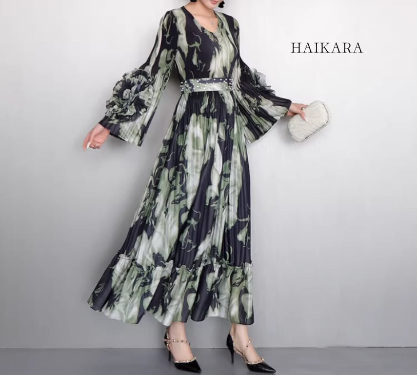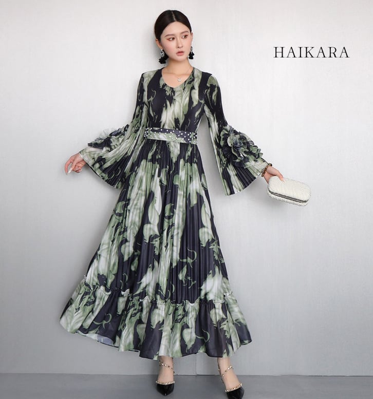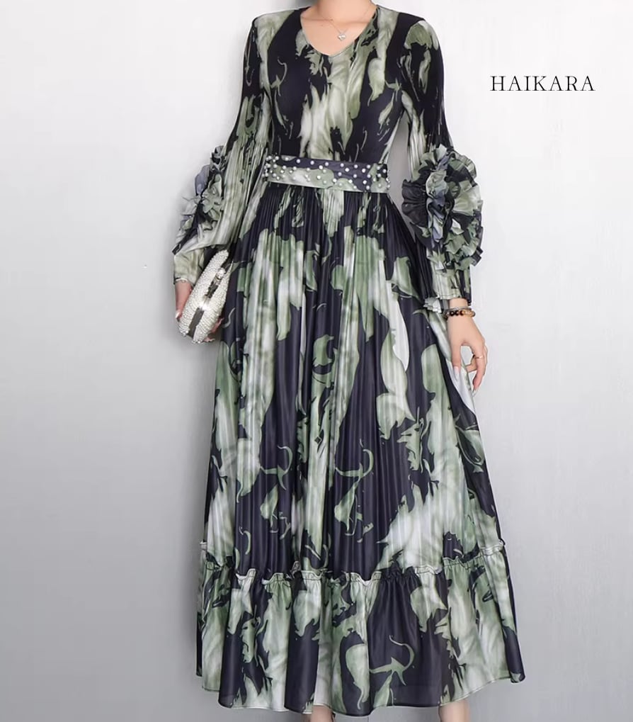 ★【 芸術的なグラフィックプリントと繊細なプリーツが織りなす、圧倒的な存在感を放つエレガントなロングワンピースです。