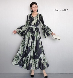 グラフィックプリーツ・ビジューベルト・ロングドレス