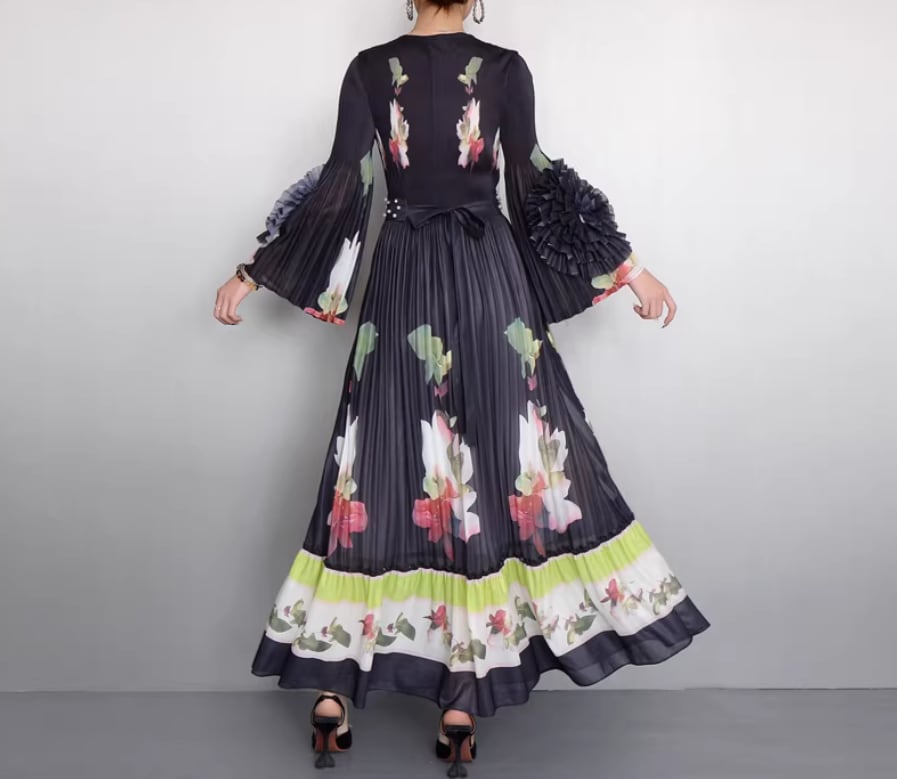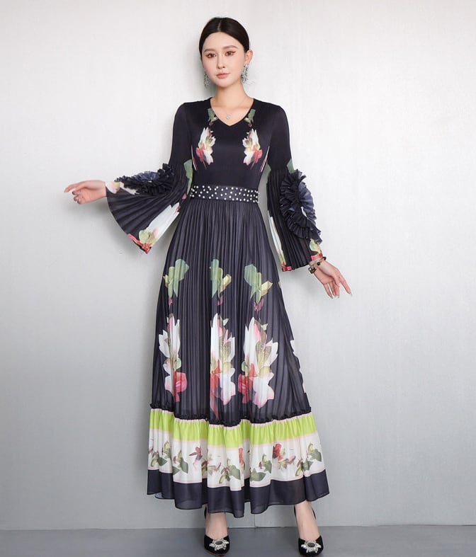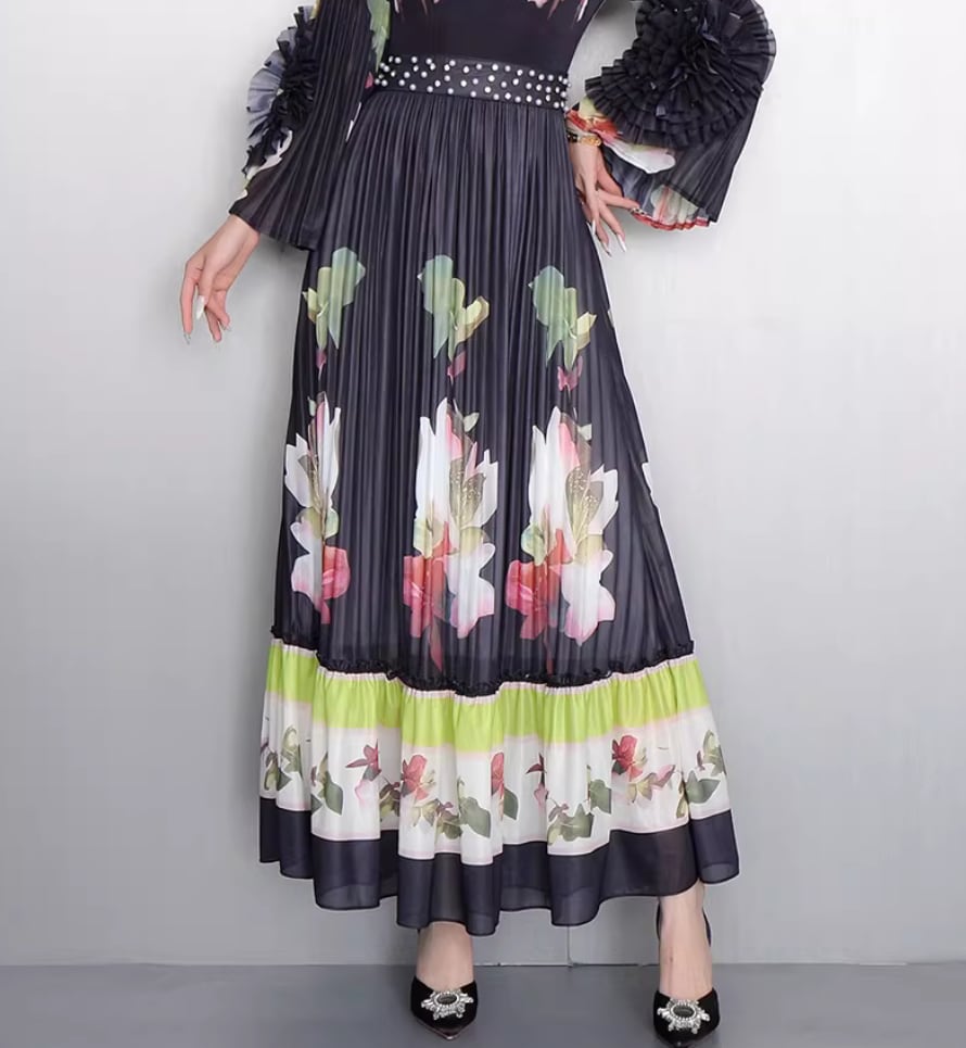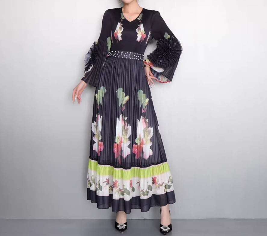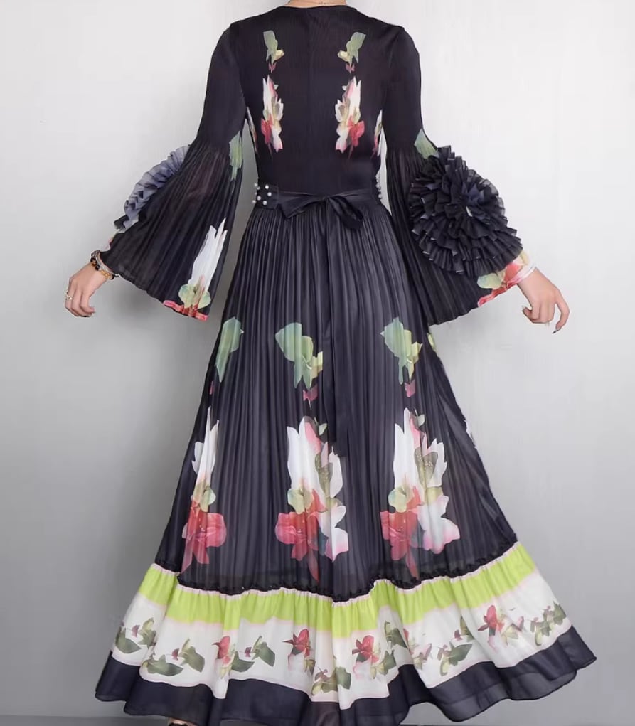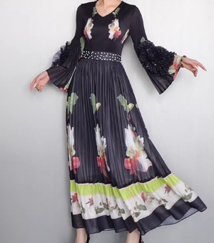 ★【 鮮やかな大輪の花々がドラマティックに映える、最高にエレガントなプリーツロングワンピースです。