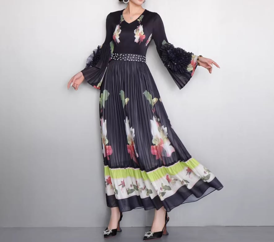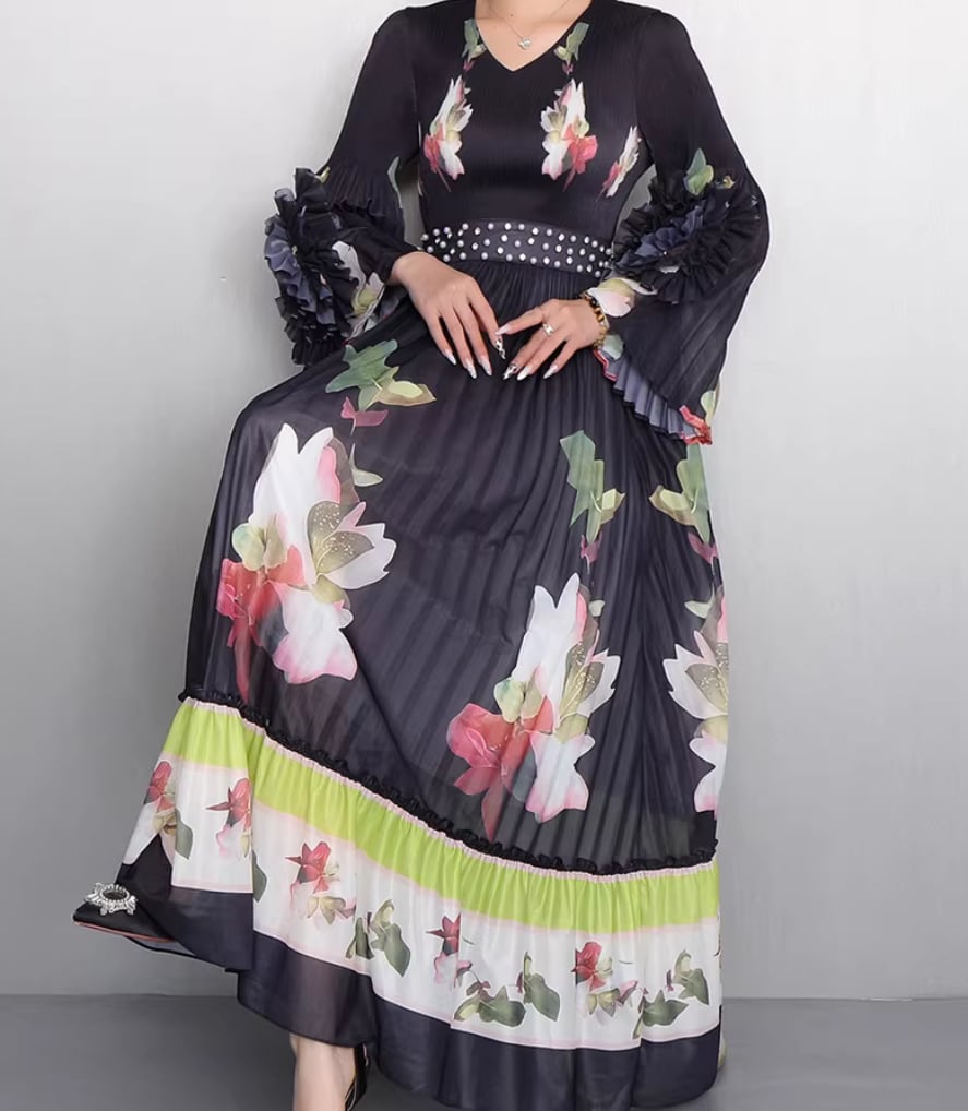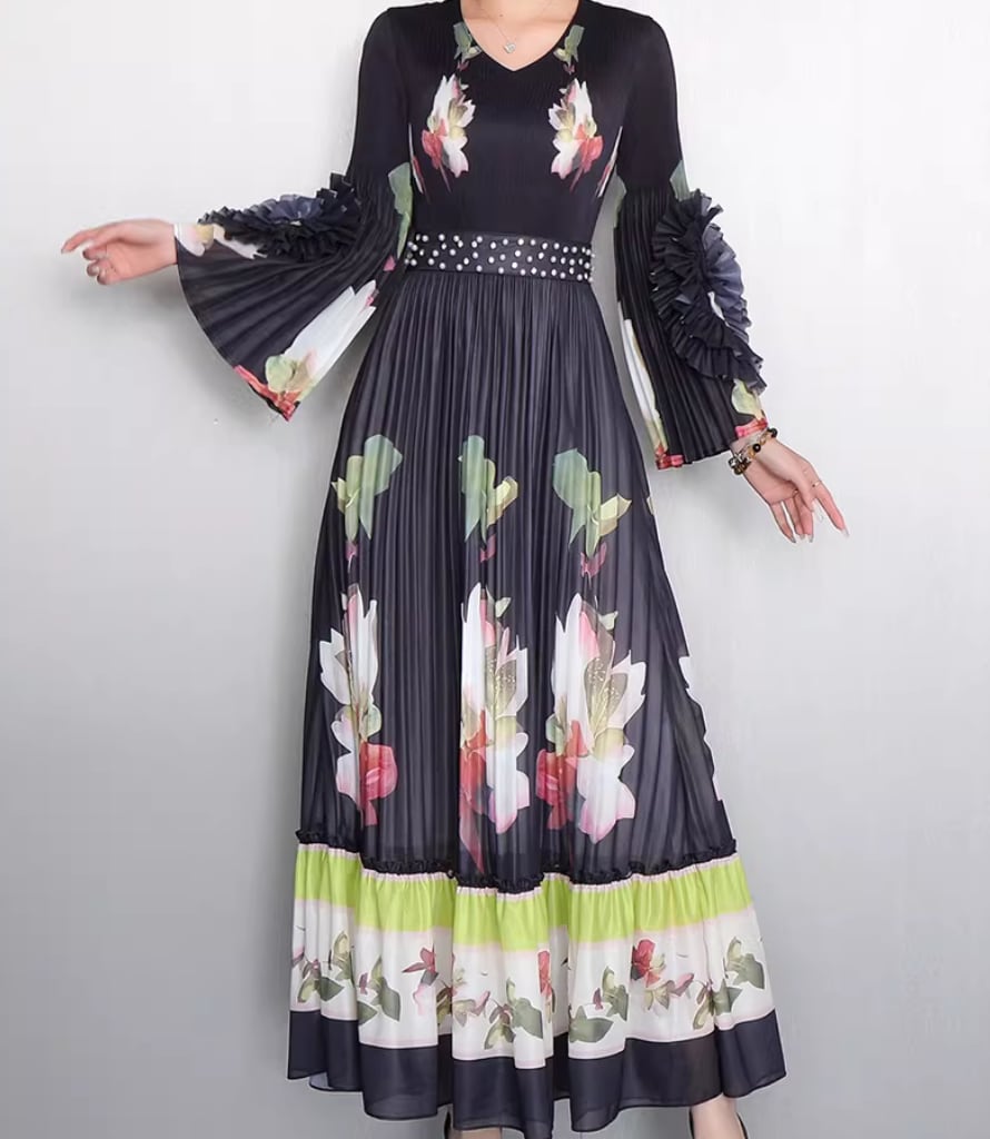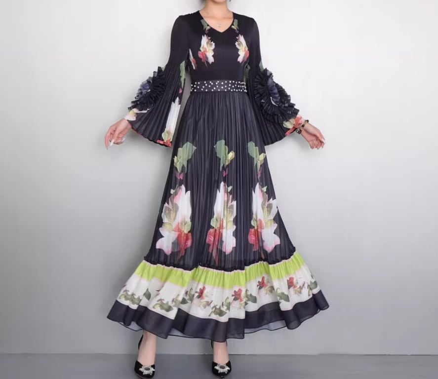 ★【 鮮やかな大輪の花々がドラマティックに映える、最高にエレガントなプリーツロングワンピースです。