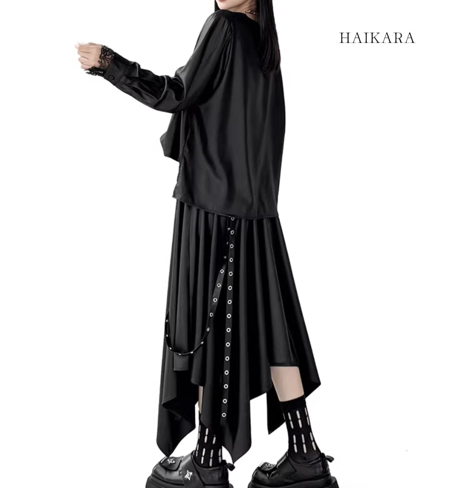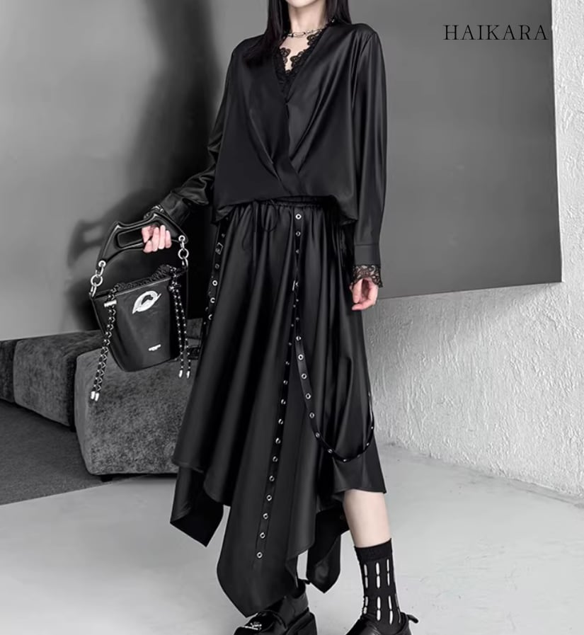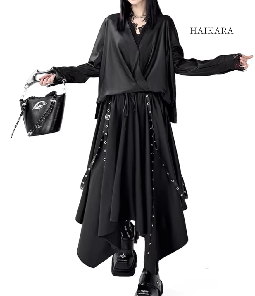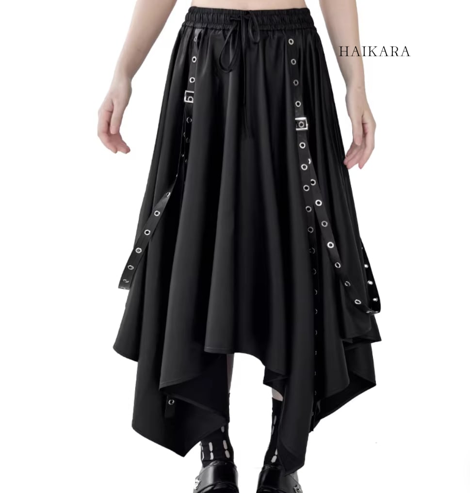 ★【 サイドボタンがアクセントになったルーズトップスと、アイレット付きの長いストラップが目を惹くスカートの、エッジィなセットアップです。