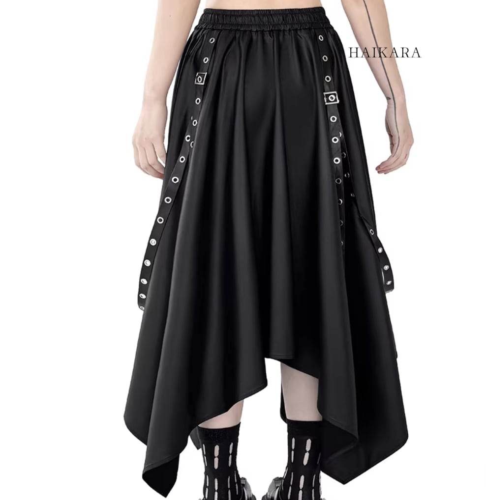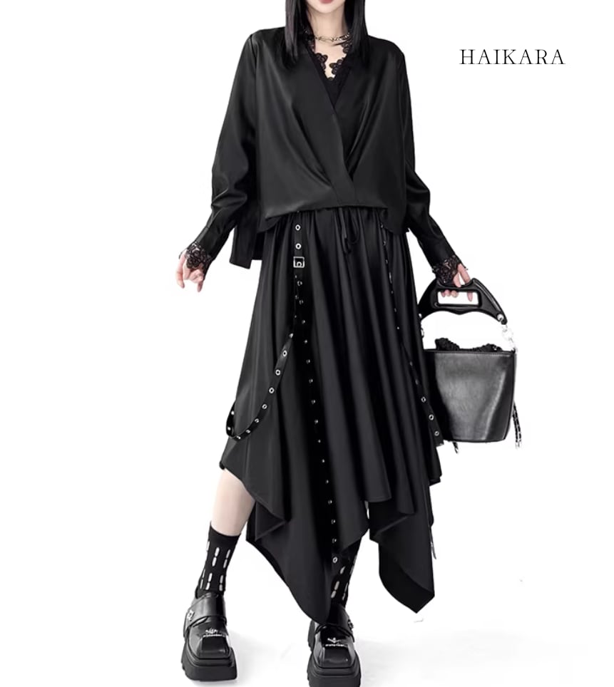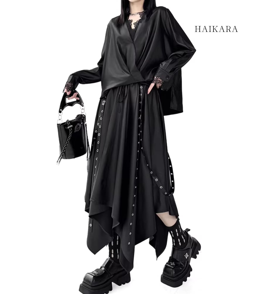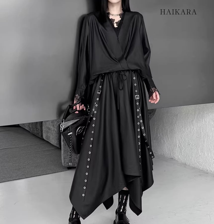 ★【 サイドボタンがアクセントになったルーズトップスと、アイレット付きの長いストラップが目を惹くスカートの、エッジィなセットアップです。