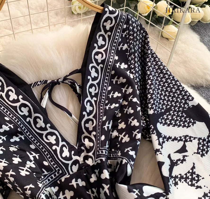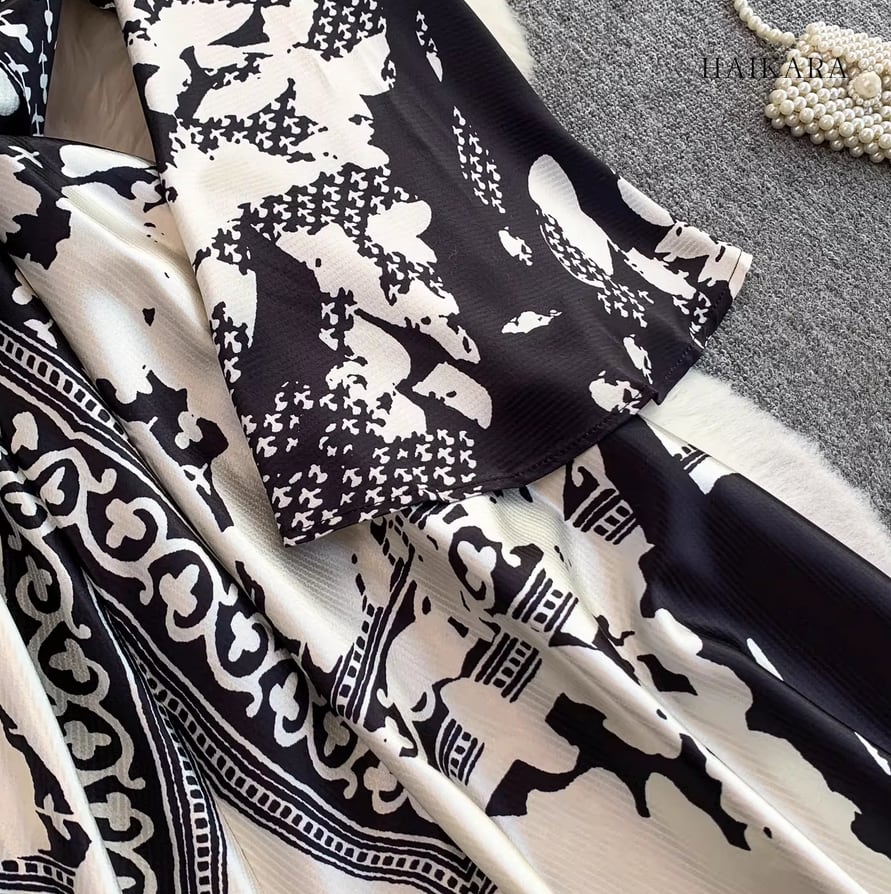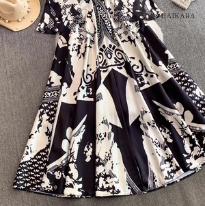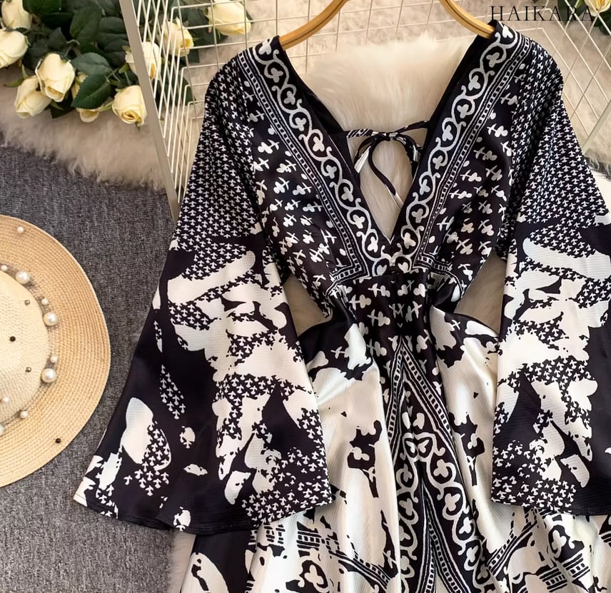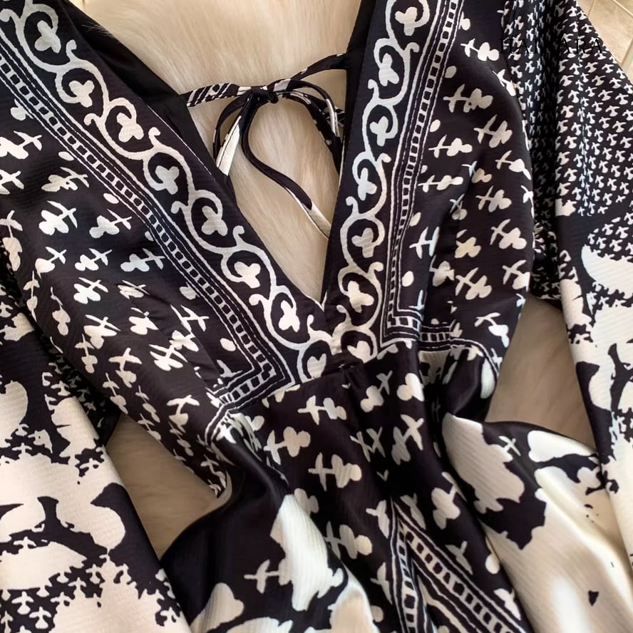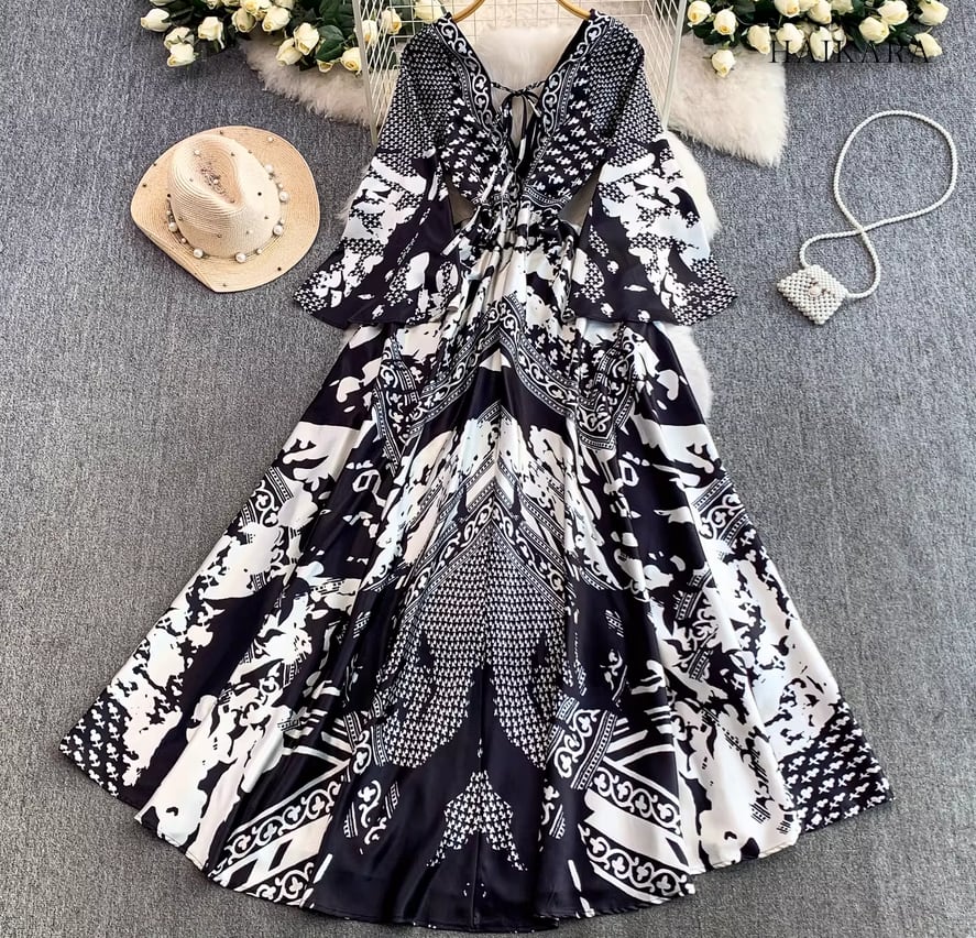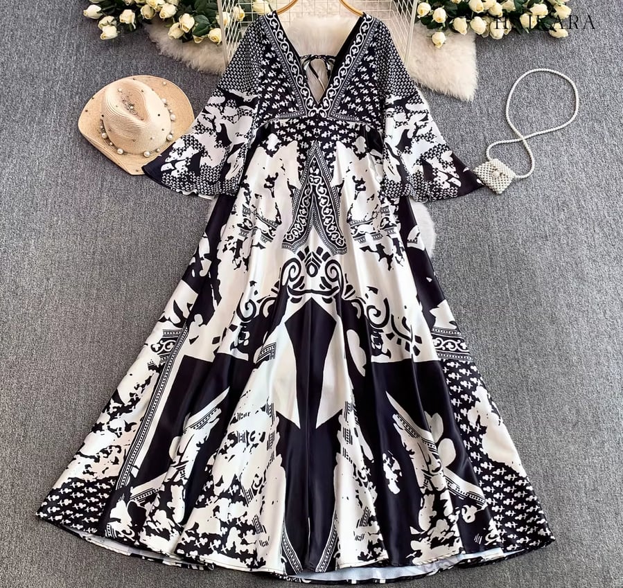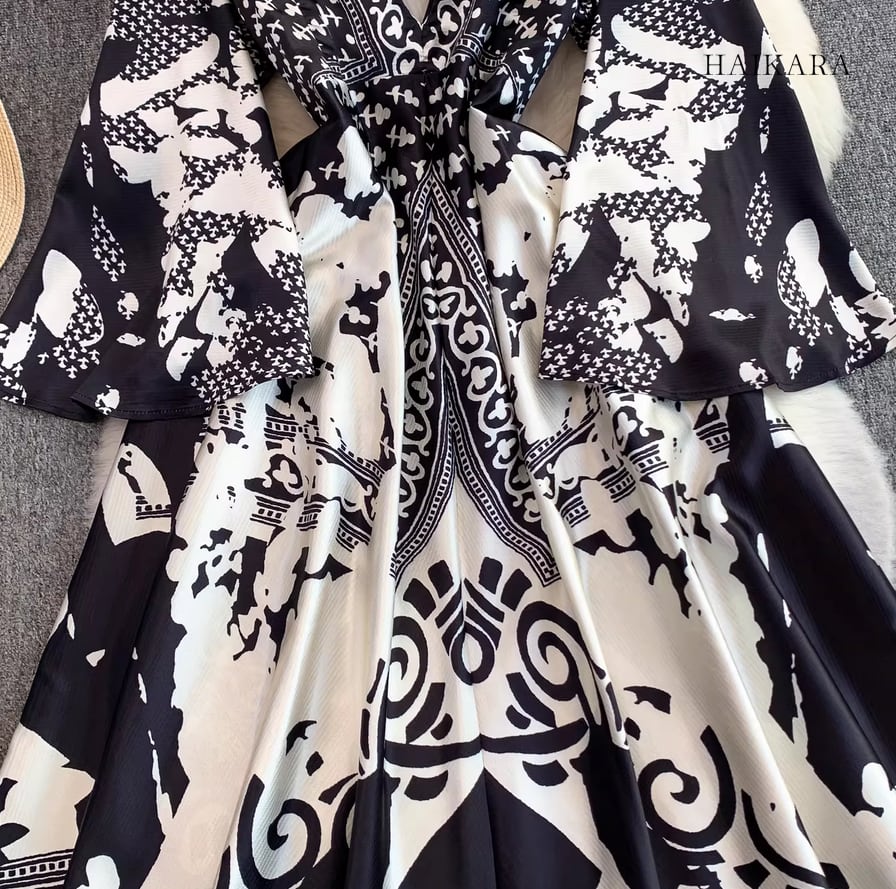 モノトーンパターン・Vネック・フレアスリーブ・ロングドレス