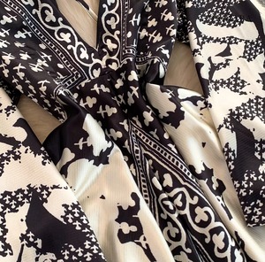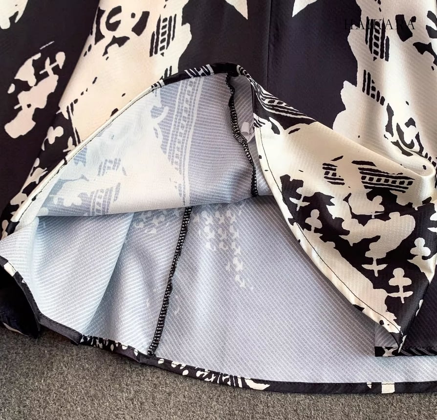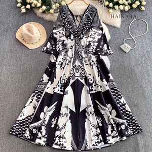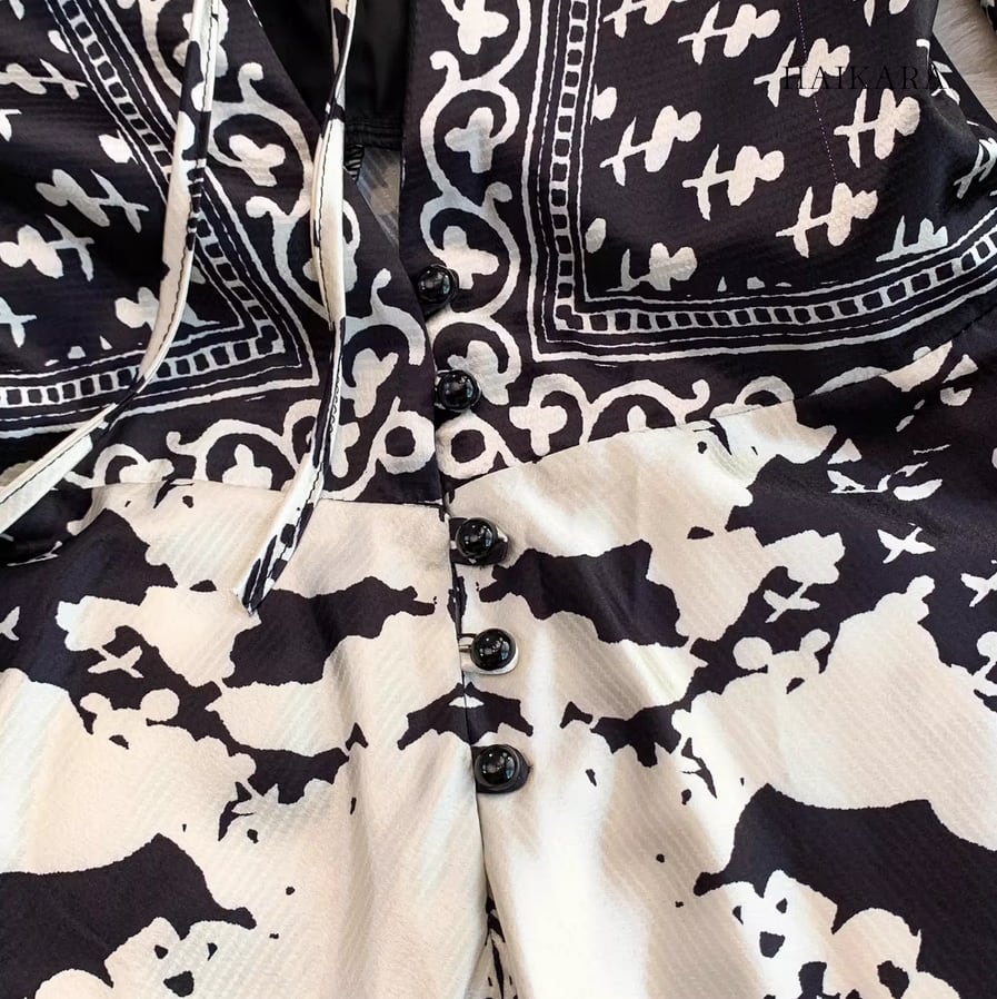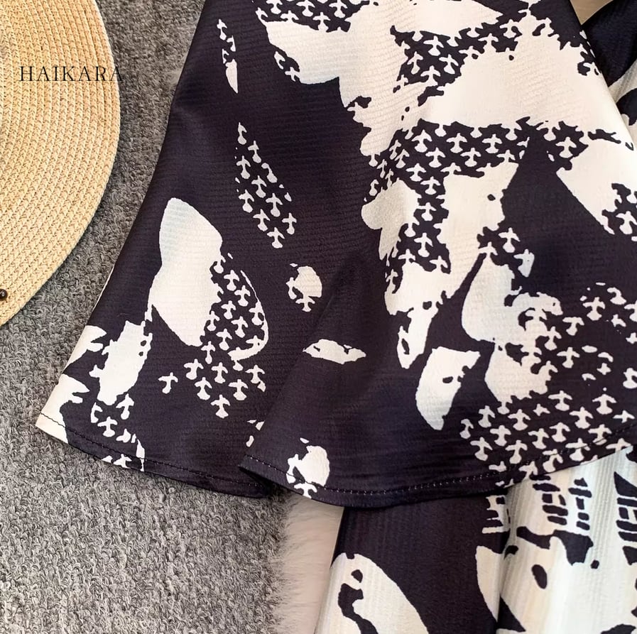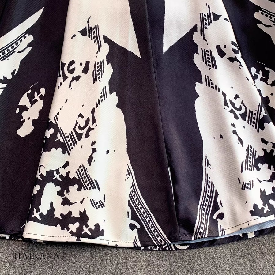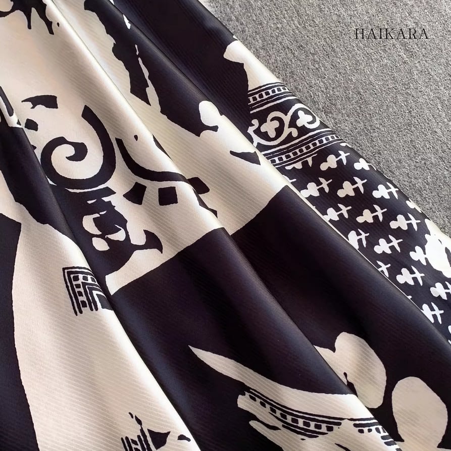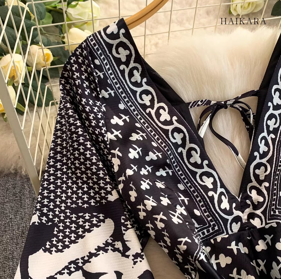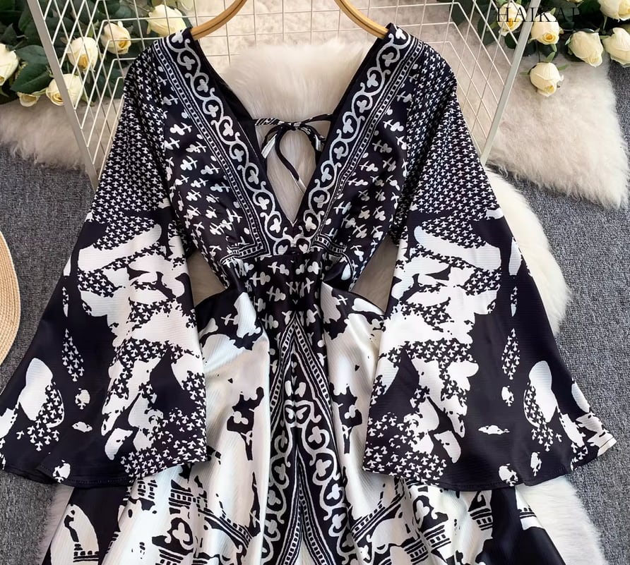 モノトーンパターン・Vネック・フレアスリーブ・ロングドレス