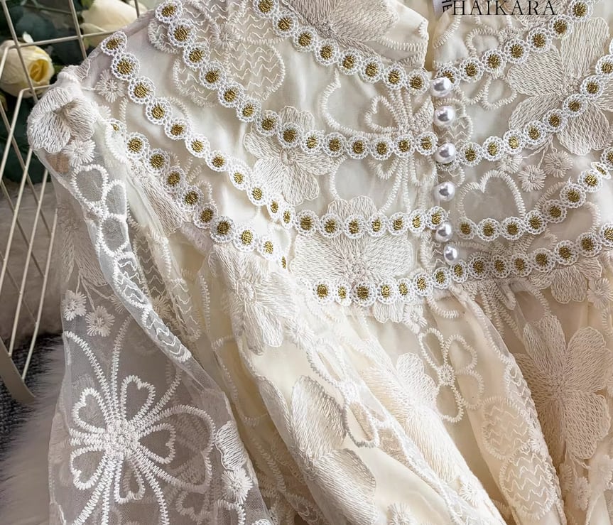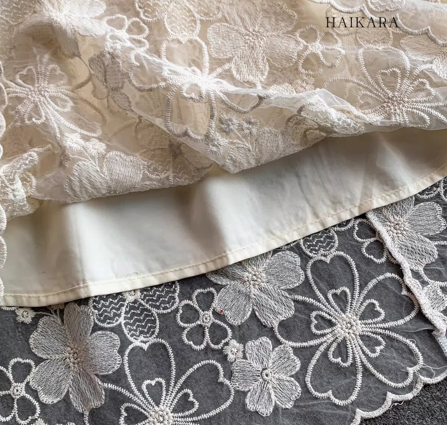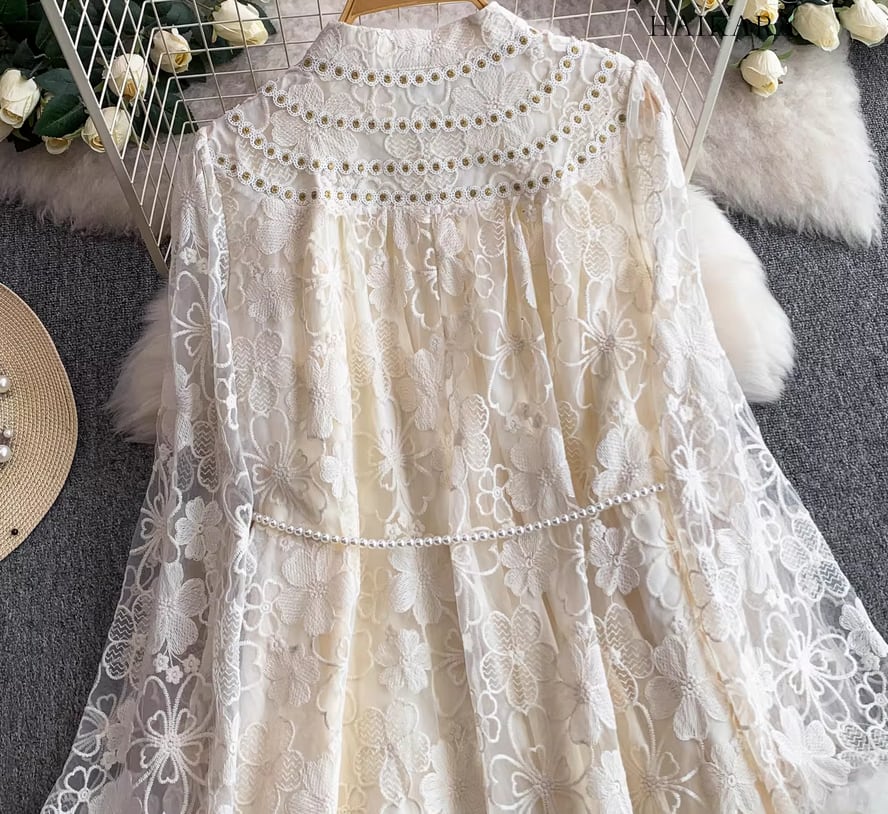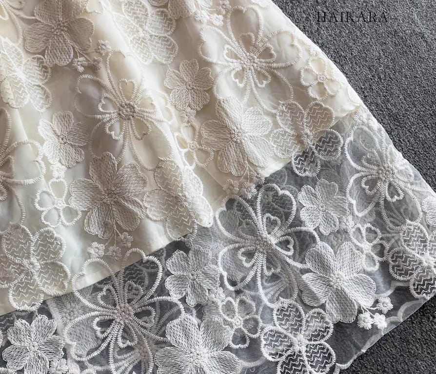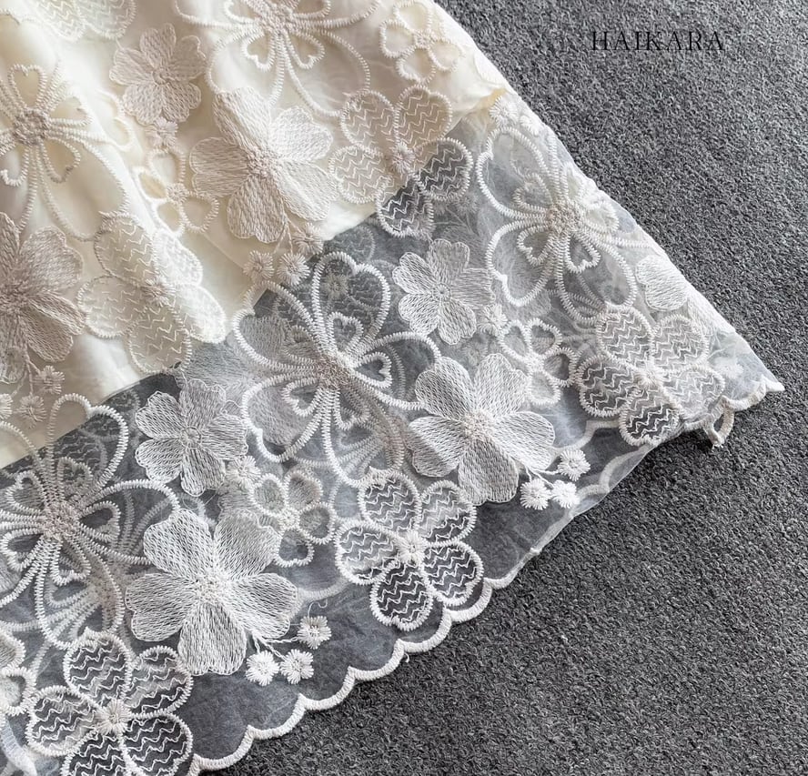 裾の透かし彫りデザインが足元に軽やかな抜け感を生み出し、パーティーシーンや特別な日のお出かけにふさわしい、圧倒的な気品を放つ主役級の一着です。 】