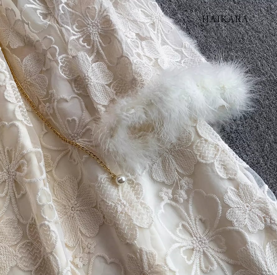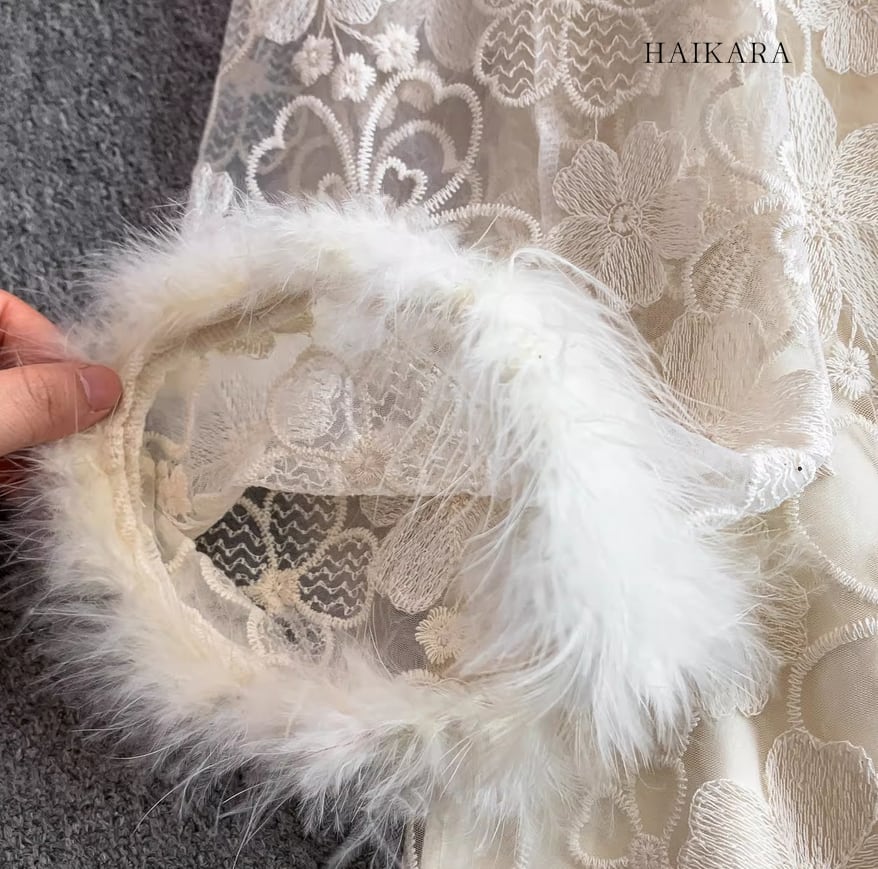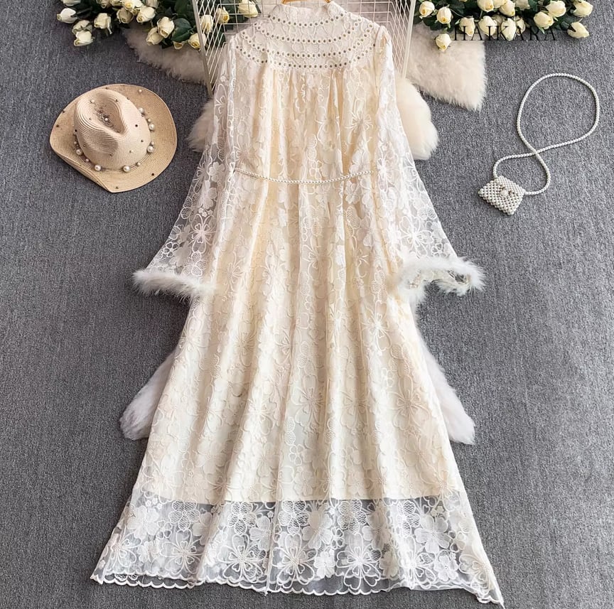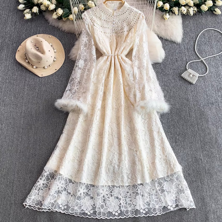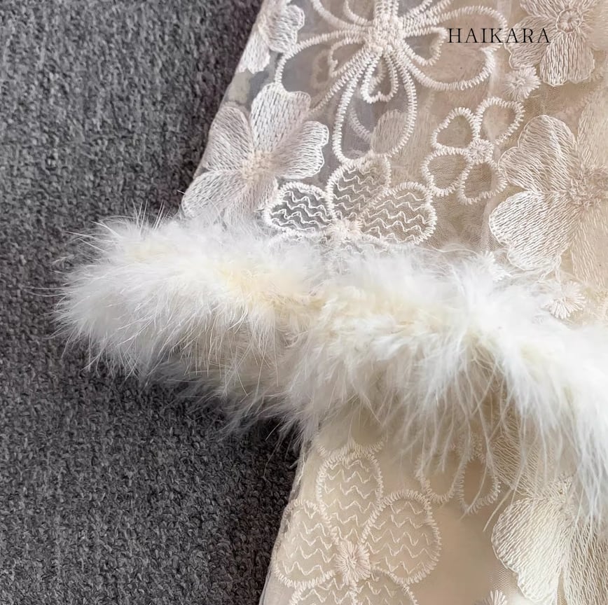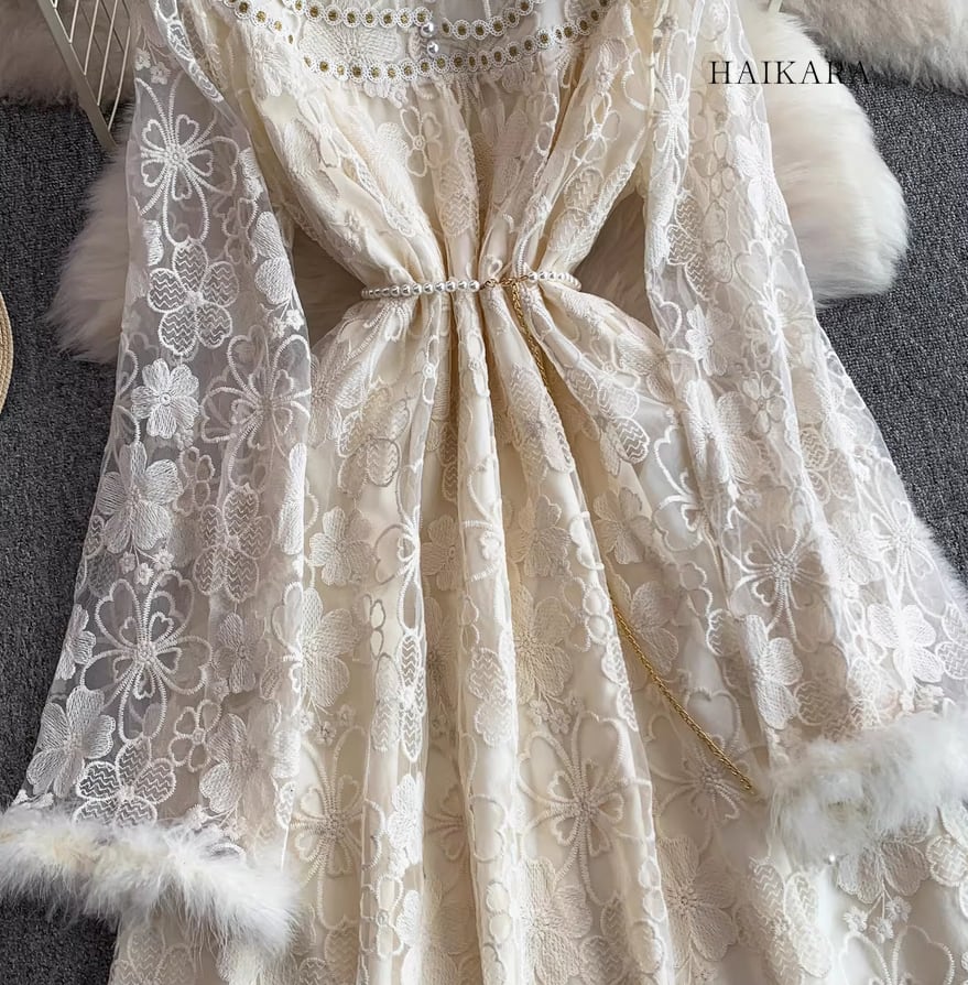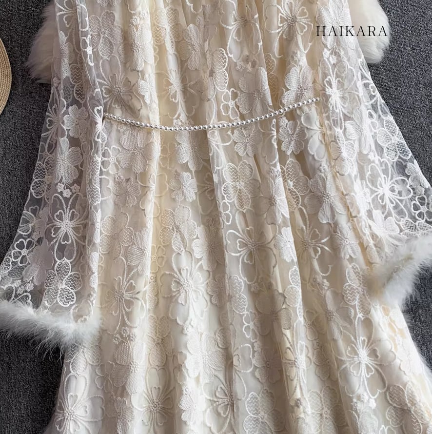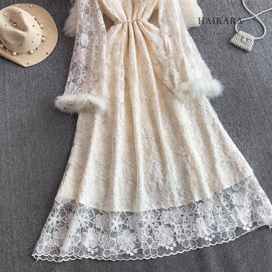 ★【 繊細なフラワーレースを全身に纏い、袖口の柔らかなフェイクファーがドラマティックな華やぎを添えるロングドレスです。