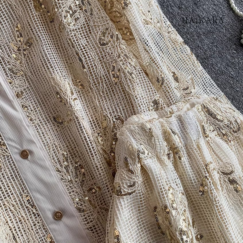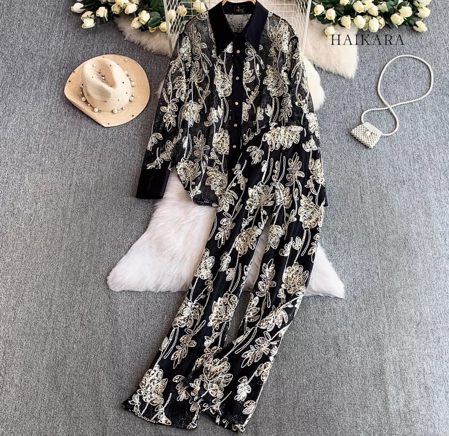 ★【 透け感のある軽やかなメッシュ生地に、ゴールドのスパンコールで描かれた大ぶりなフラワーモチーフがドラマティックに輝くセットアップです。