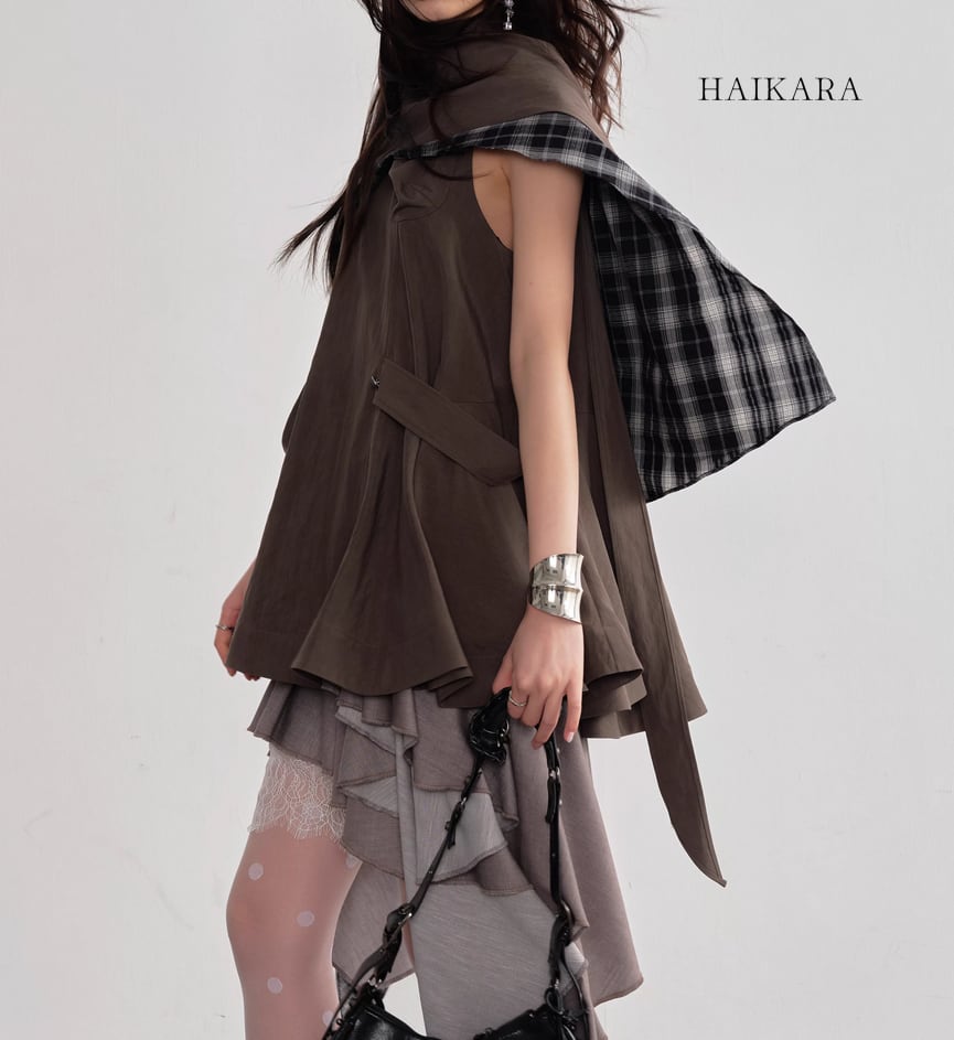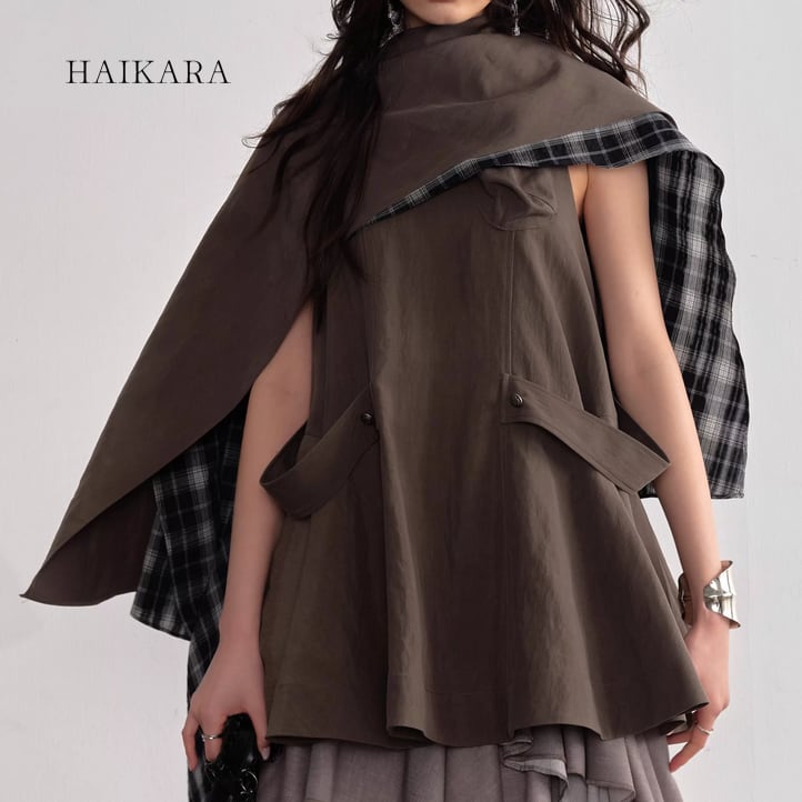 ★【 深みのあるアースカラーの生地に、チェック柄の裏地を配したショールがドラマティックなアクセントを添えるノースリーブトップスです。