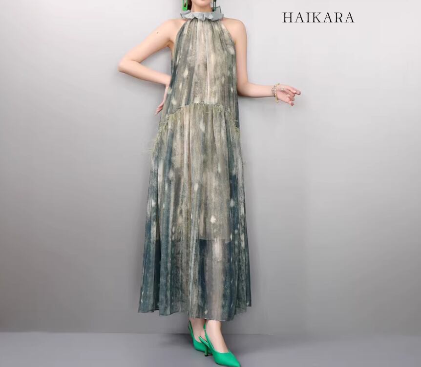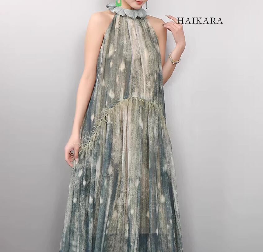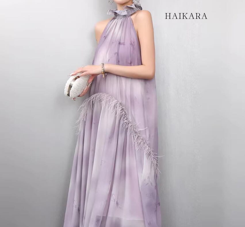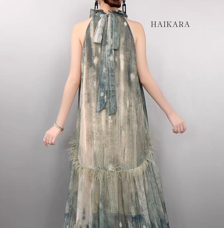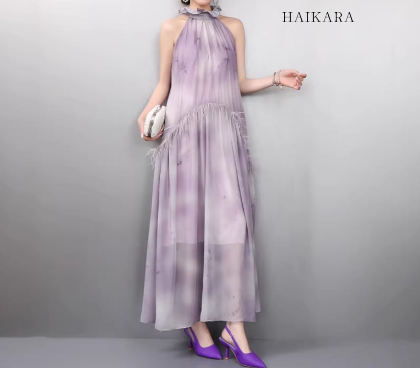 首元を上品に彩るホルターネックと、腰の切り替え部分にあしらわれた繊細なフェザー調のディテールが、圧倒的な気品と個性を演出します。