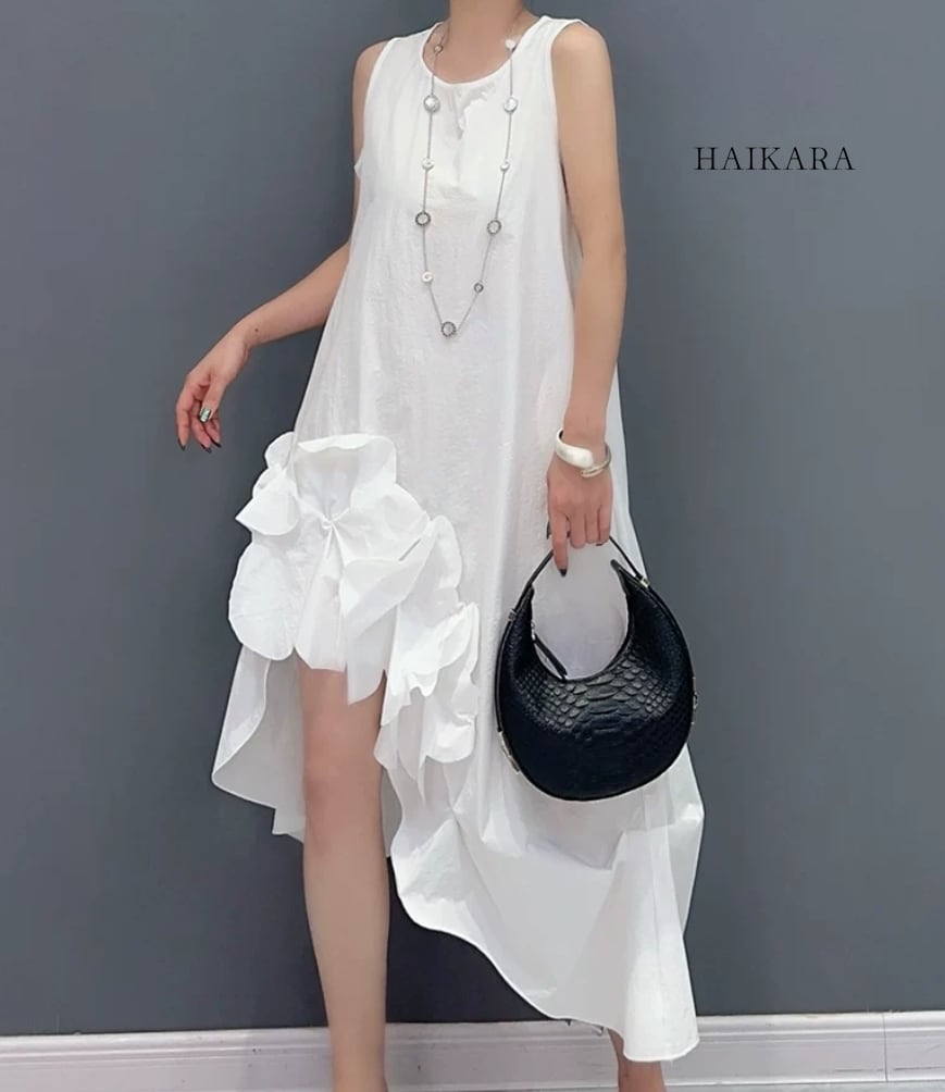 3Dフラワーモチーフ アシンメトリー ノースリーブワンピース
