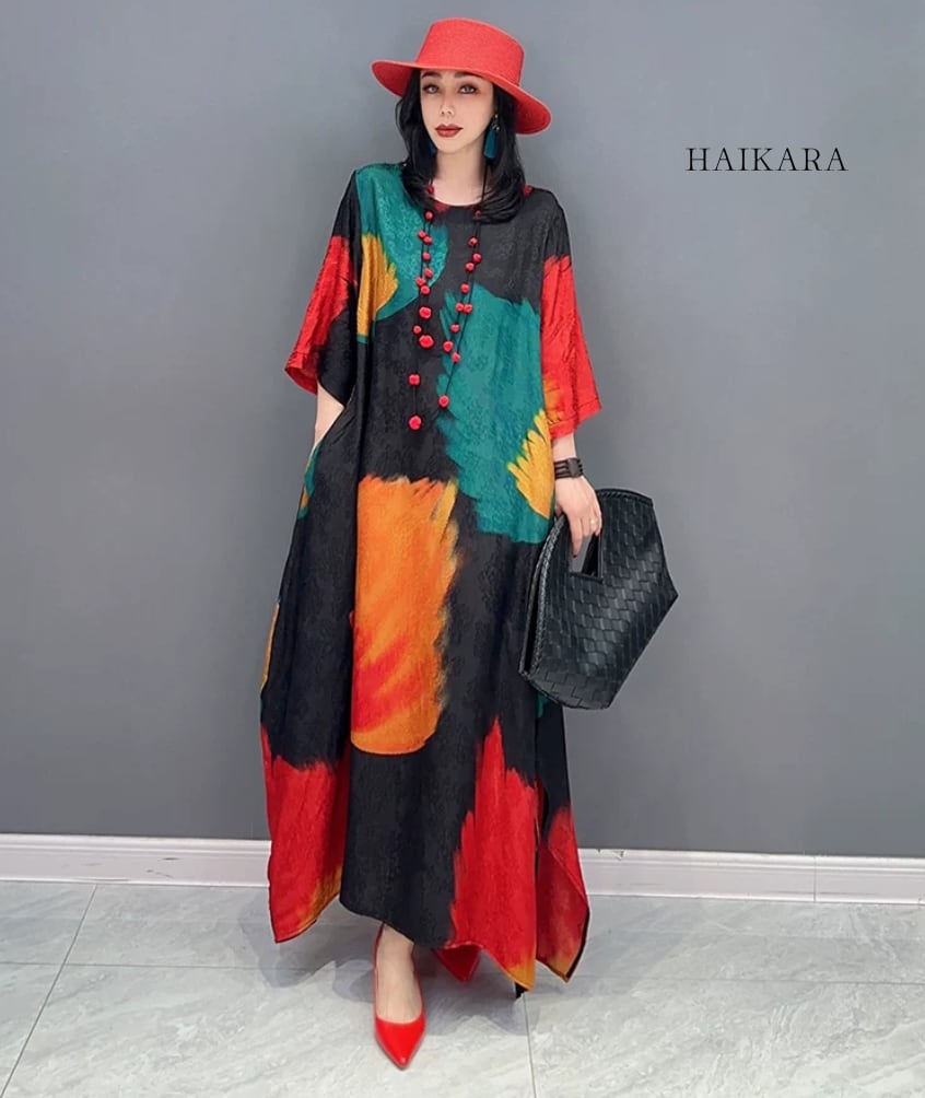 ★【 黒地に鮮やかなレッドやグリーンのペイントデザインが映える、アーティスティックな雰囲気のマキシワンピースです。