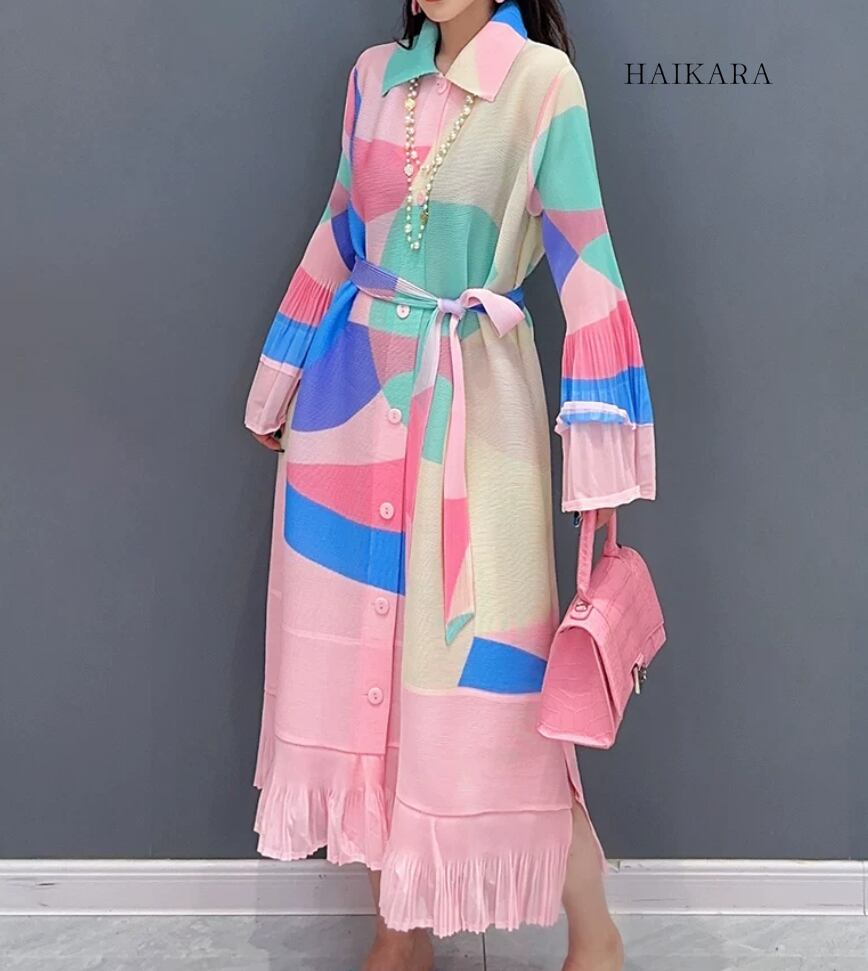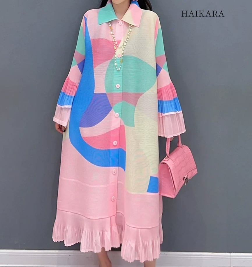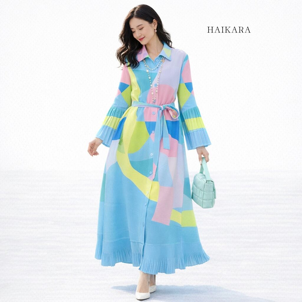 ★【 鮮やかなパステルカラーとダイナミックな幾何学模様が目を引く、アーティスティックなシャツワンピースです。