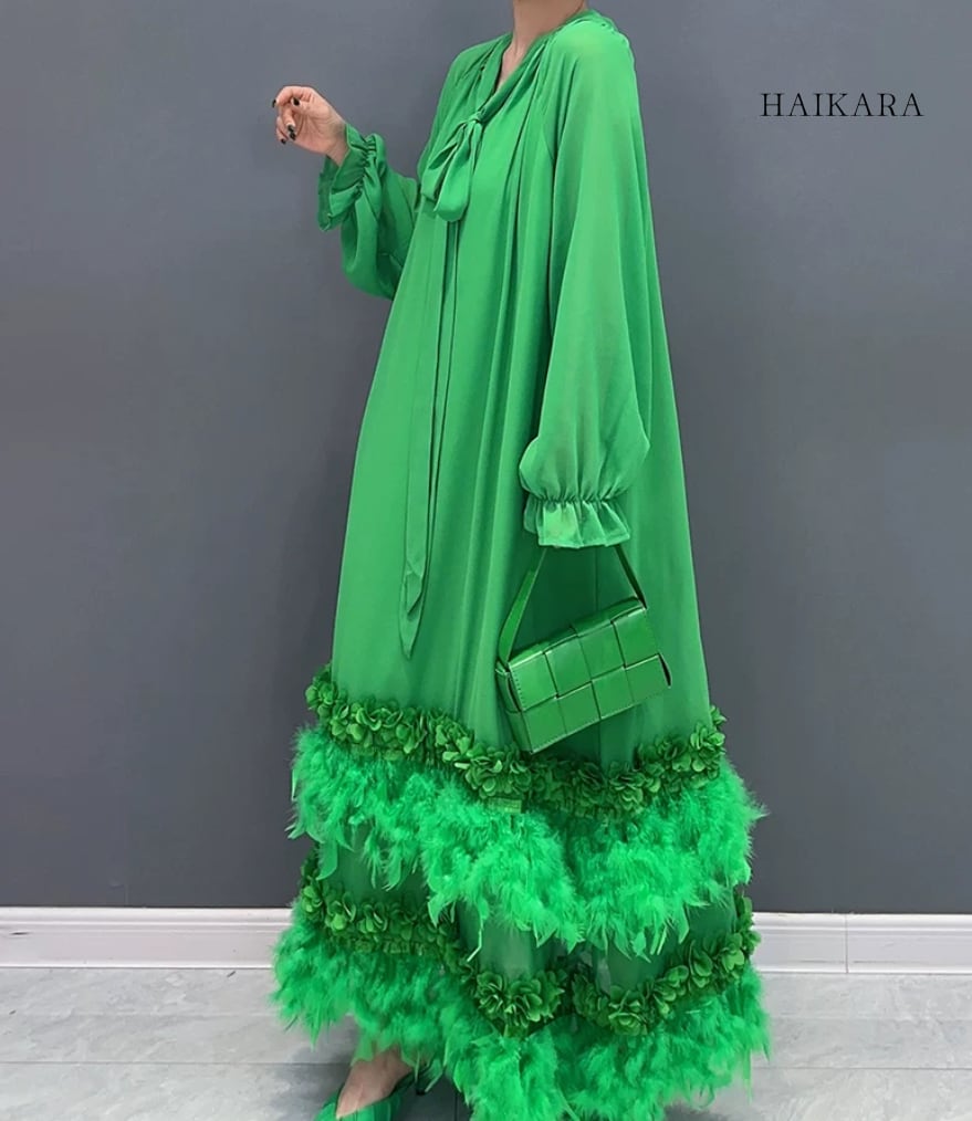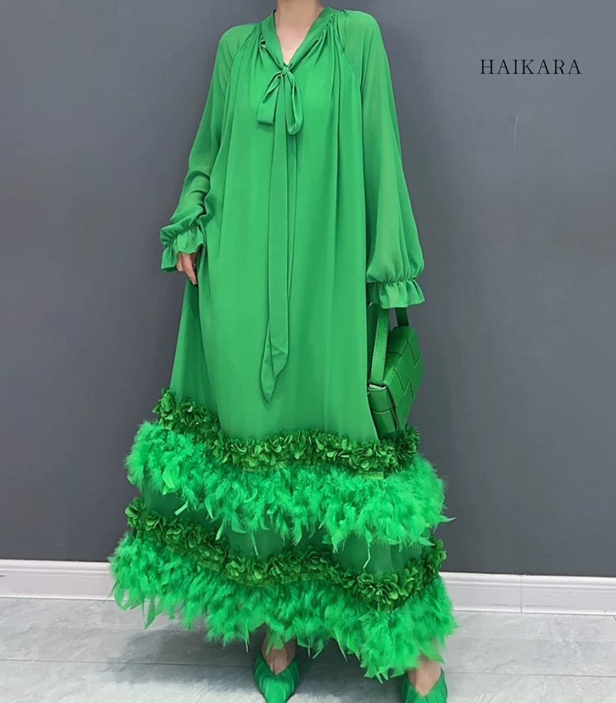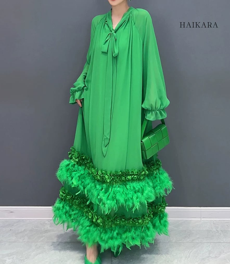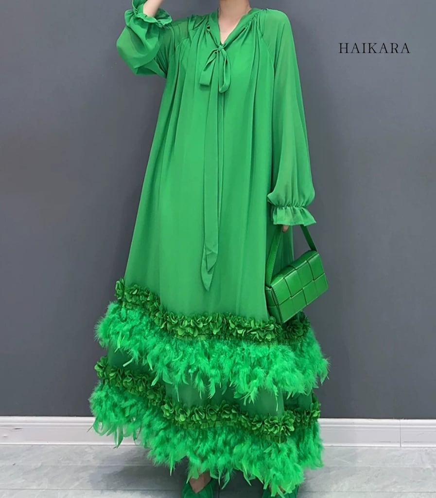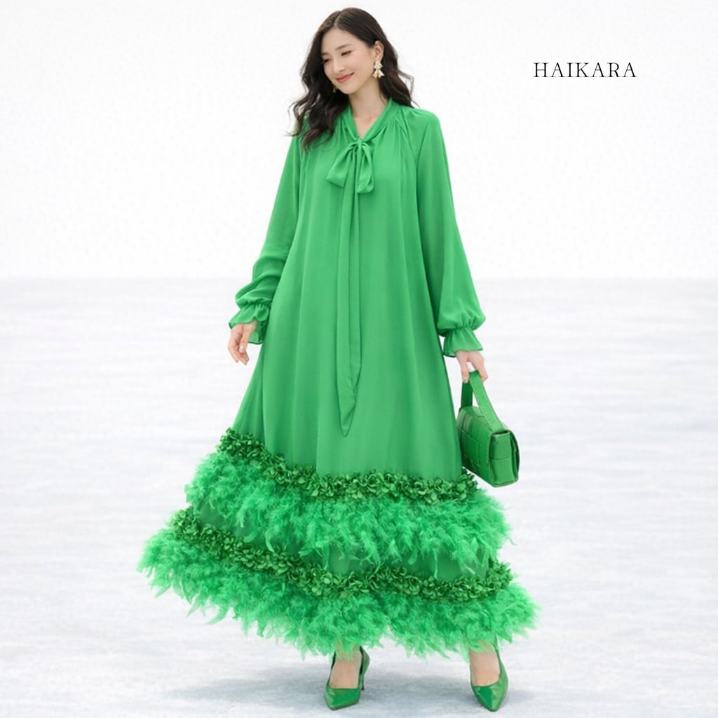 ★【 鮮やかなグリーンが目を引く、裾のデコラティブな装飾が圧倒的な存在感を放つマキシワンピースです。