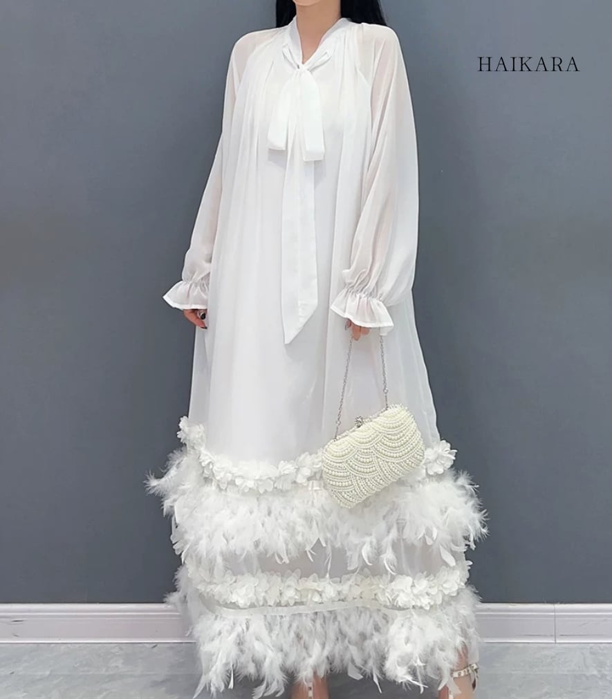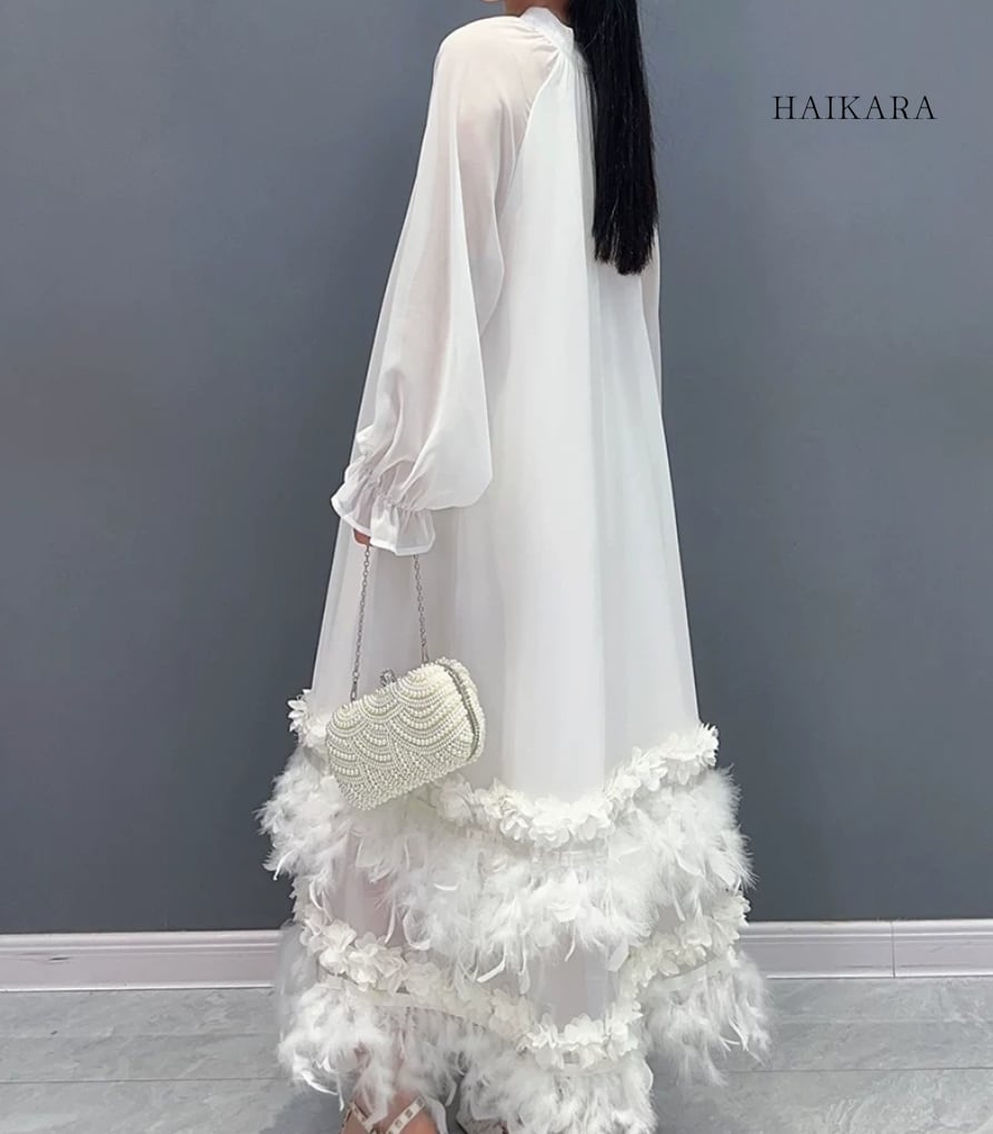 裾部分にはたっぷりのフェザー風フリルをティアード状に配し、歩くたびにドラマティックに揺れるゴージャスな足元を演出。